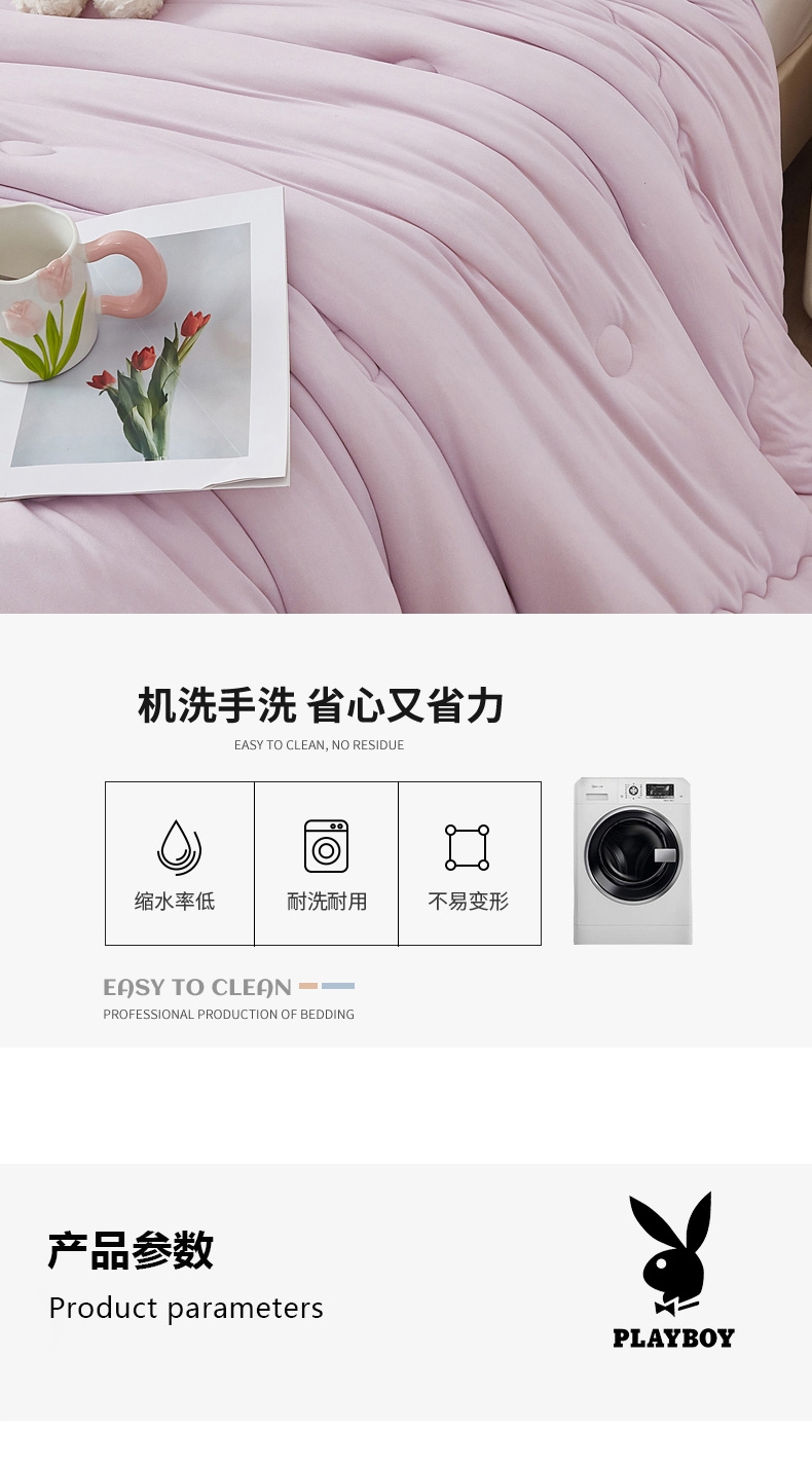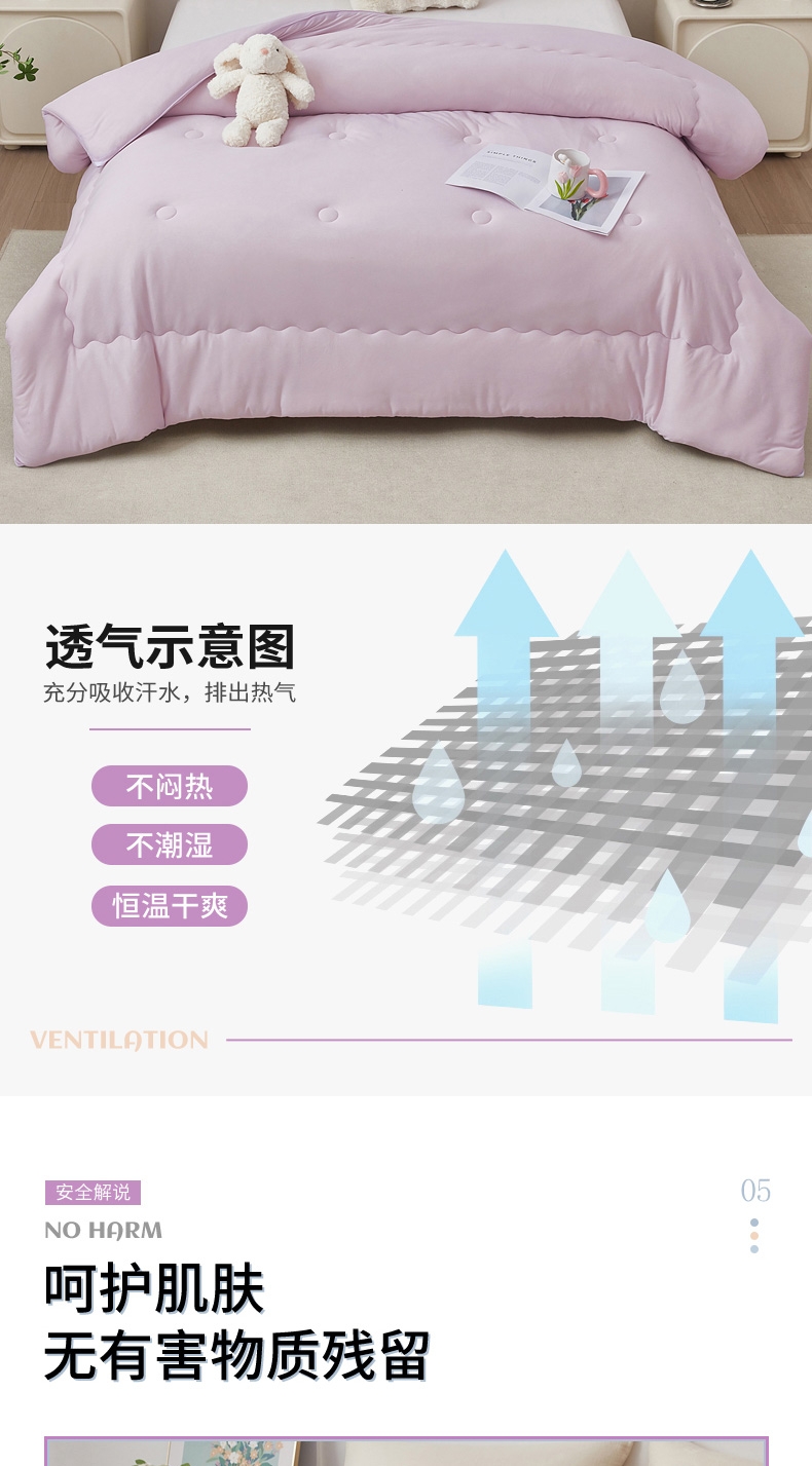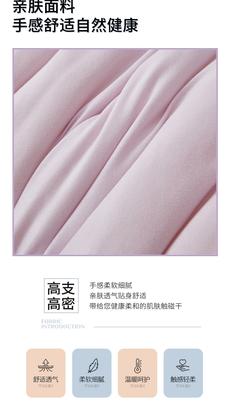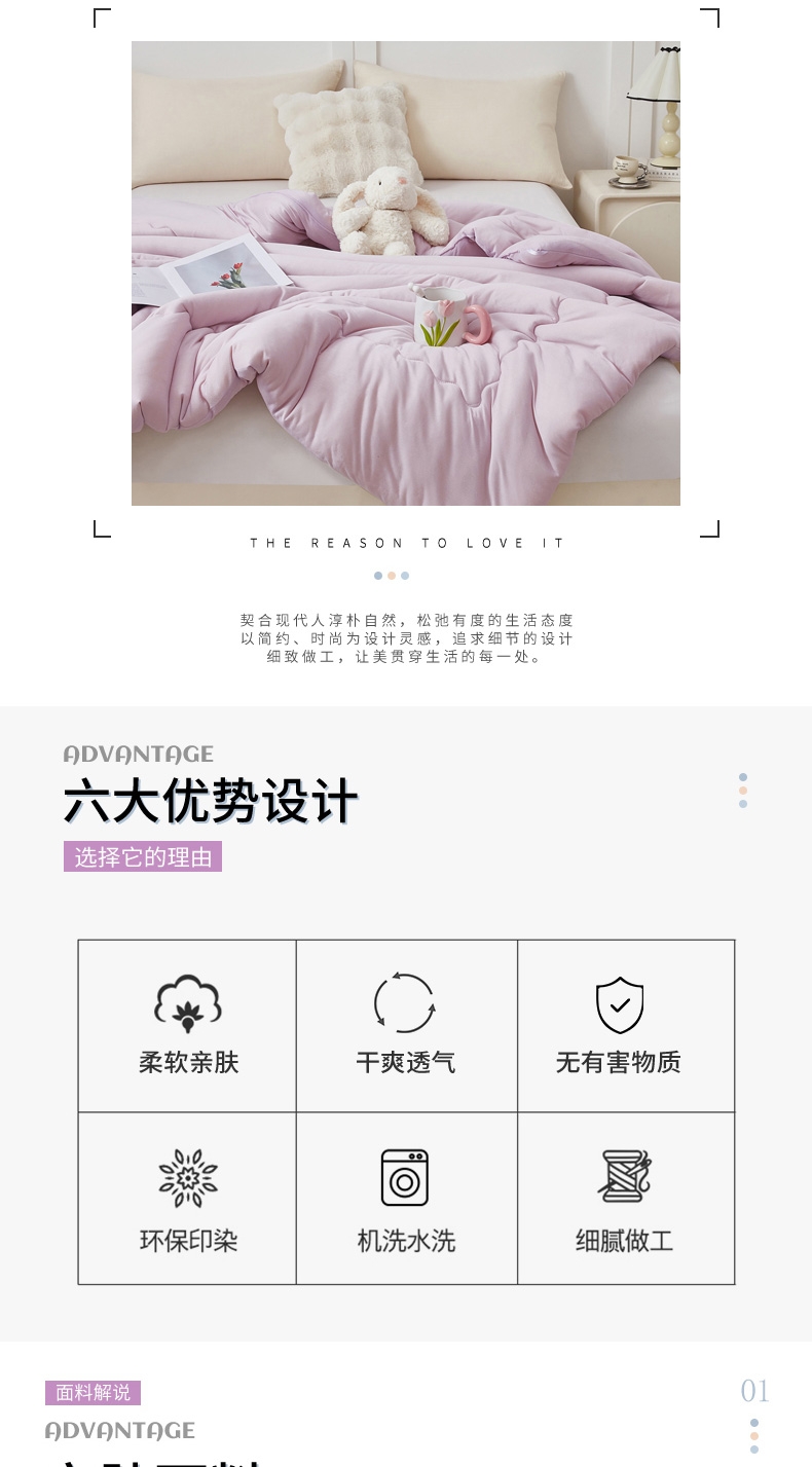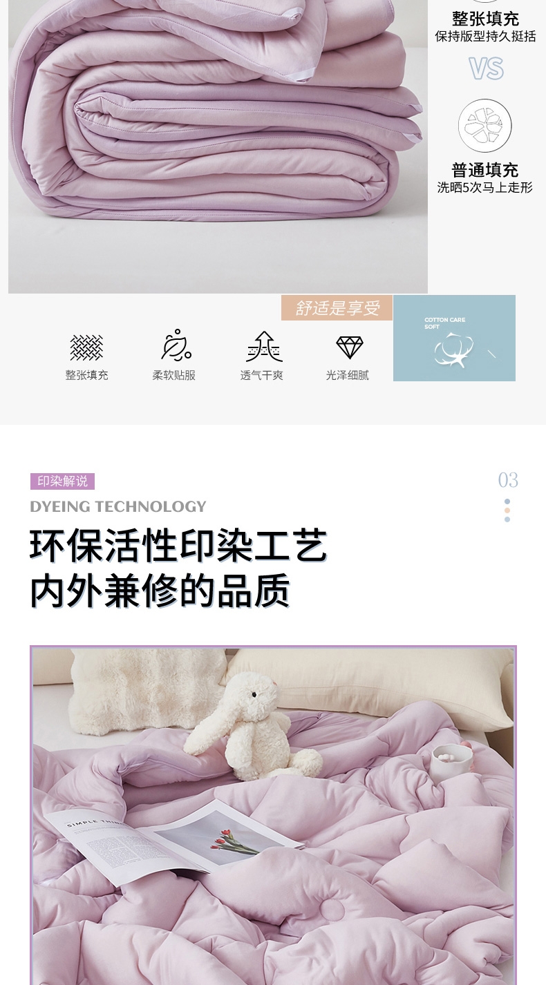 纳米抗菌纤维填充,饱满蓬松,透气好,被芯轻如浮云,;面料采用超柔针织棉材质,温和柔软,裸睡舒适,弹力包;立体绗缝,锁定纤维,不易变形结团,热能储存,蓬松柔