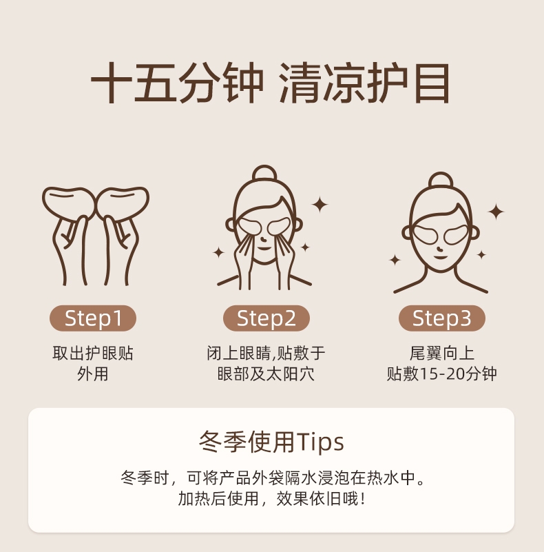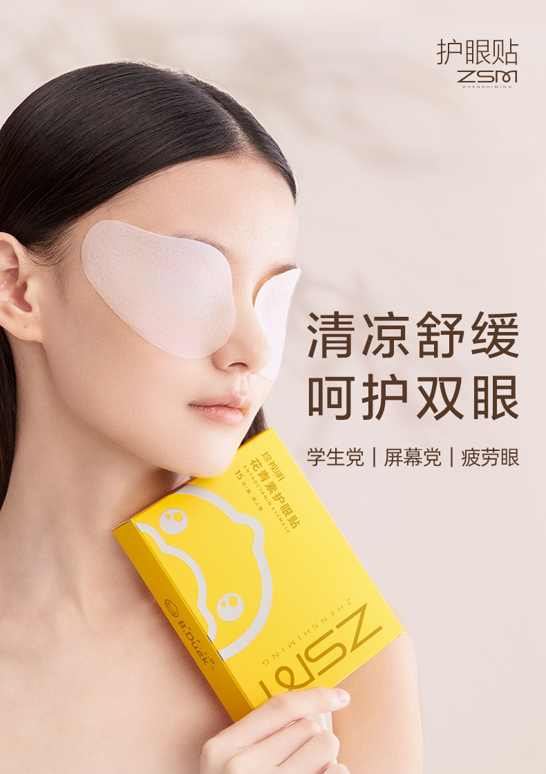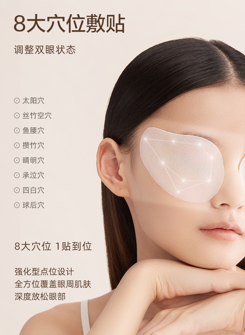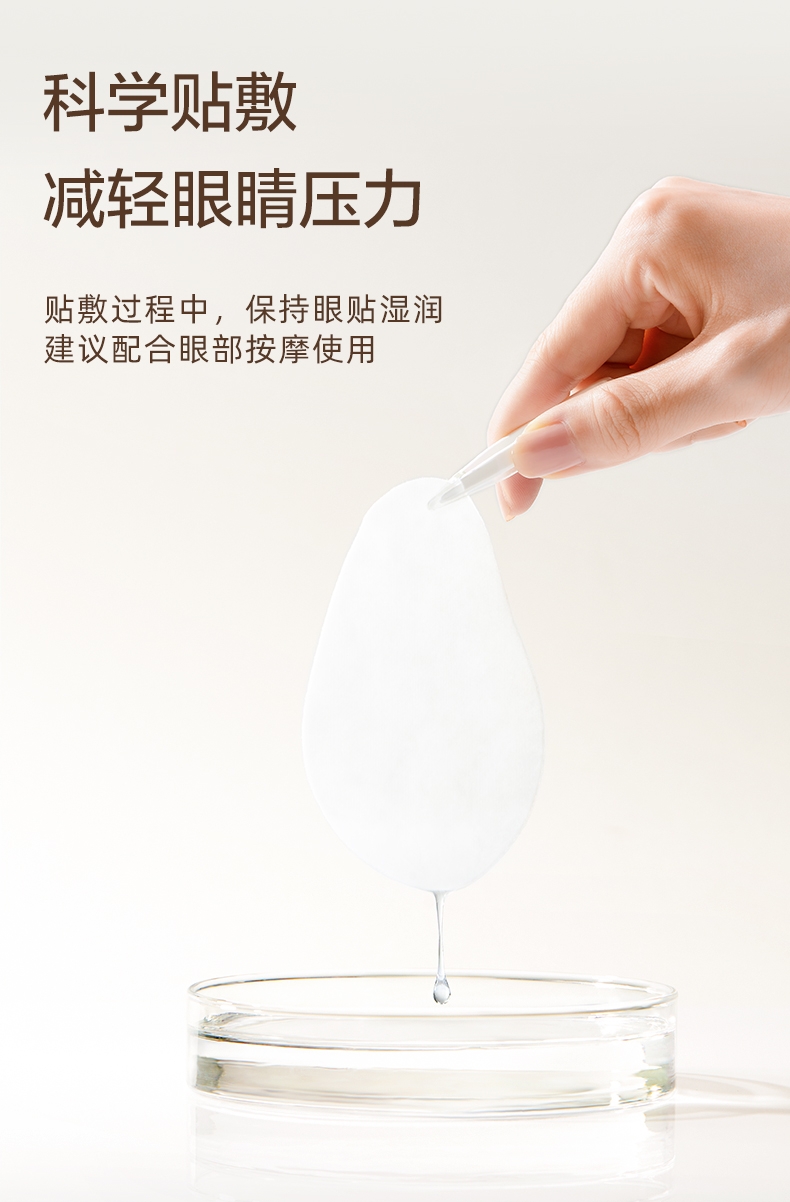 无纺布为载体,用天然冰片、薄荷脑、天然植物提取物;各型挤眼贴分别添加相应植物护目配方;滋润,舒缓 清凉敷贴 养护双眼 清凉护目贴