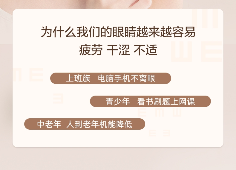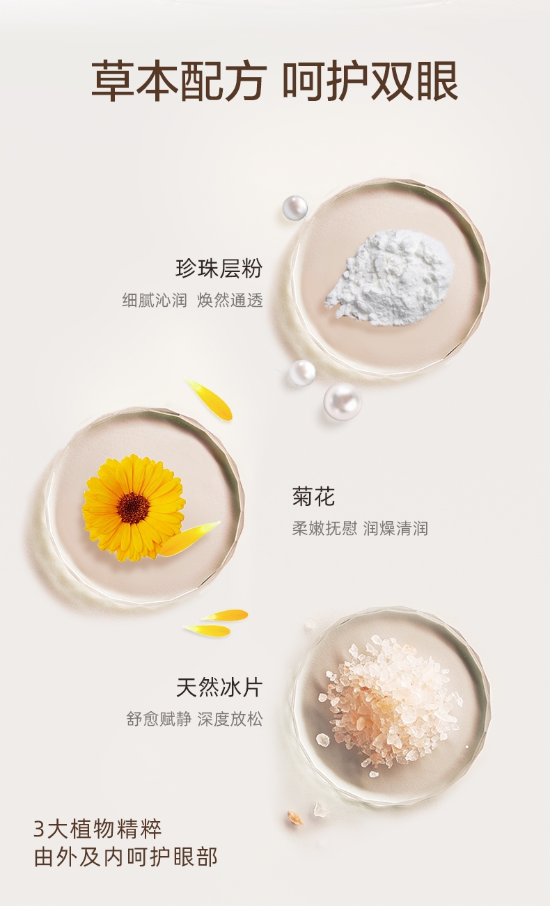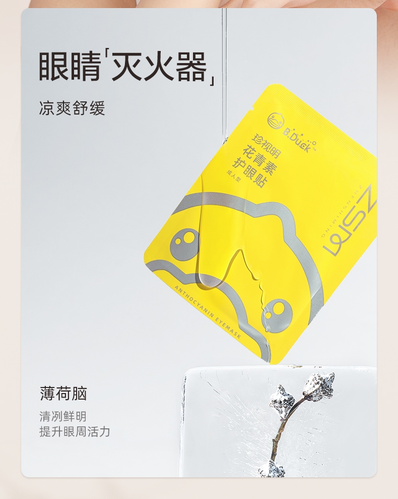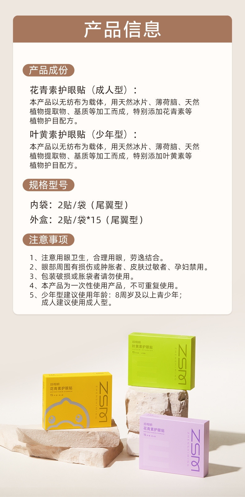 无纺布为载体,用天然冰片、薄荷脑、天然植物提取物;各型挤眼贴分别添加相应植物护目配方;滋润,舒缓 清凉敷贴 养护双眼 清凉护目贴