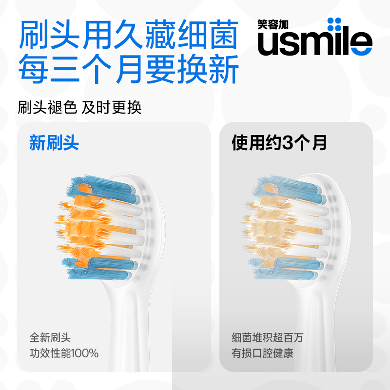 配置清单:电动牙刷手柄*1、刷头*2、防水贴纸*1、扫码卡*1、充电线*1、使用说明书*1