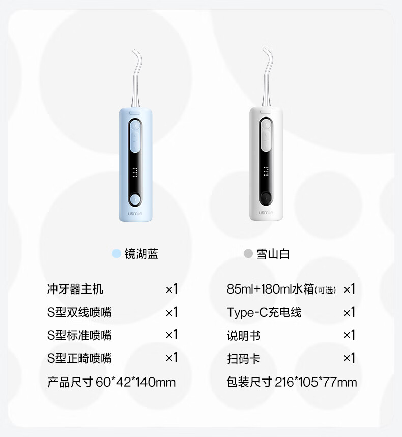 配置清单:冲牙器*1、喷嘴*3、水箱、扫码卡*1、充电线*1、使用说明书*1