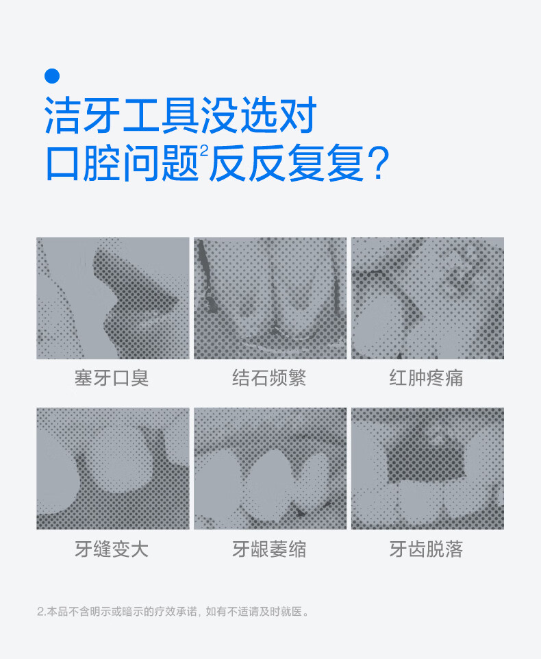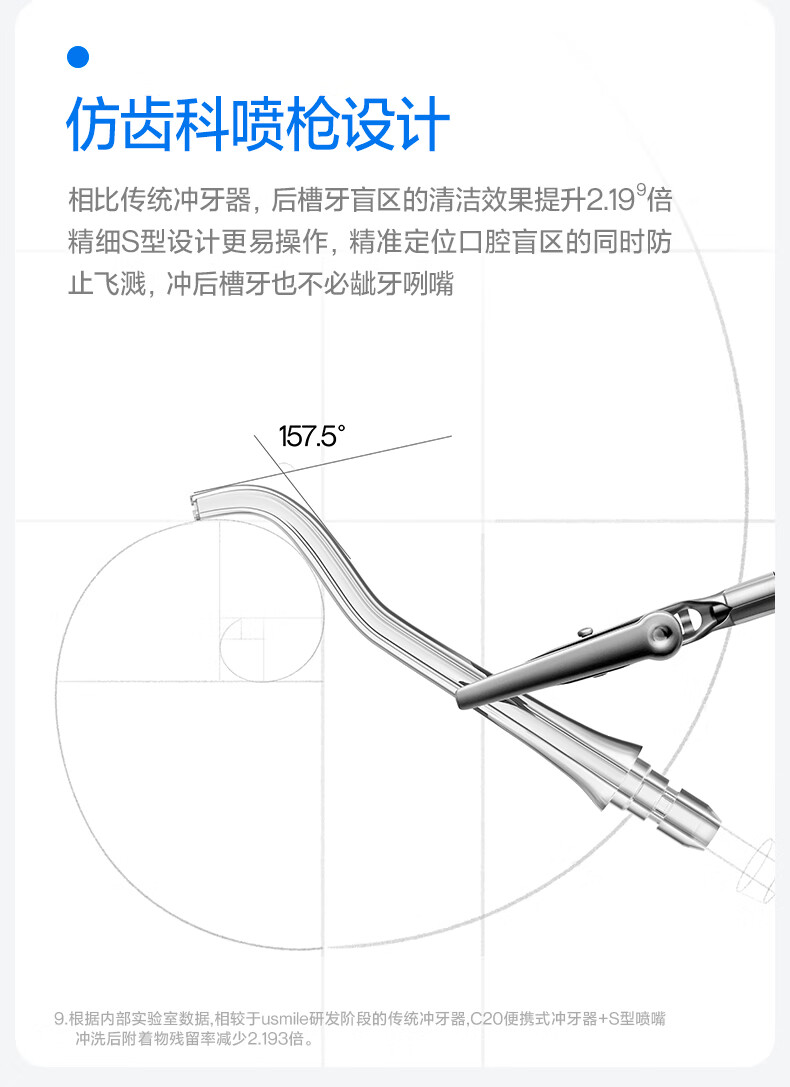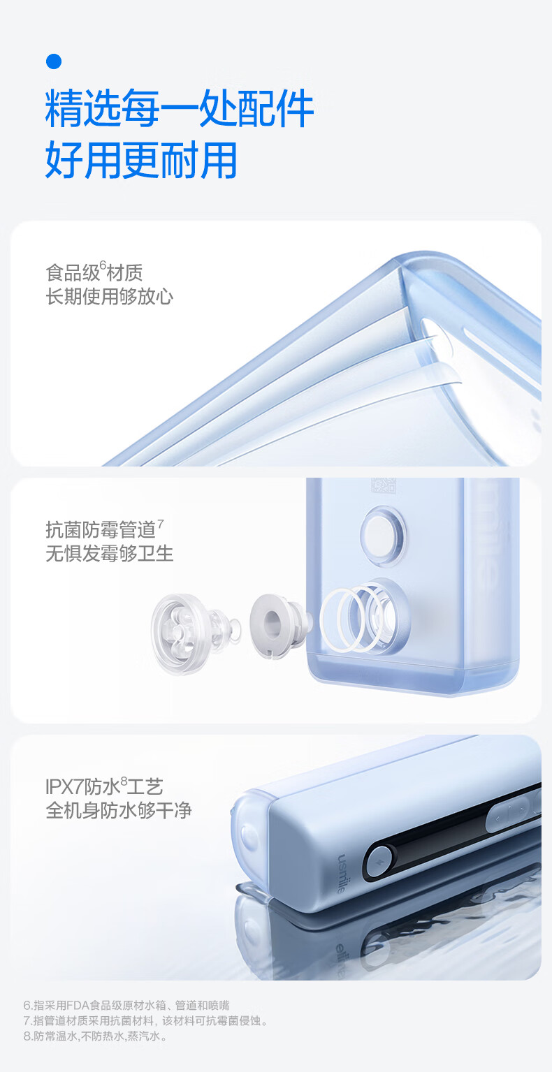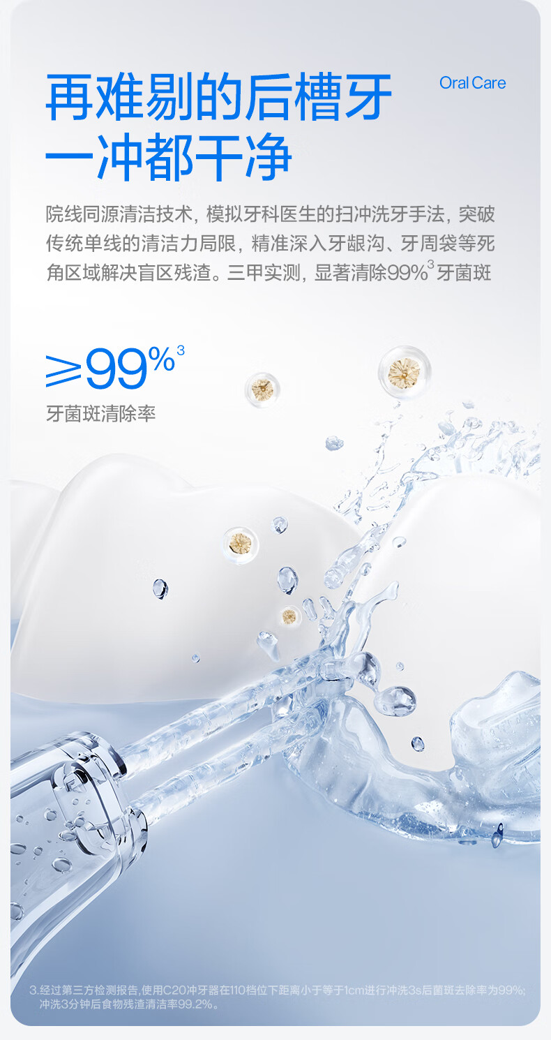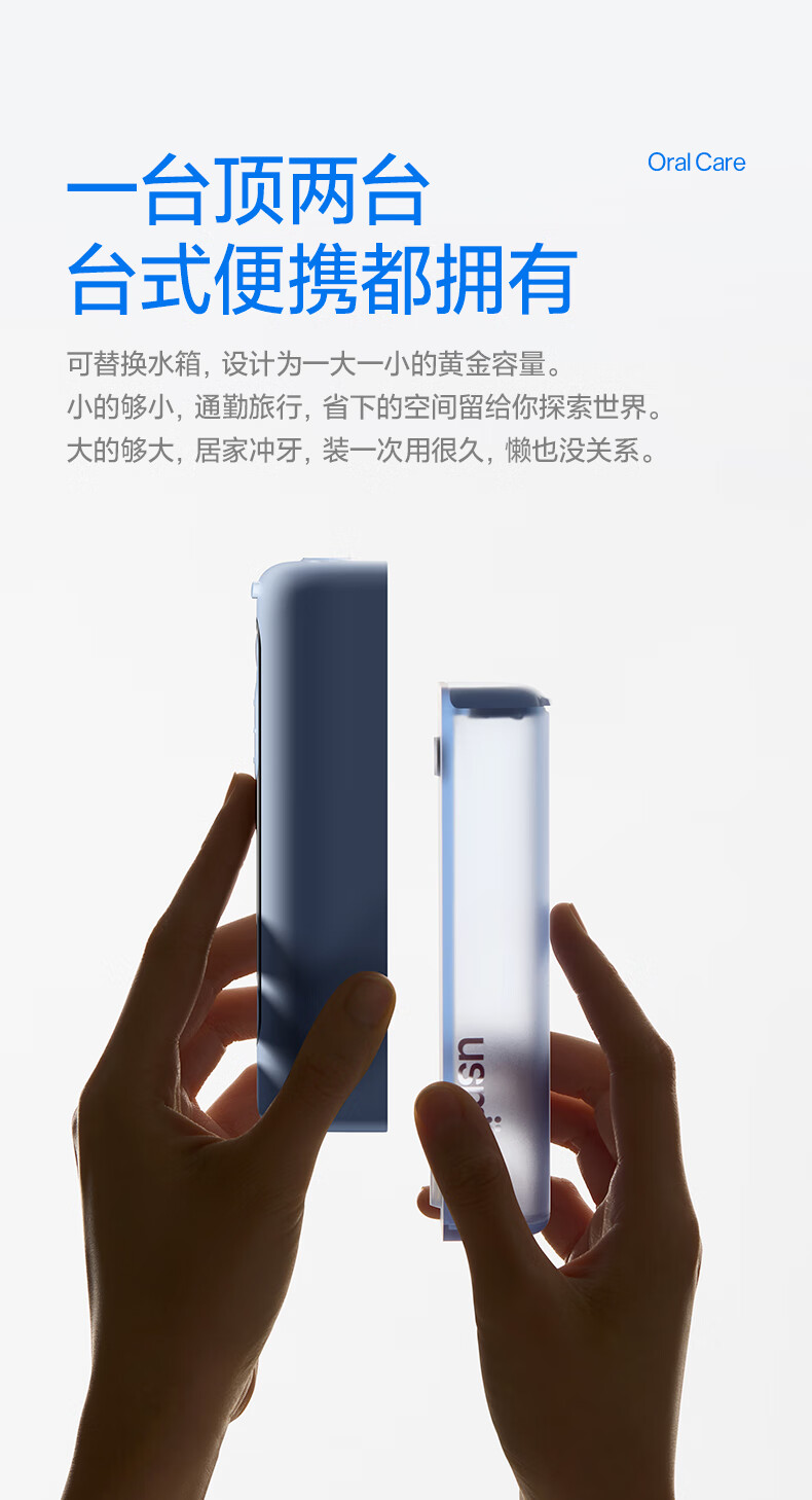 齿科超声双水流,4倍牙菌斑去除率*;可替换的磁吸大小水箱,一台顶两台;医研160°双S型喷嘴*,后槽牙一冲就净;医疗同源隔膜泵,经久耐用 9挡分龄护齿,全家适用;防霉管道抑菌99%干净卫生,充电3小时,续航30天