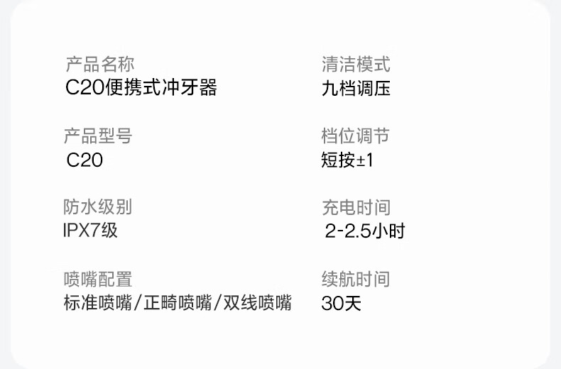包装配置:冲牙器*1、喷嘴*3、水箱、扫码卡*1、充电线*1、使用说明书*1