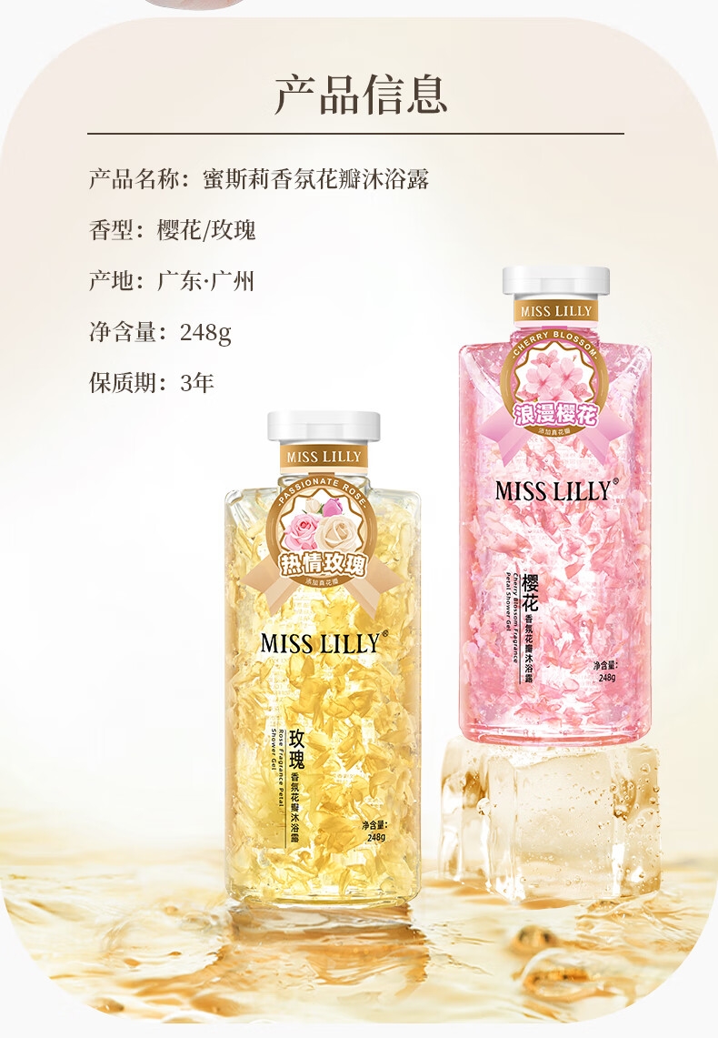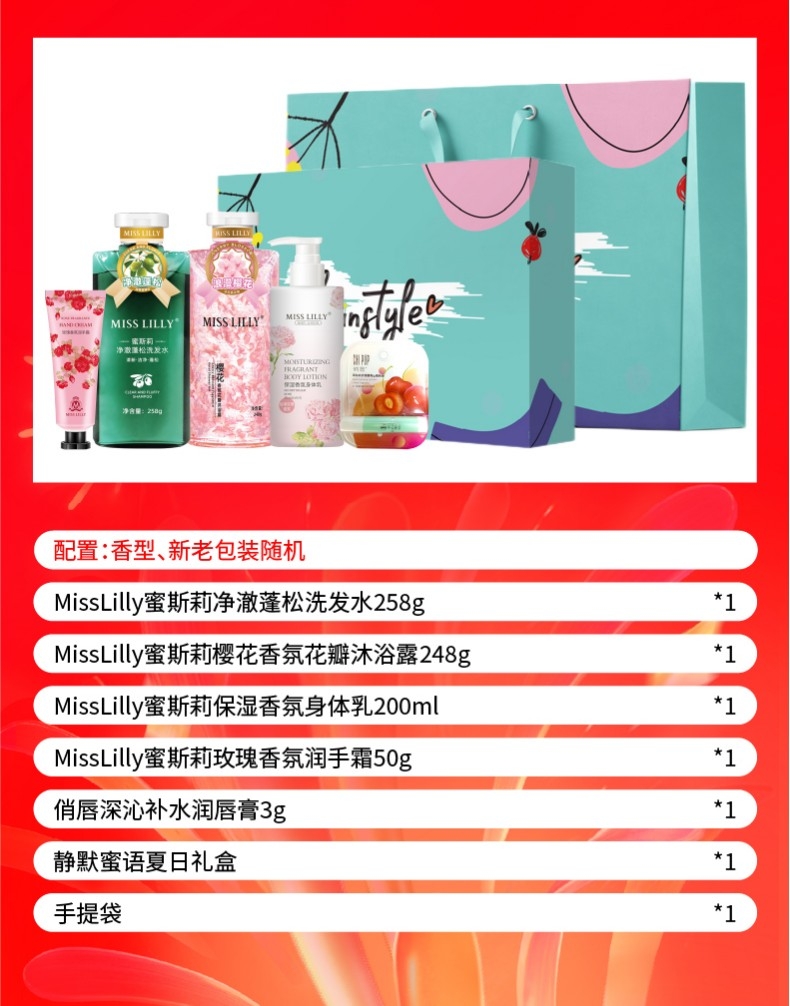 配置清单:MissLilly蜜斯莉净澈蓬松洗发水258g*1 MissLilly蜜斯莉樱花香氛花瓣沐浴露248g*1 MissLilly蜜斯莉保湿香氛身体乳200ml*1 MissLilly蜜斯莉玫瑰香氛润手霜50g*1 俏唇深沁补水润唇膏3g*1 静默蜜语夏日礼盒*1 手提袋*1