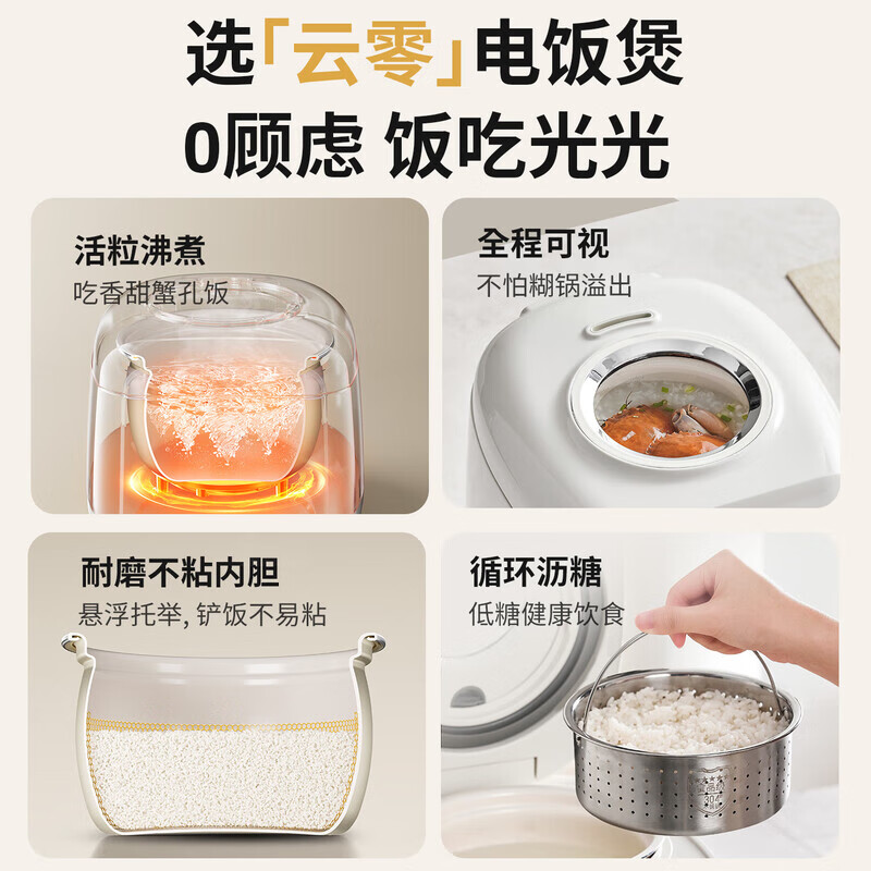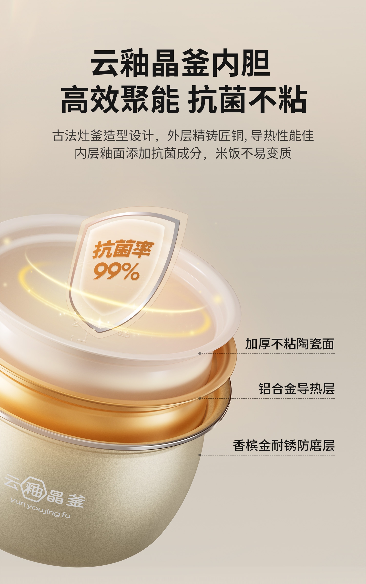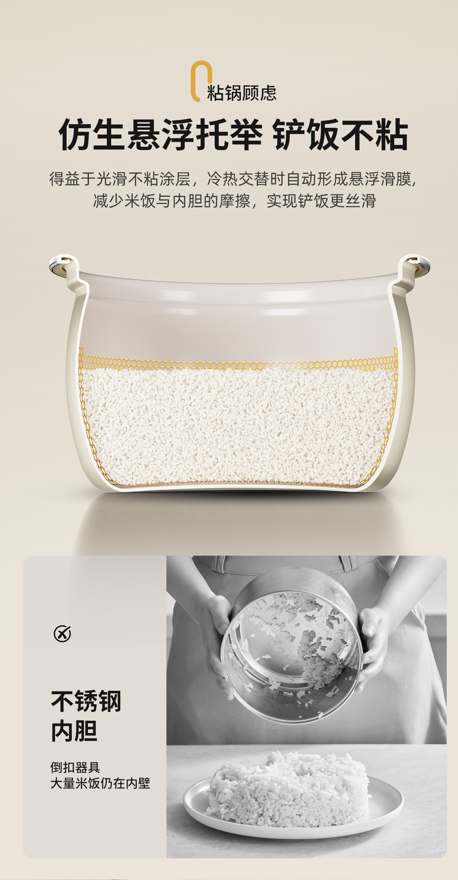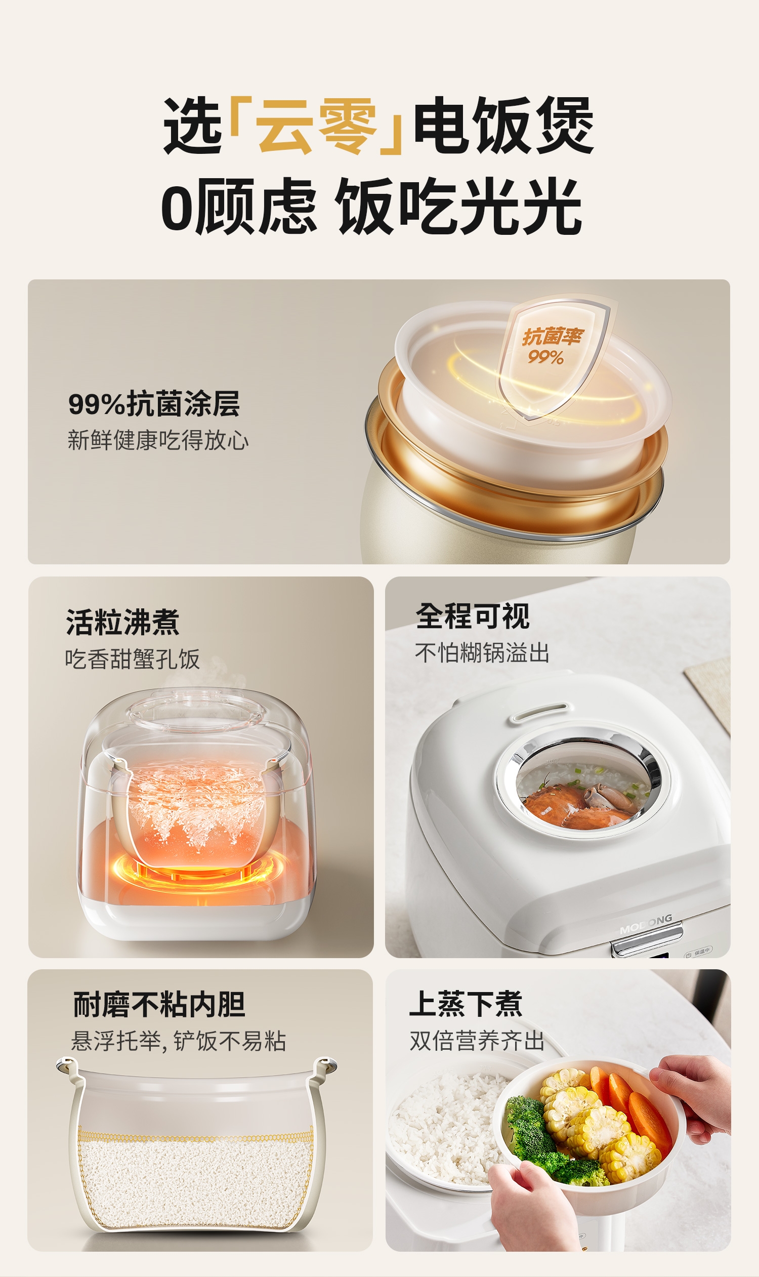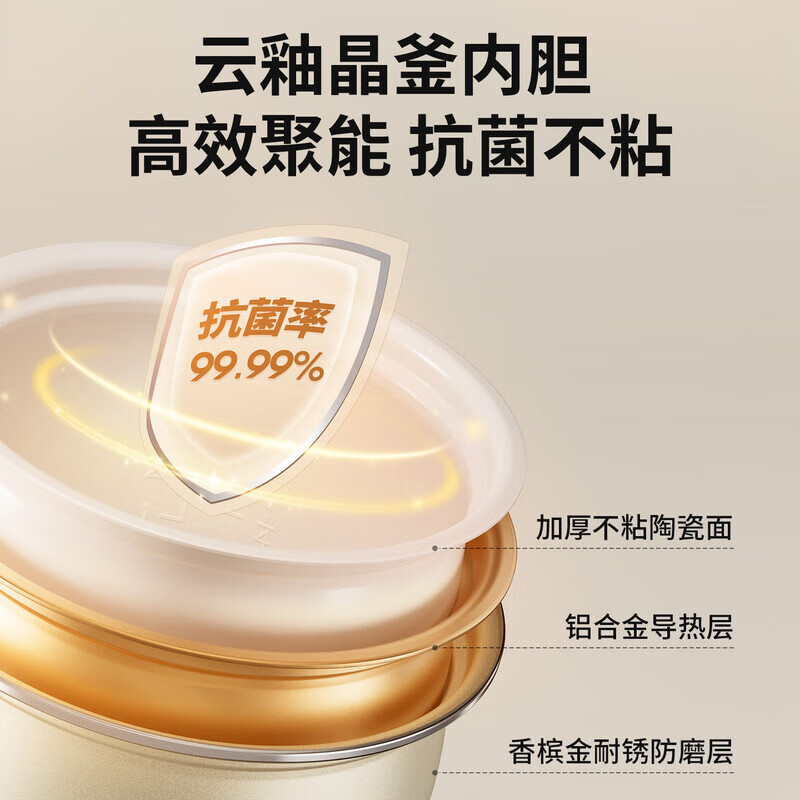 云釉护健康0负担 吃好饭 99%抗菌云釉晶釜;耐磨不粘内胆悬浮托举,铲饭不易粘;日常多次使用清洗,内胆依然光洁无明显损坏