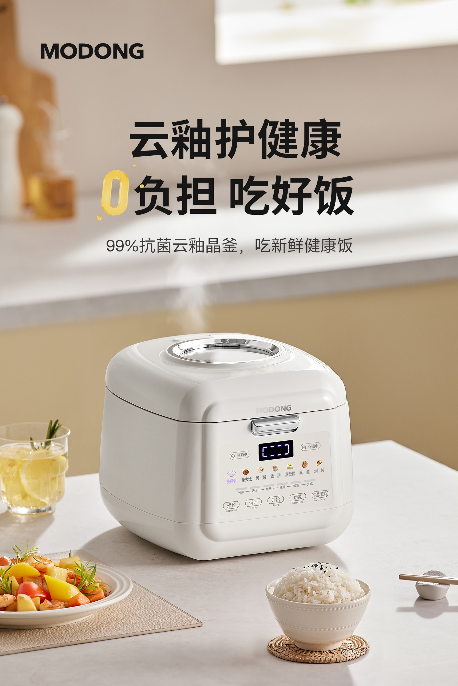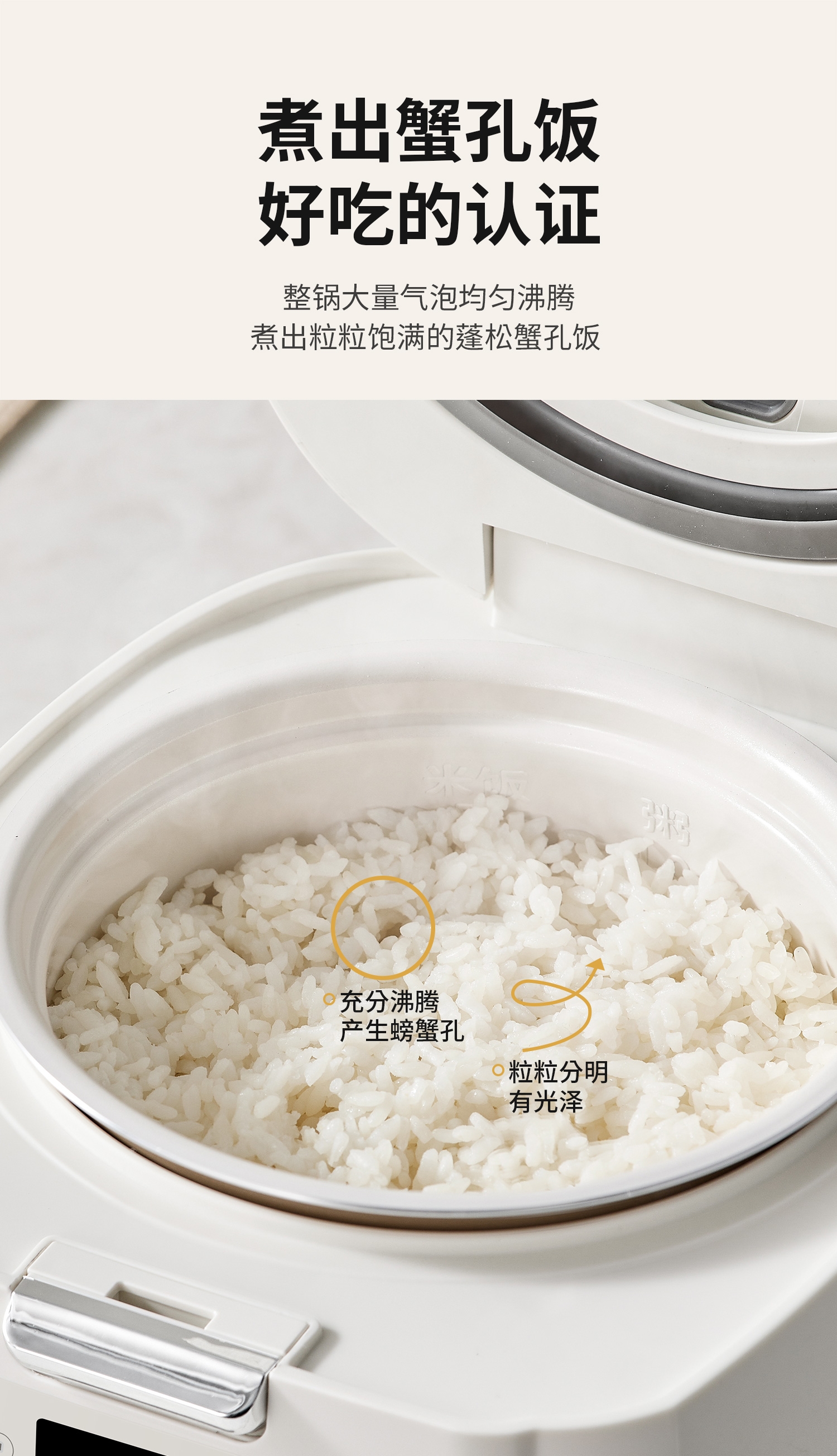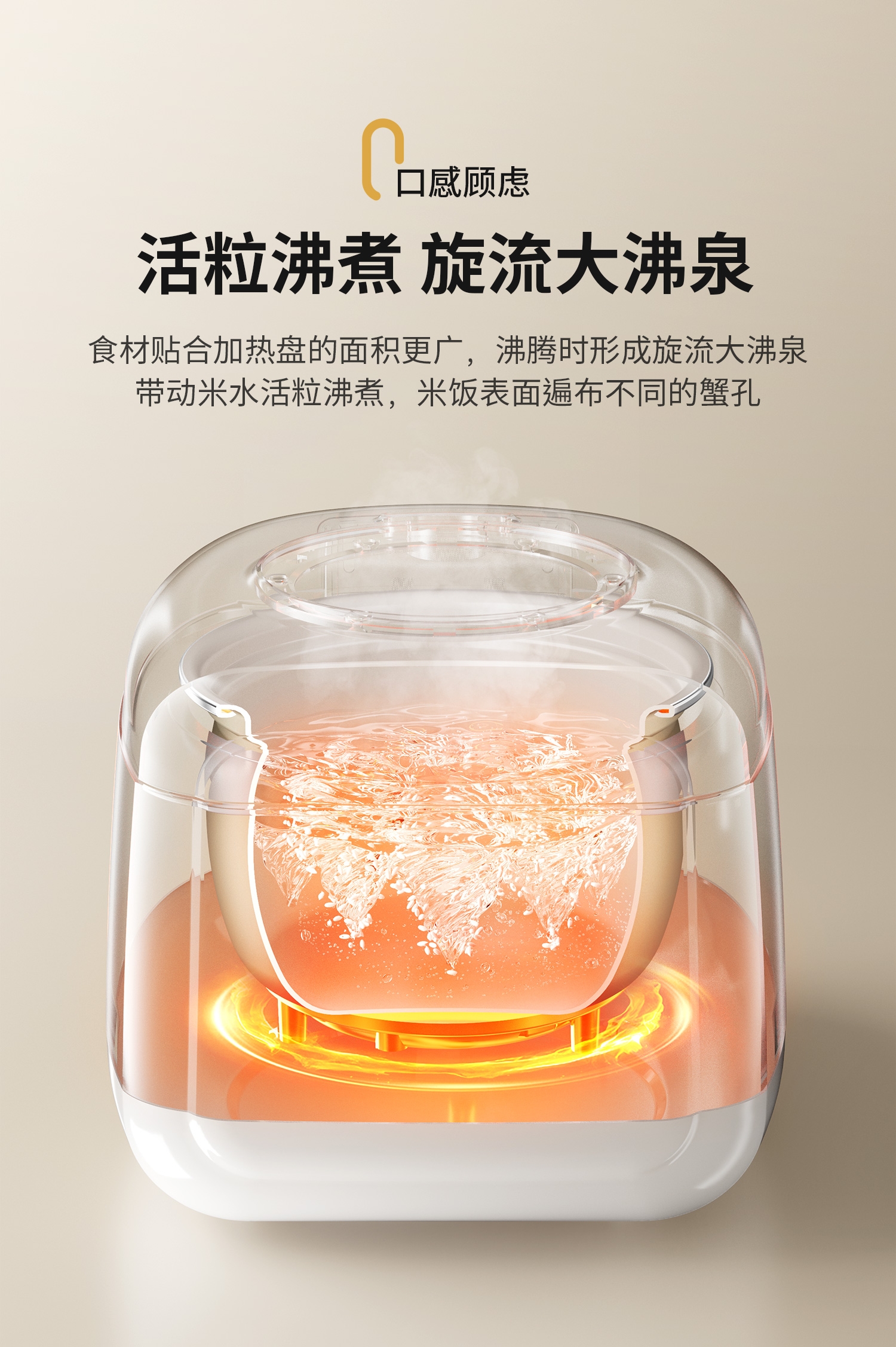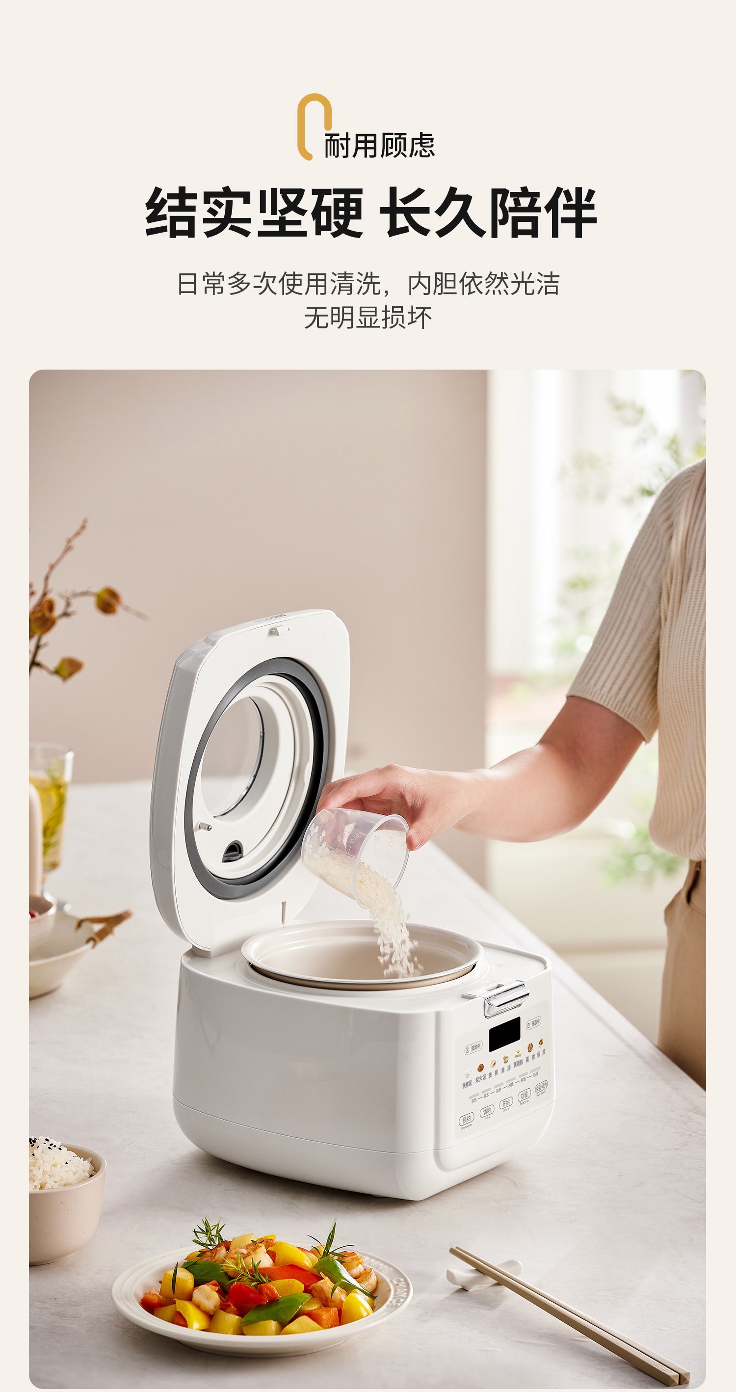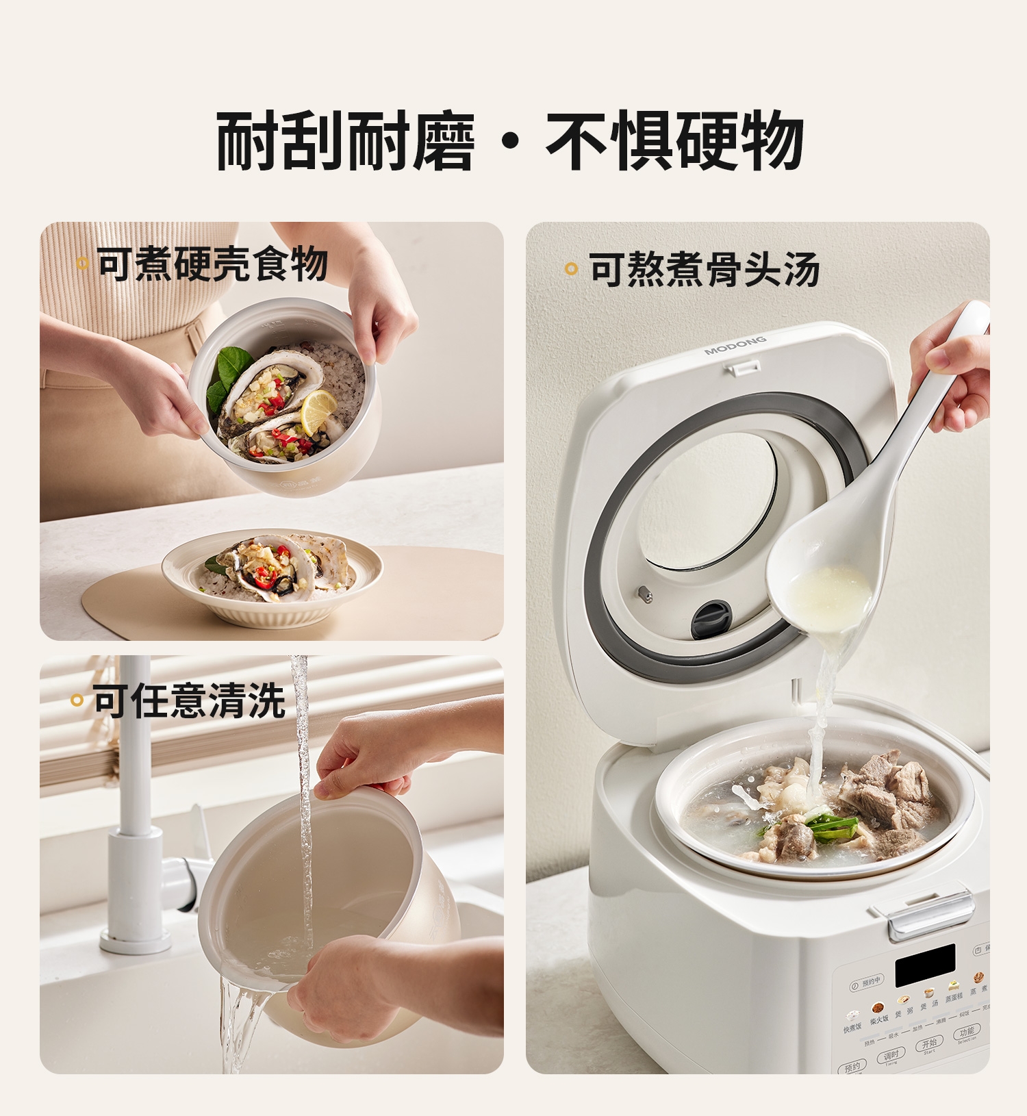 云釉护健康0负担 吃好饭 99%抗菌云釉晶釜;耐磨不粘内胆悬浮托举,铲饭不易粘;日常多次使用清洗,内胆依然光洁无明显损坏