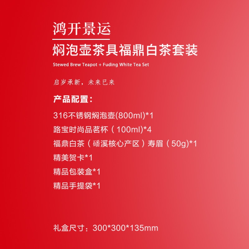 鸿开景运主题,开门红 / 新年礼赠寓意佳;316 不锈钢焖泡壶 + 磻溪核心区福鼎白茶寿眉;含茶具、茶叶、精美包装,商务礼赠有面;焖泡便捷,品茗杯 * 4,满足分享 / 自饮;精美礼盒 + 手提袋,包装喜庆显档次