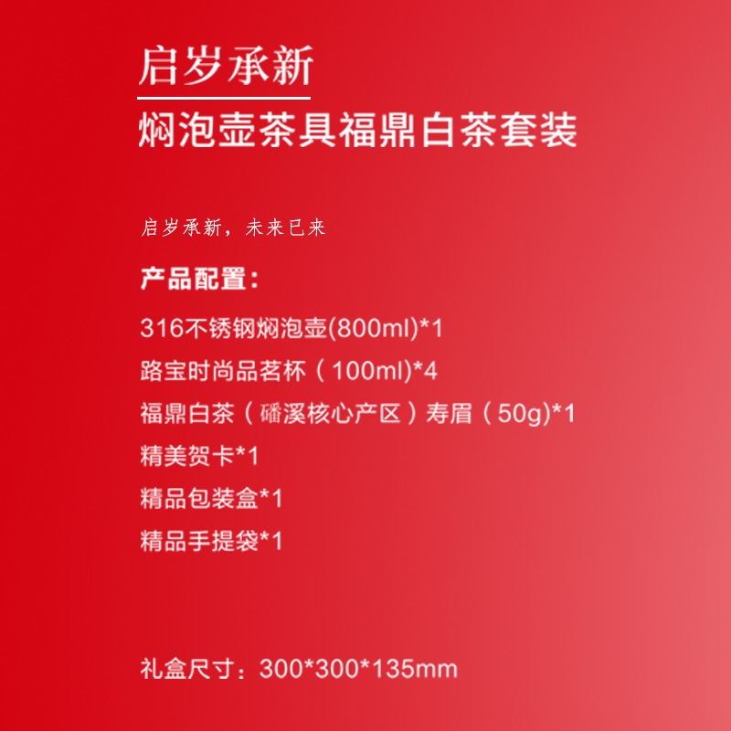 配置清单:316不锈钢焖泡壶(800ml)*1 路宝时尚品茗杯(100ml)*4 福鼎白茶(磻溪核心产区)寿眉(50g)*1 精美贺卡*1 精品包装盒*1 精品手提袋*1