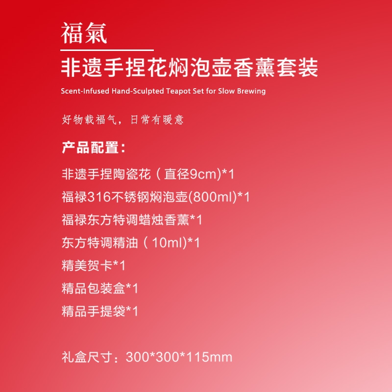 配置清单:非遗手捏陶瓷花(直径9cm)*1 福禄316不锈钢焖泡壶*1 (800ml)*1福禄东方特调蜡烛香薰*1 东方特调精油(10ml)*1 精美贺卡*1 精品包装盒*1 精品手提袋*1