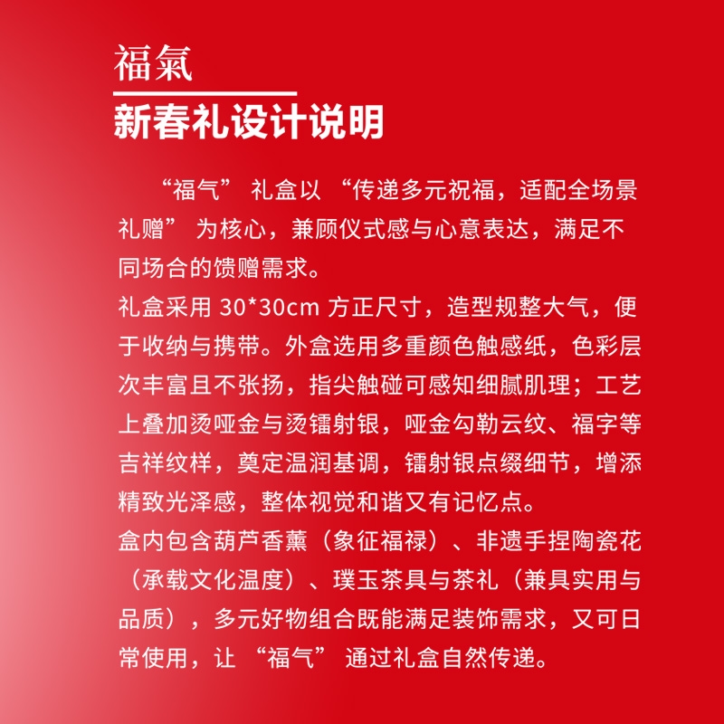 非遗手捏花工艺,彰显文化底蕴;316 不锈钢焖泡壶,实用耐用;东方特调香薰,多品类香氛体验;福禄元素,契合新年商务礼赠寓意;精美礼盒包装,高端有格调