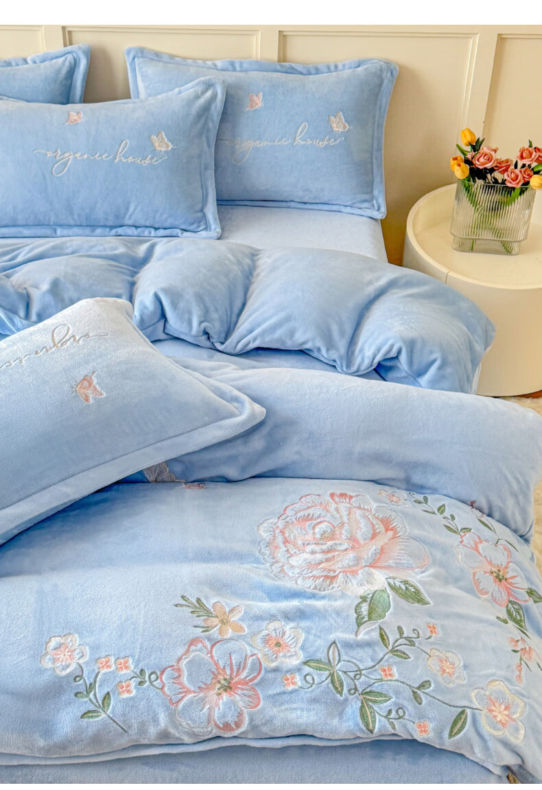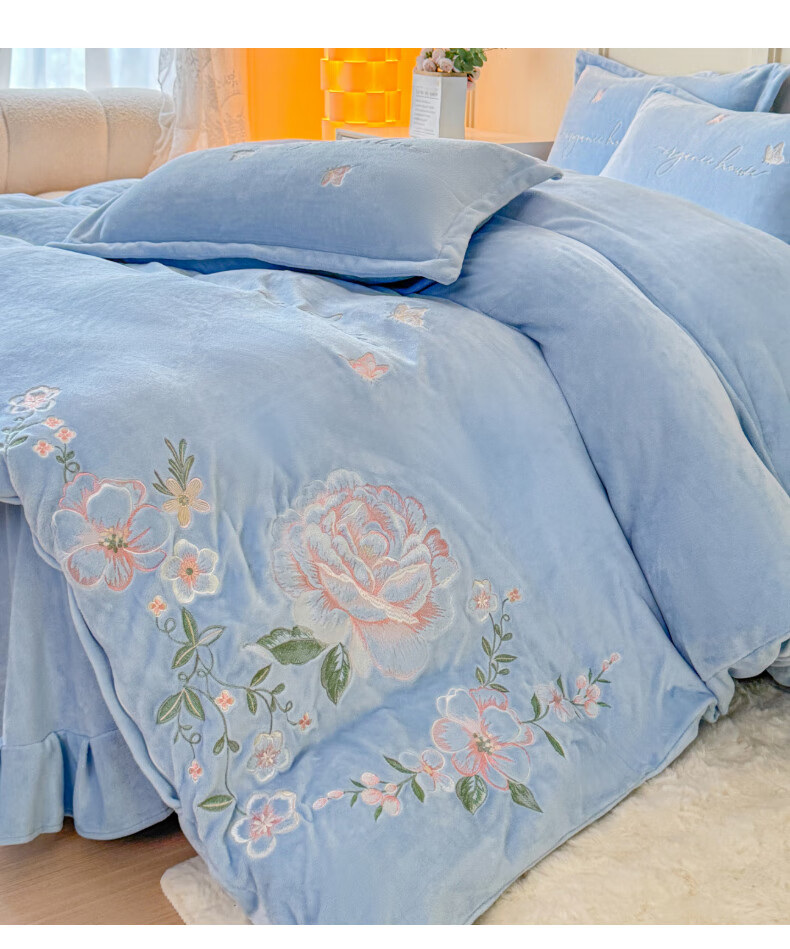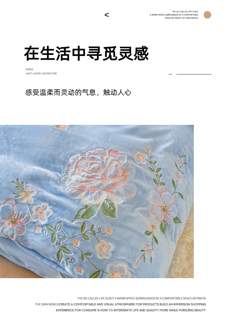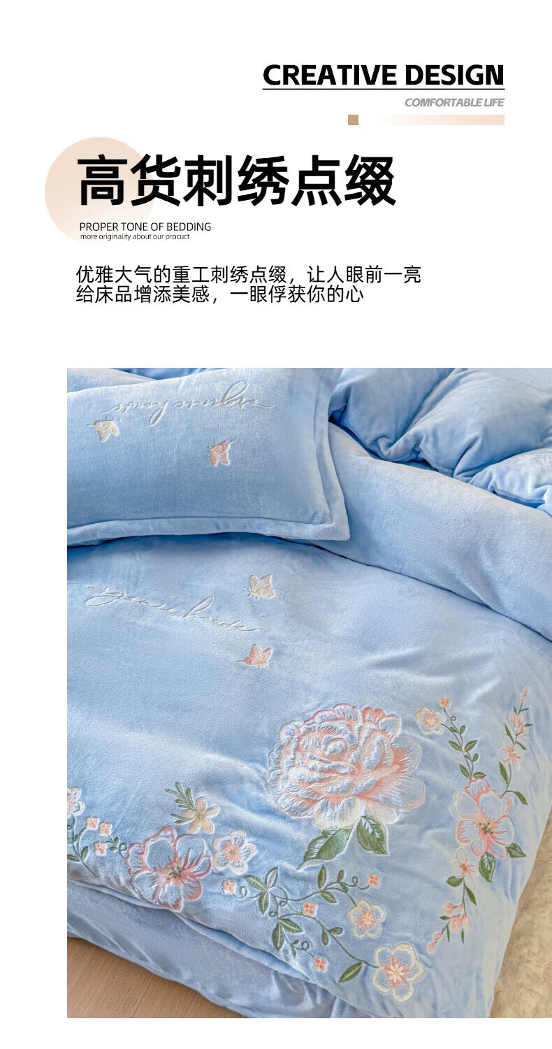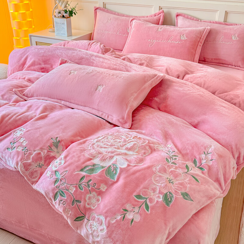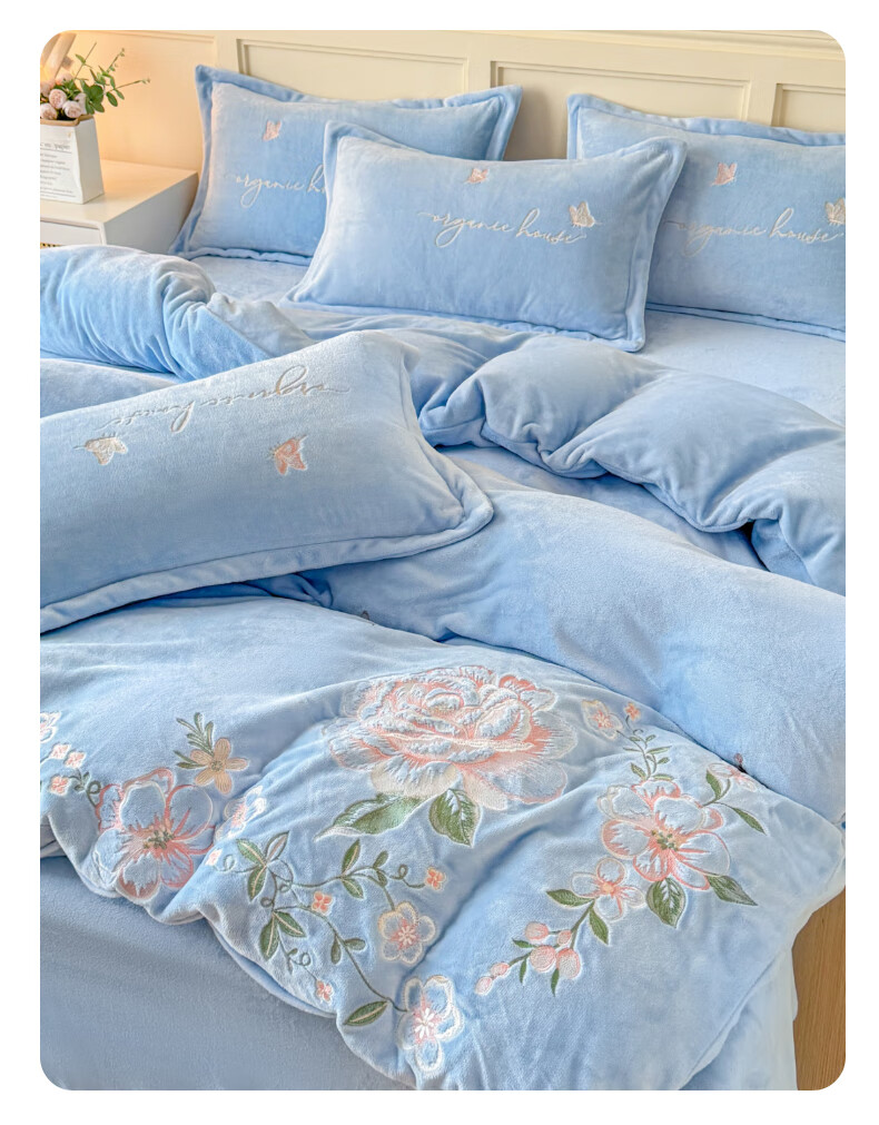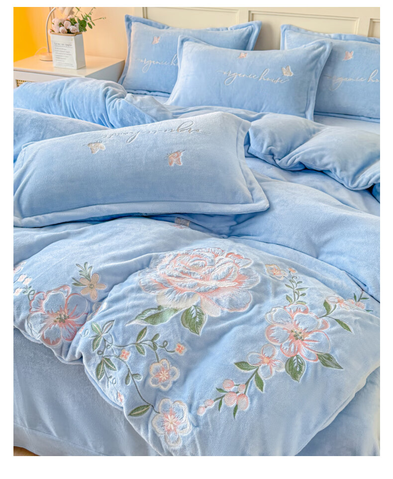 精选高密度牛奶绒面料,贴肤瞬间没有粗糙摩擦;绒面始终贴合身体曲线,连脚尖都能被稳稳裹住;重工刺绣枕套和被套,更是增添卧室风情。