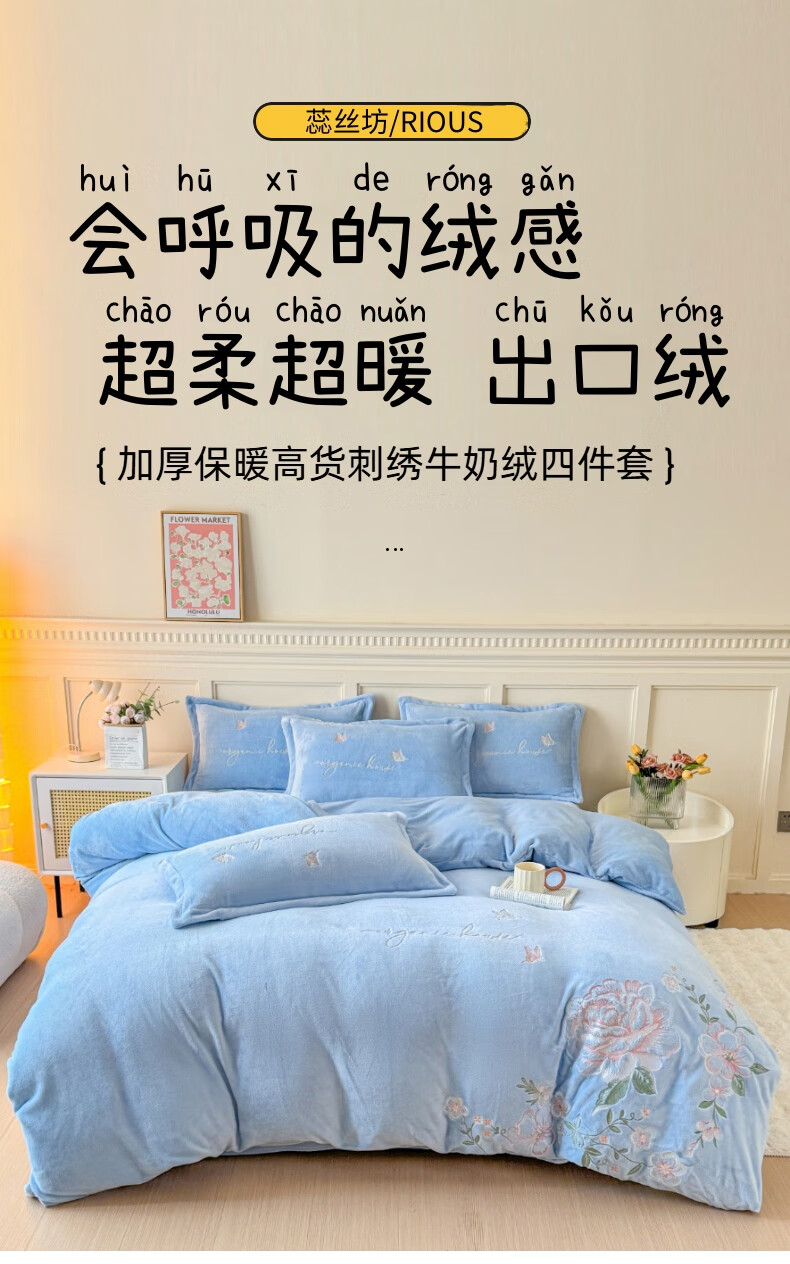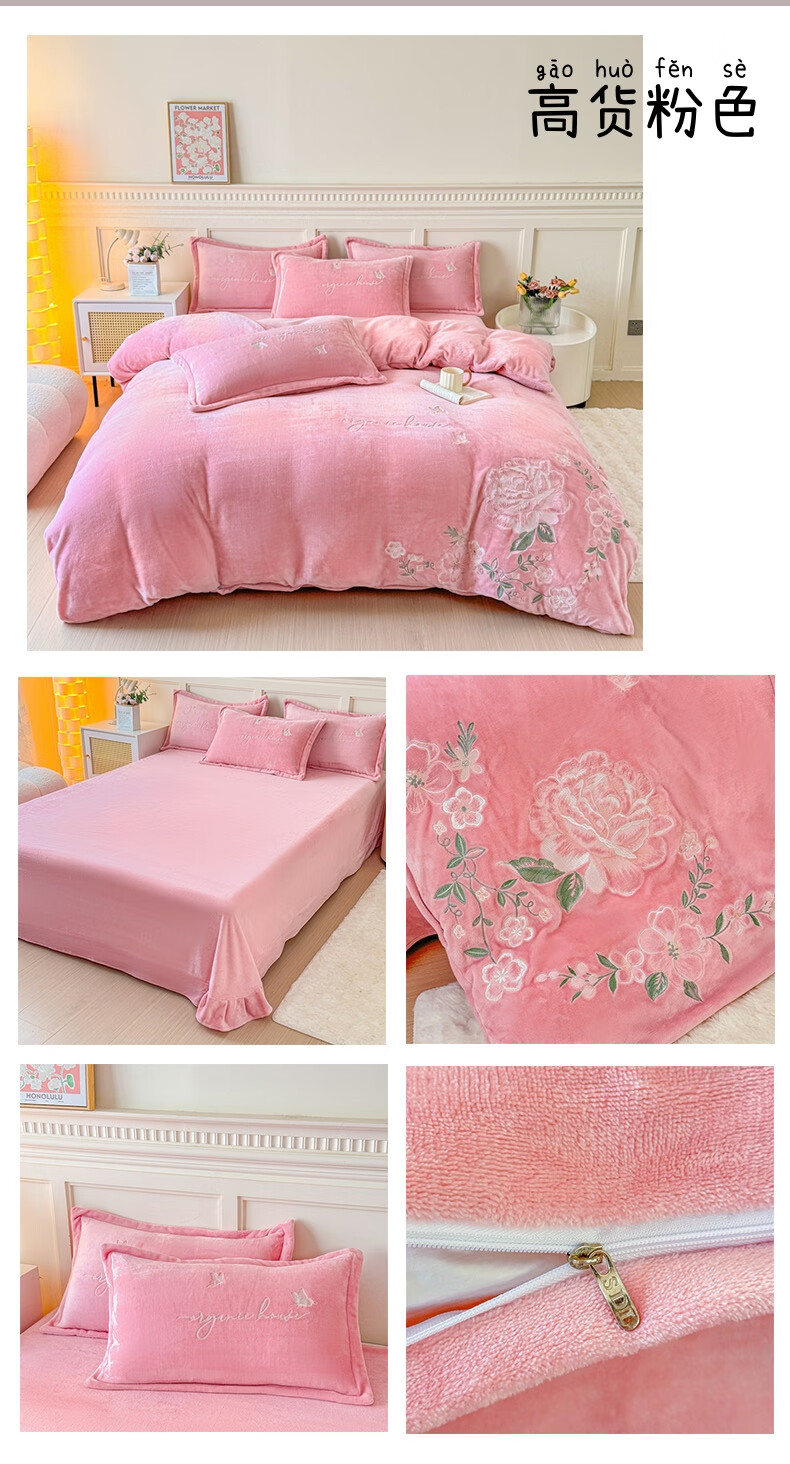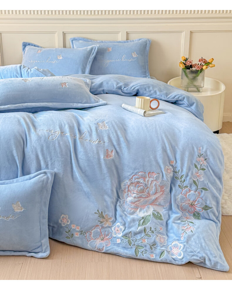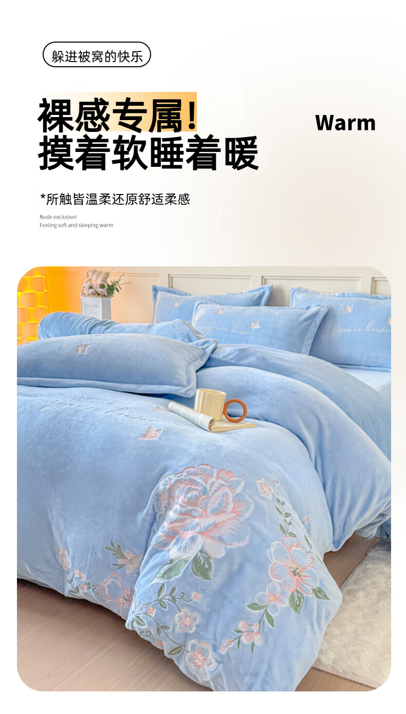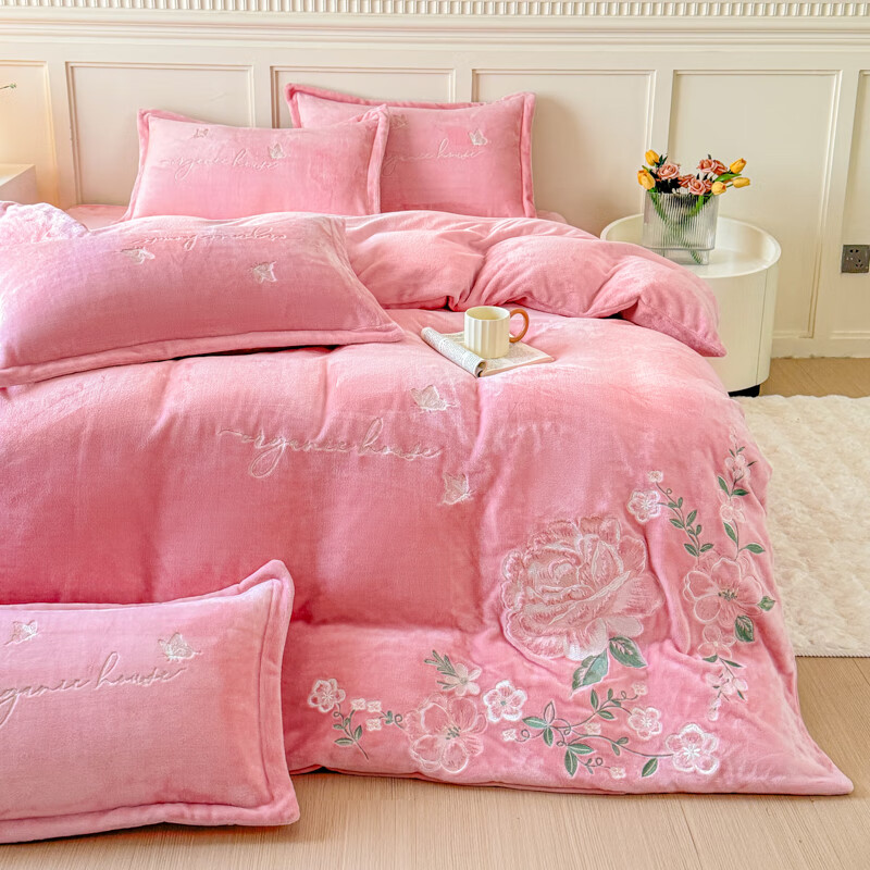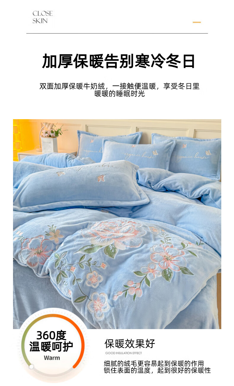 精选高密度牛奶绒面料,贴肤瞬间没有粗糙摩擦;绒面始终贴合身体曲线,连脚尖都能被稳稳裹住;重工刺绣枕套和被套,更是增添卧室风情。