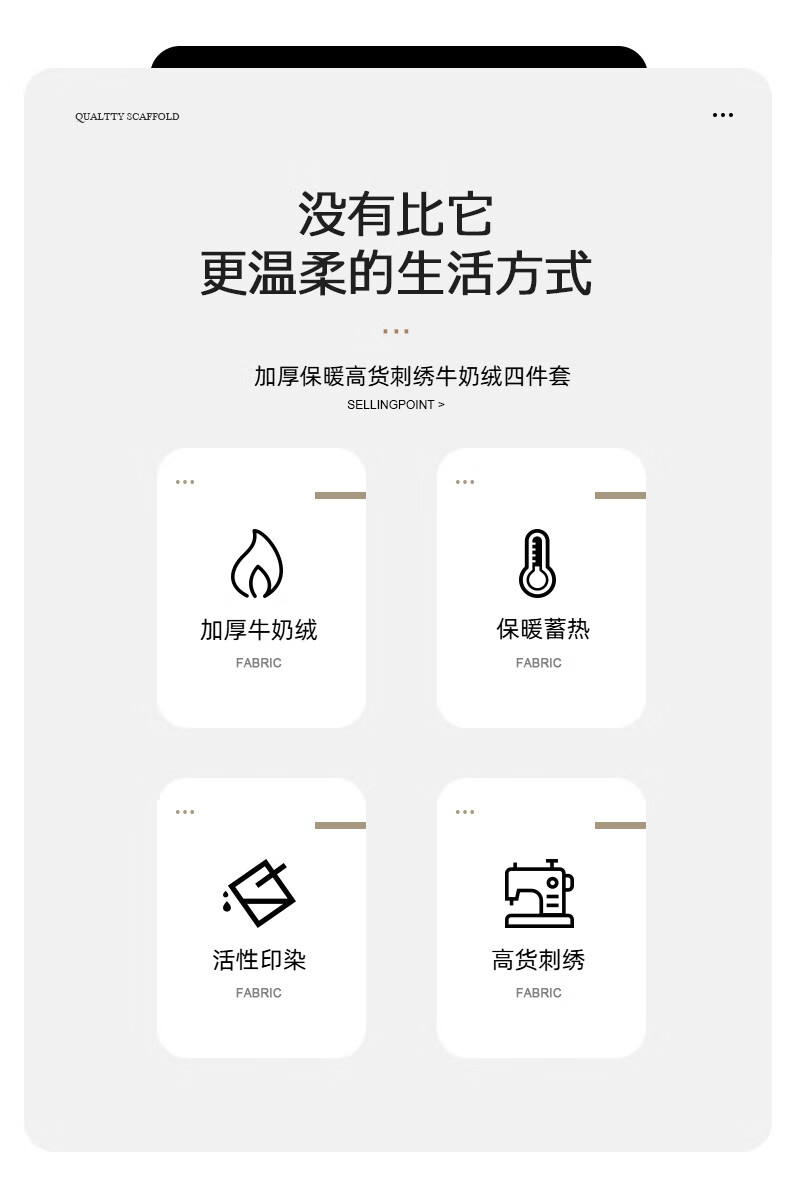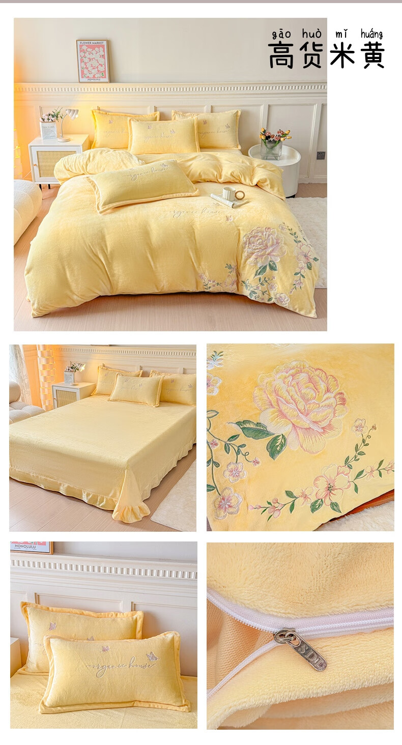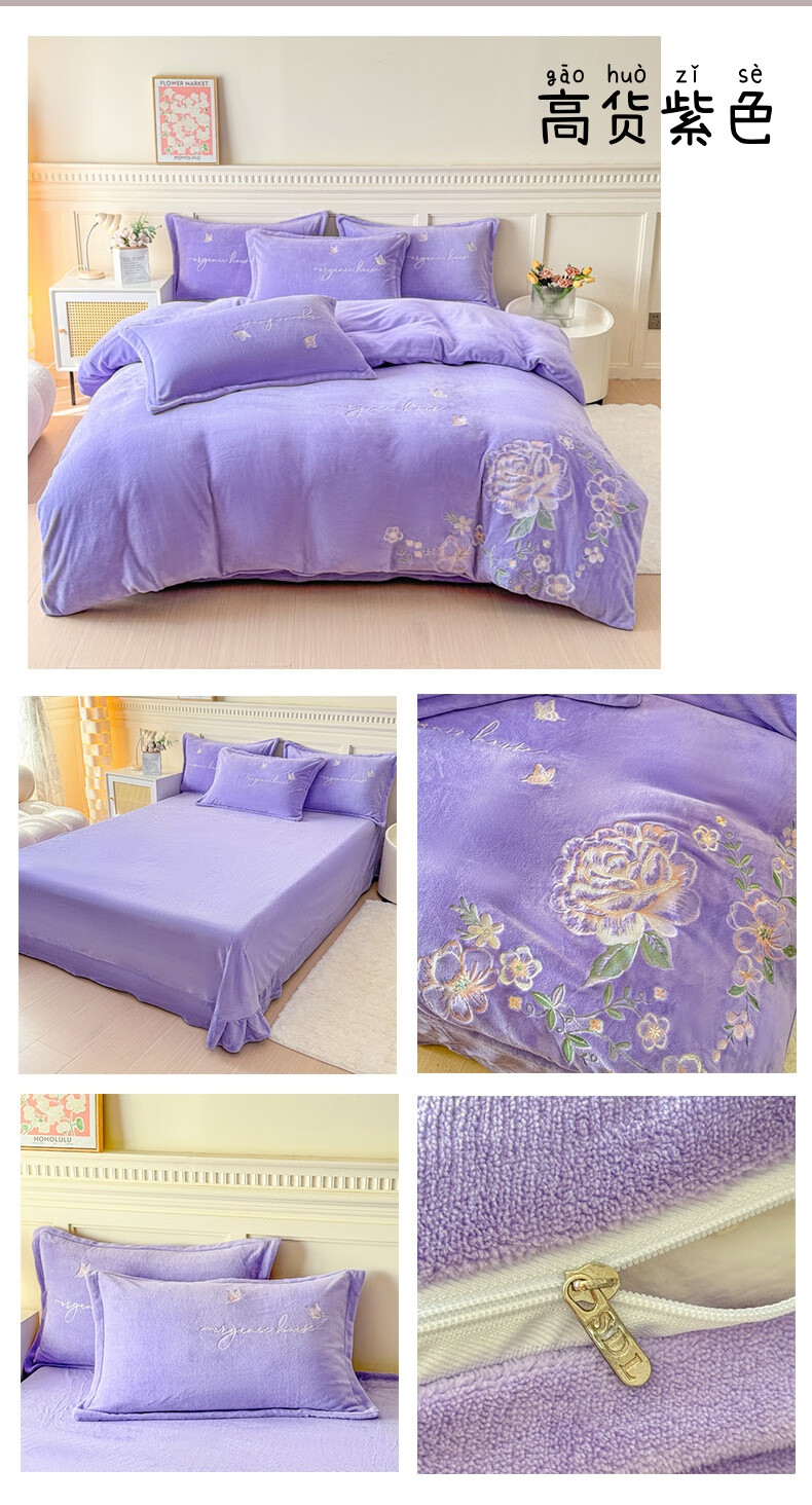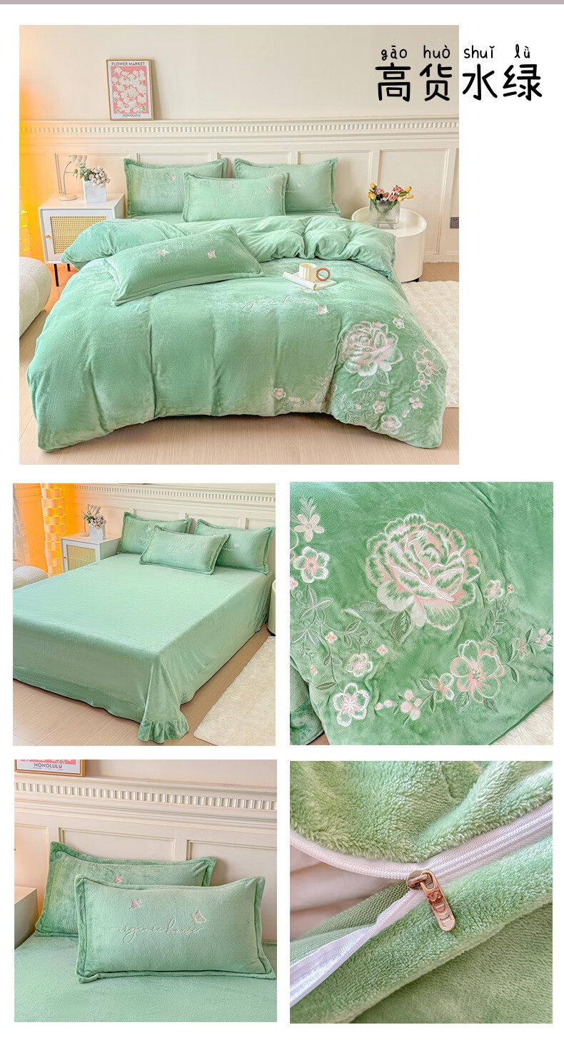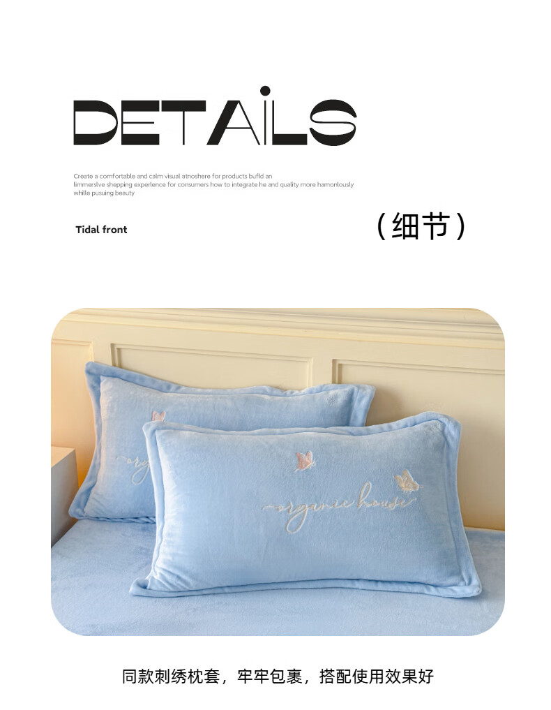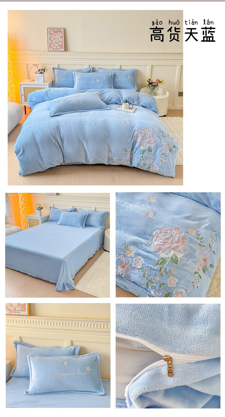 精选高密度牛奶绒面料,贴肤瞬间没有粗糙摩擦;绒面始终贴合身体曲线,连脚尖都能被稳稳裹住;重工刺绣枕套和被套,更是增添卧室风情。
