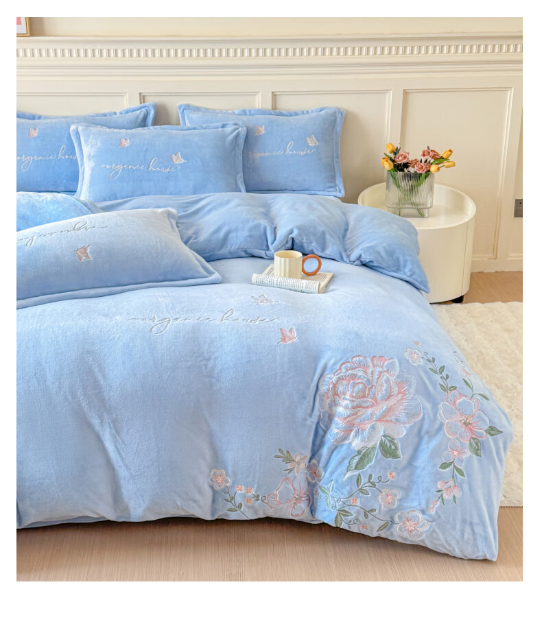 蕊丝坊 大版花卉牛奶绒刺绣牛奶绒四件套