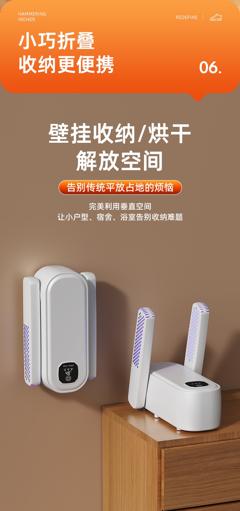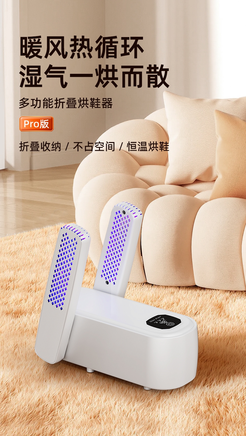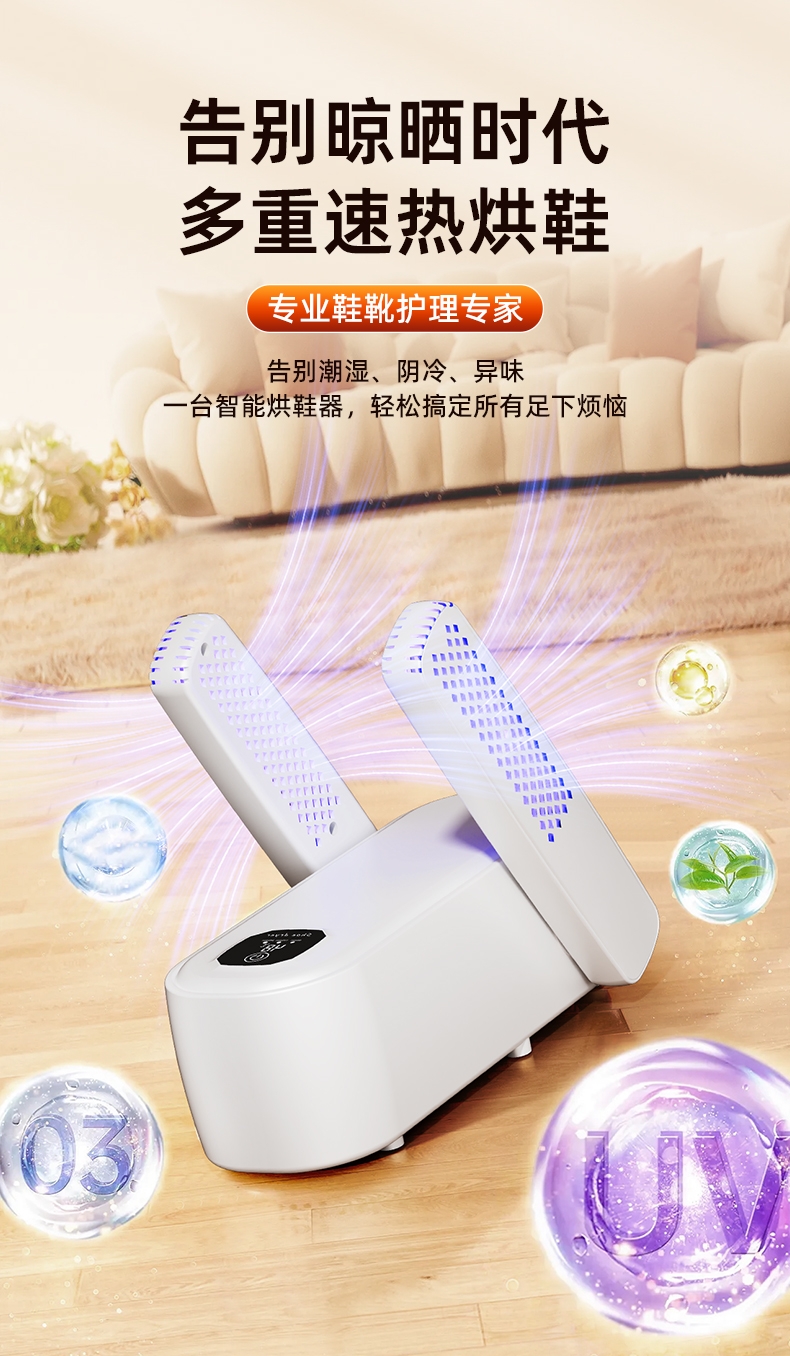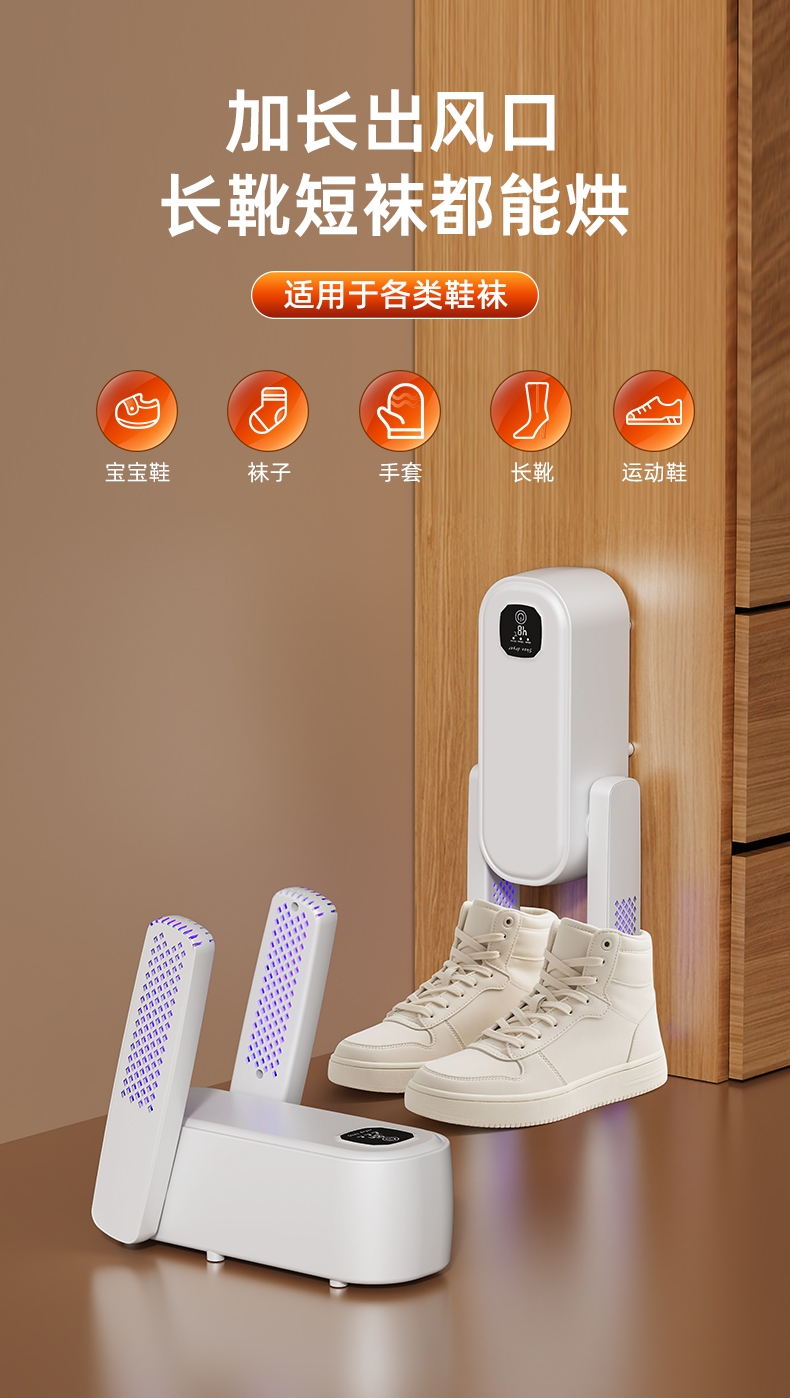 安全过热保护;折叠收纳定时开关适合各类鞋靴袜;风干蓝光杀菌不伤鞋