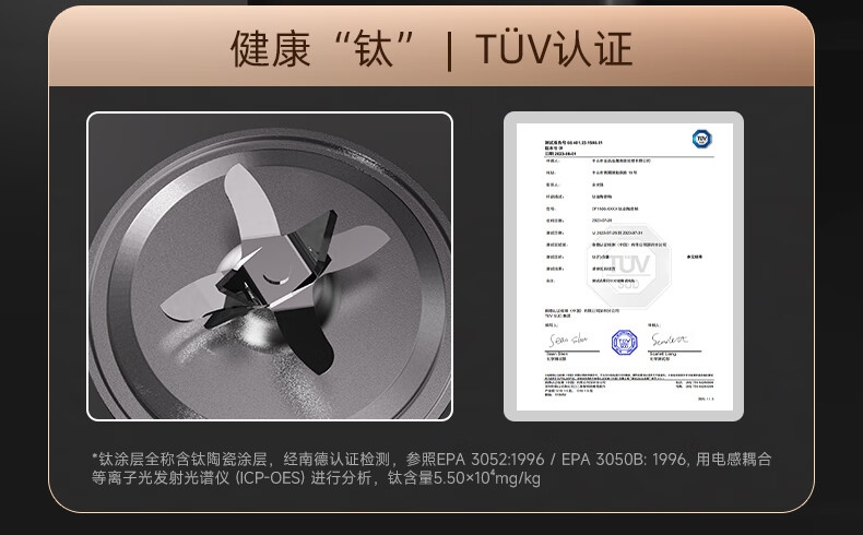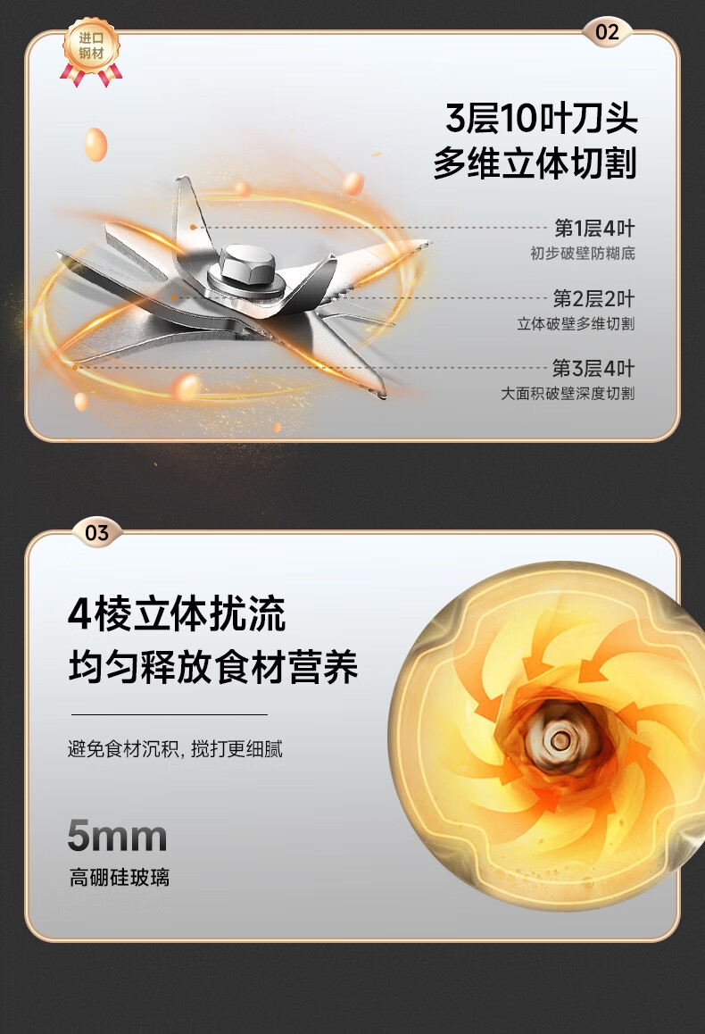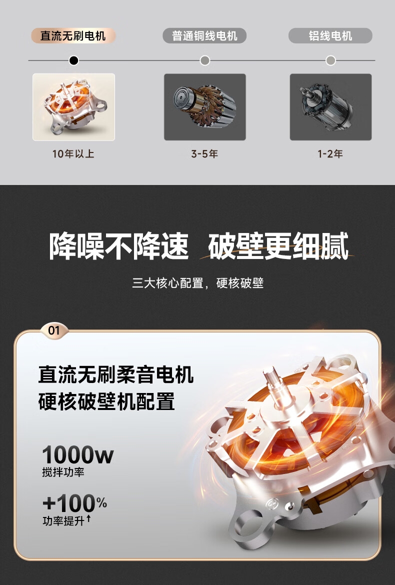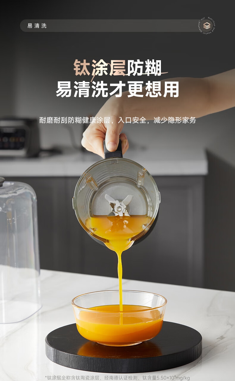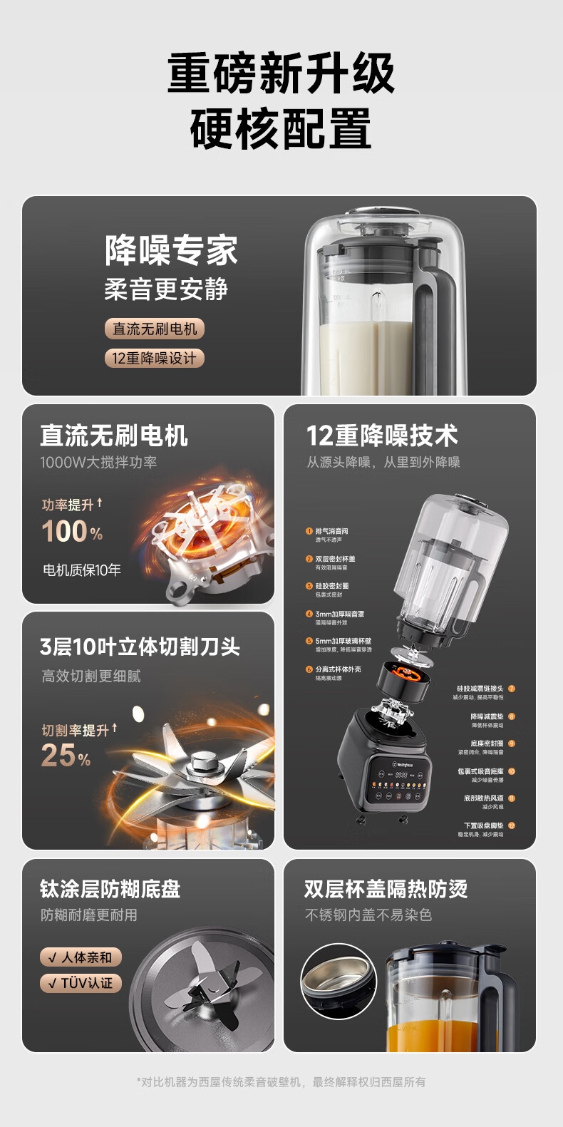 无刷电机 12重降噪设计;3层10叶刀头 多维立体切割;健康钛涂层,抑菌耐磨