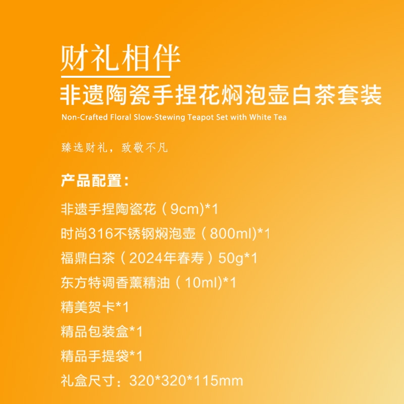 非遗手捏陶瓷花 + 316 不锈钢焖泡壶,工艺与实;臻选 2024 春寿福鼎白茶,茶品优质;东方特调香薰精油,多维度感官体验;财礼主题包装,适配商务与新年礼赠;多品类组合,礼盒精致有档次