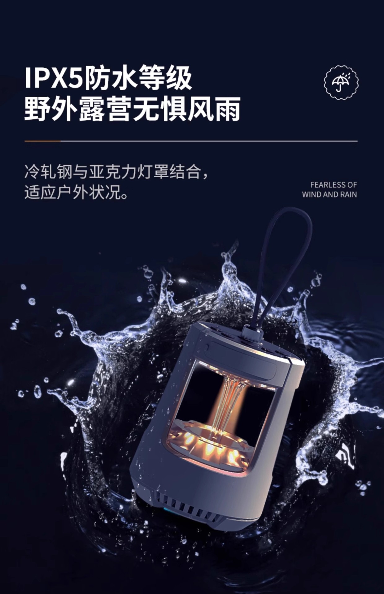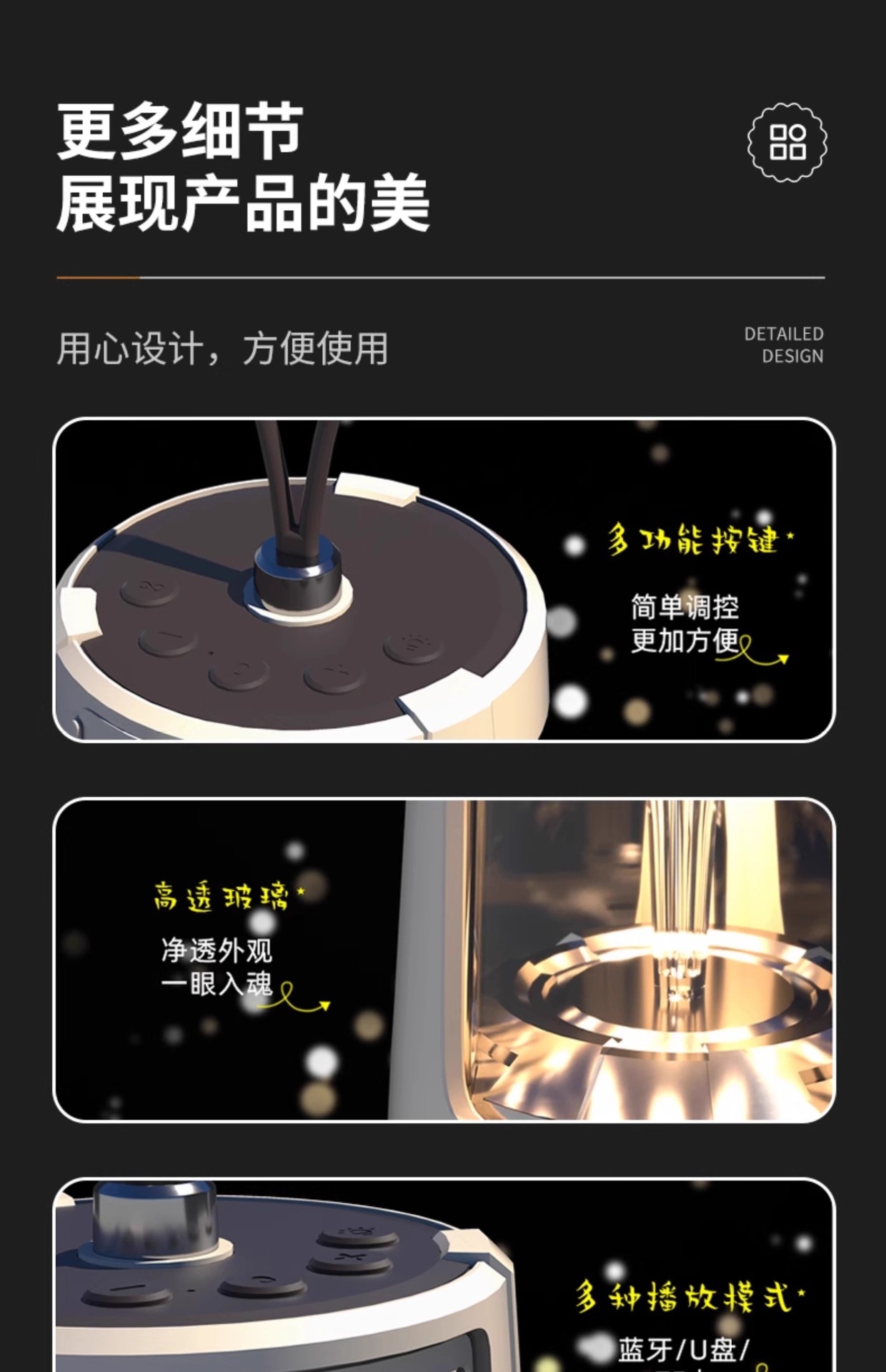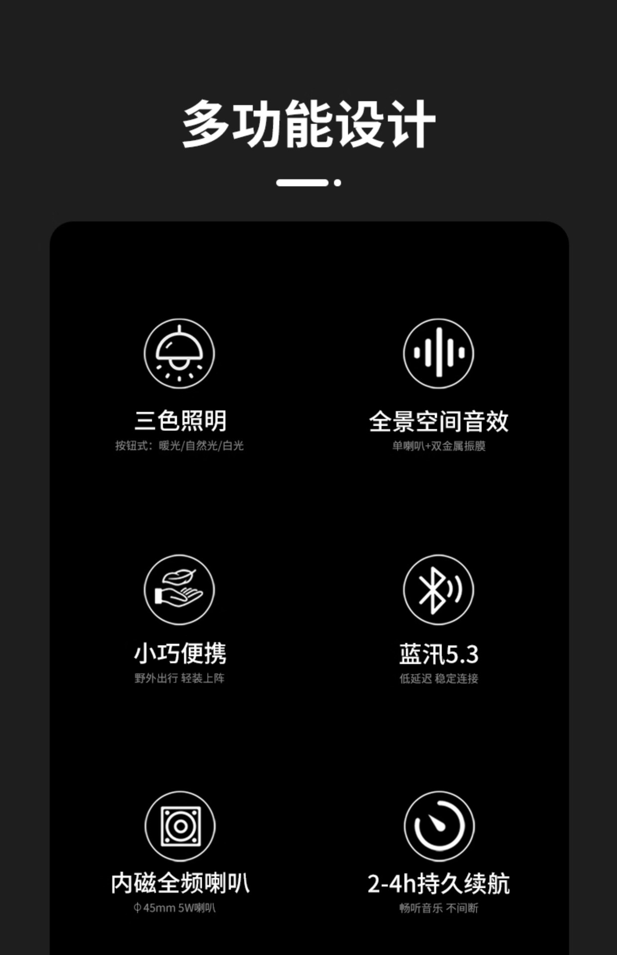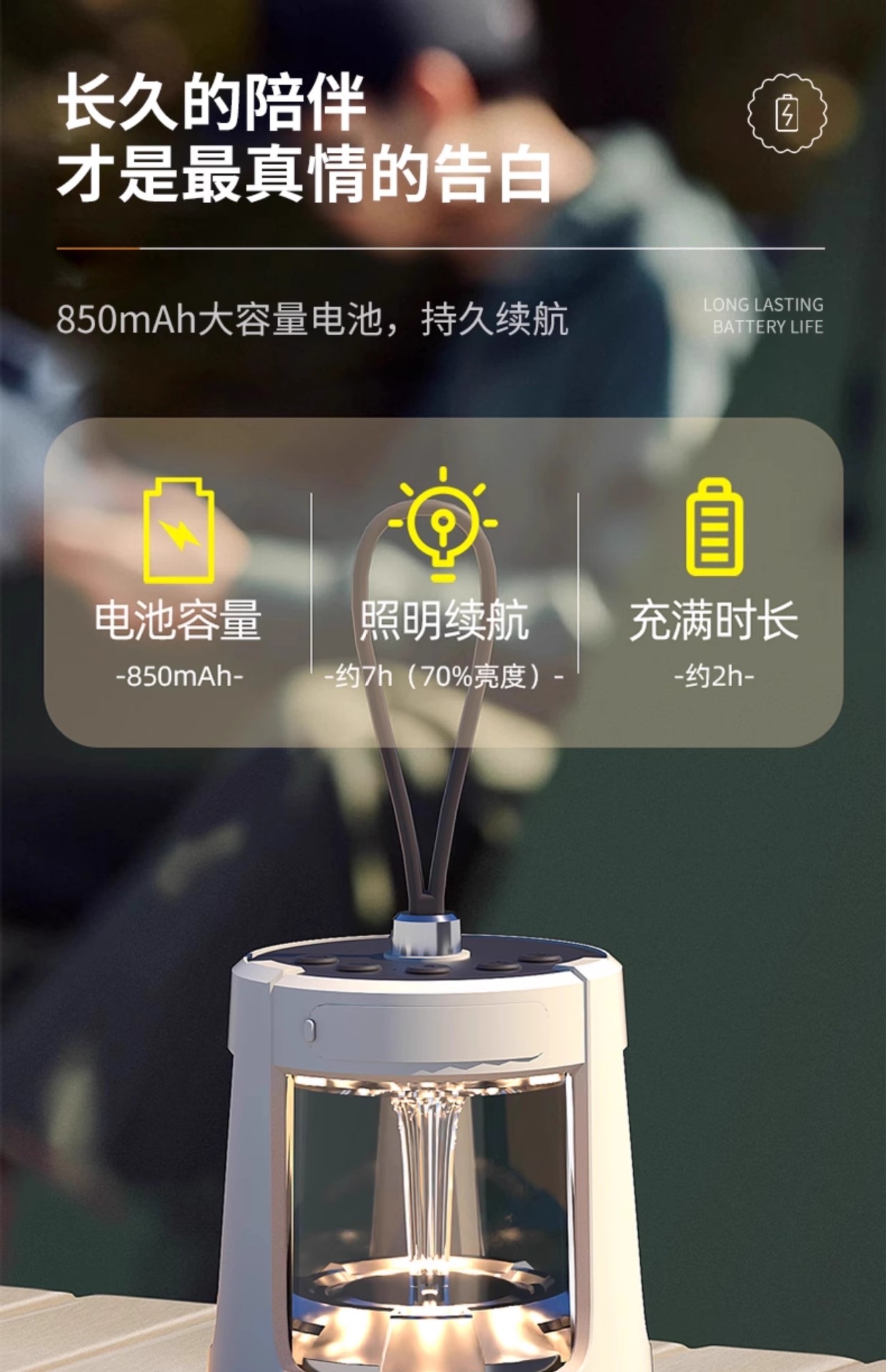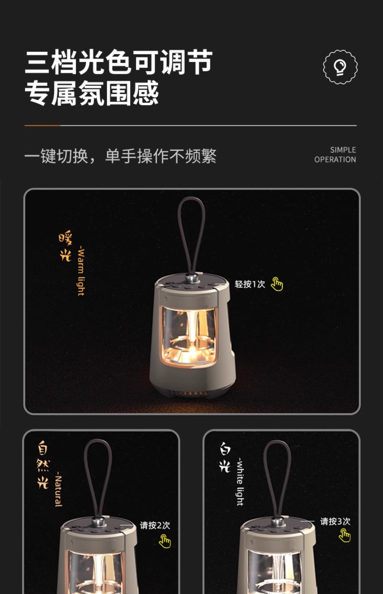 灯光可调冷光/暖光/亮度/暗度;支持可循环充电、记忆播放;定时灯光