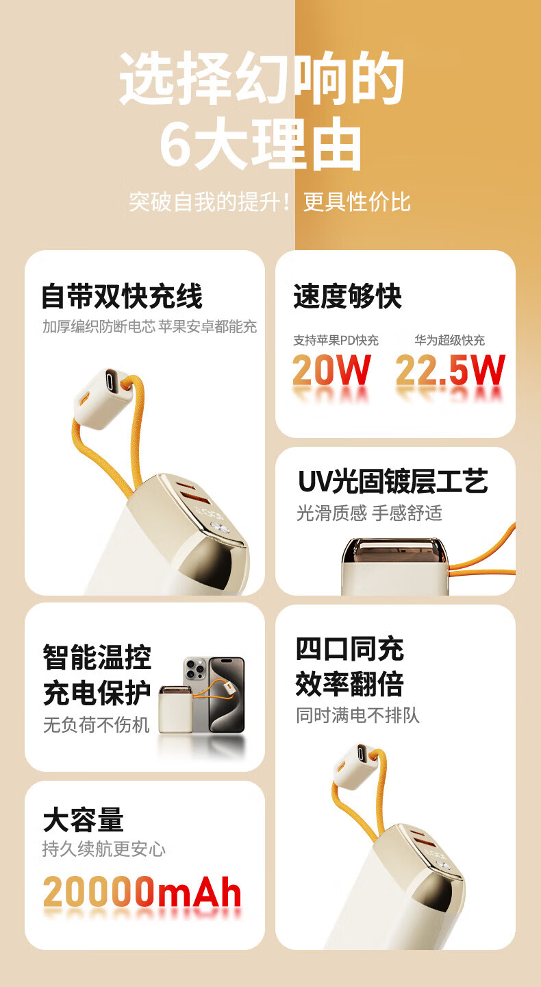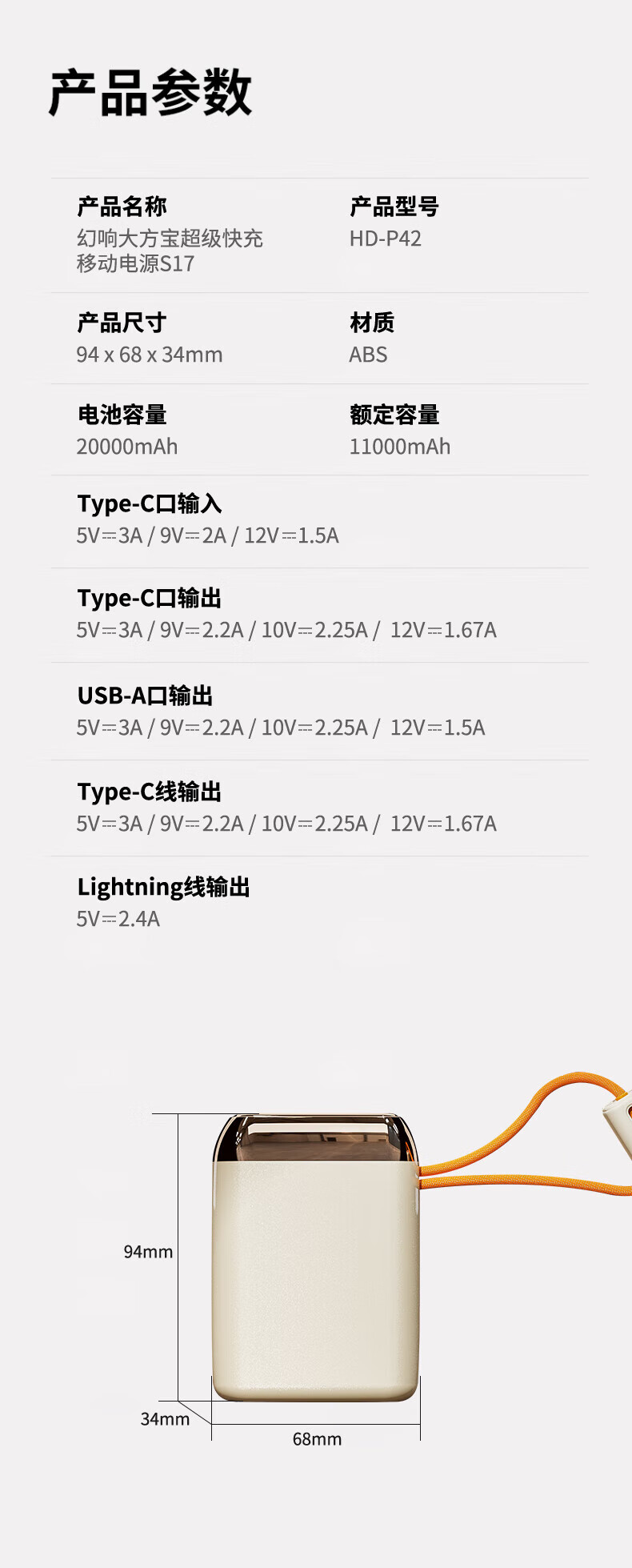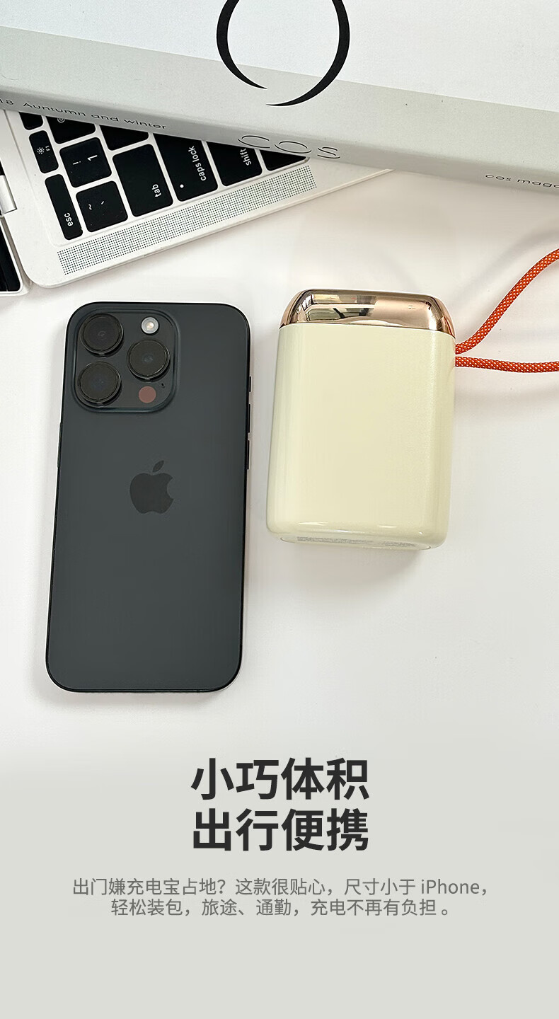 电镀亮金色,轻奢时尚;20000mAh大容量,想走就走;颜值与实力并存!轻薄机身,高密度电池更小巧