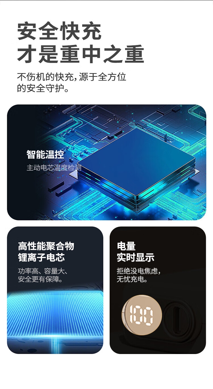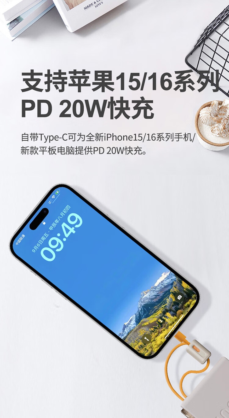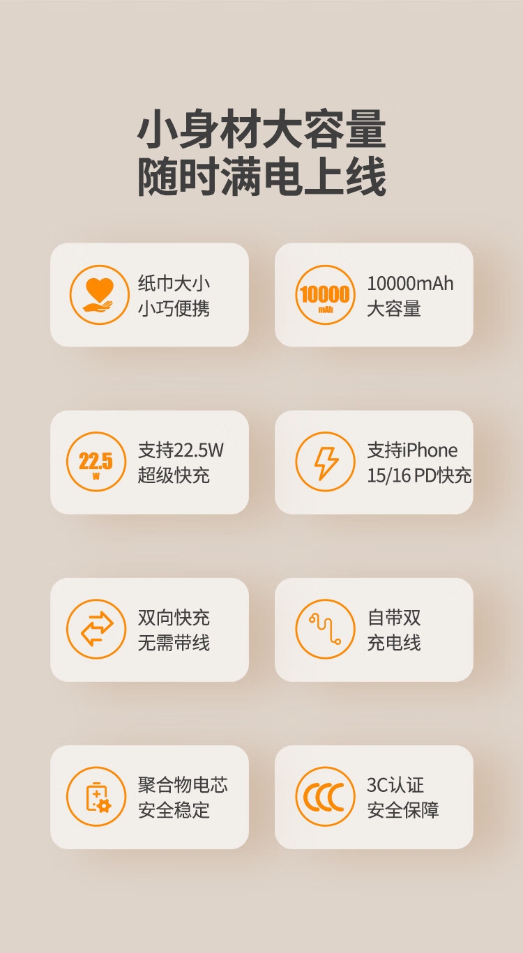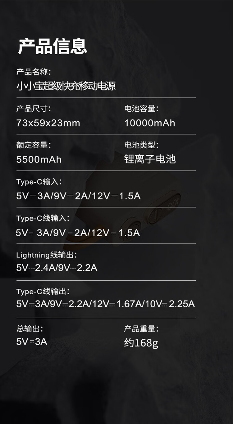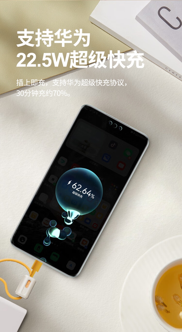 已通过3C认证,原创设计;无敌小身材,蕴含大能量;Type-C线支持22.5W超级快充