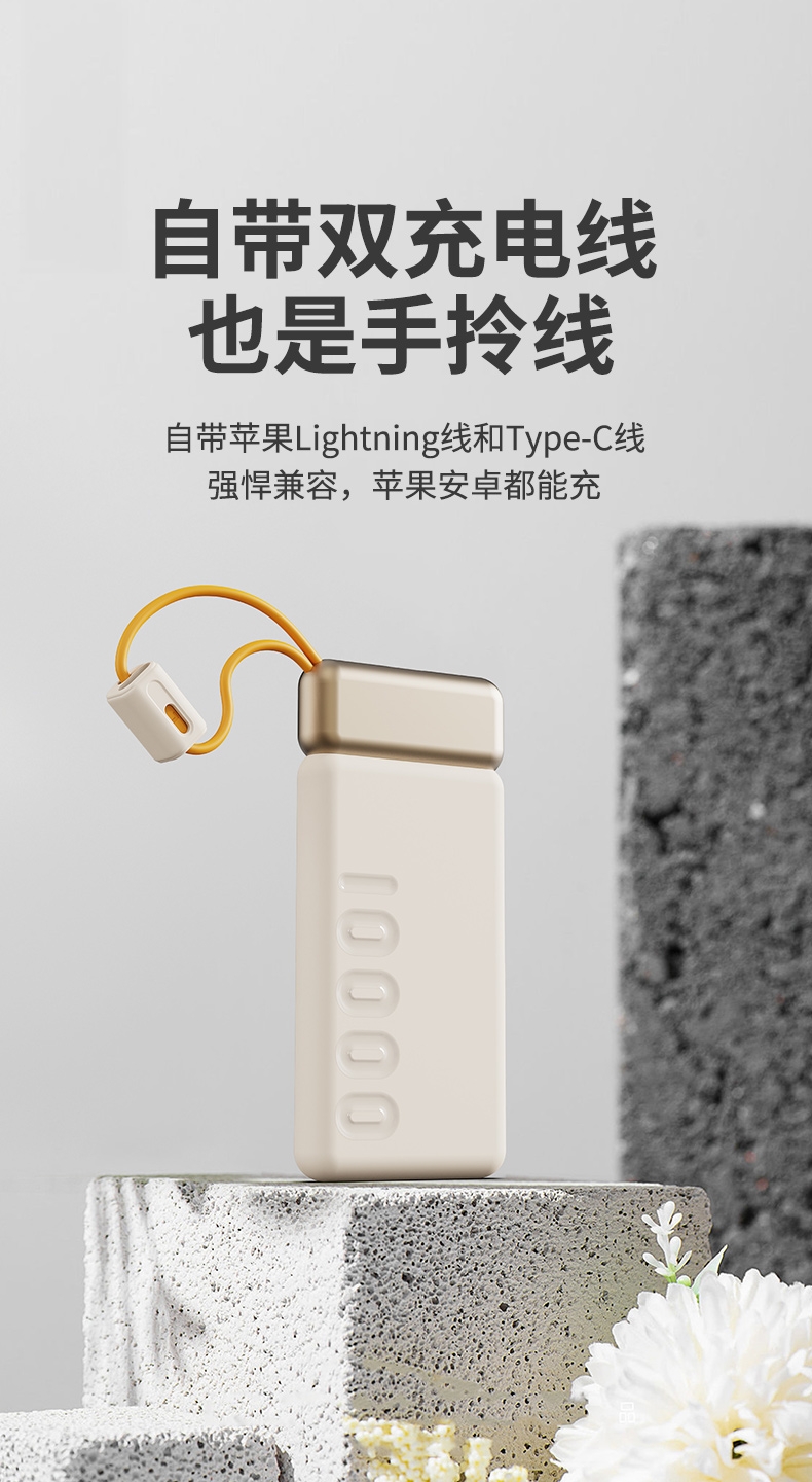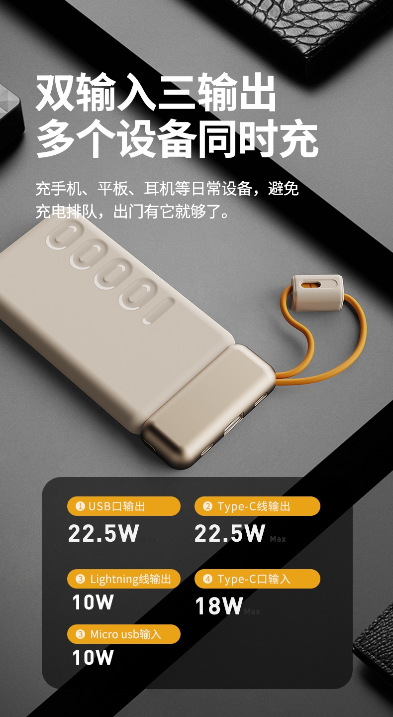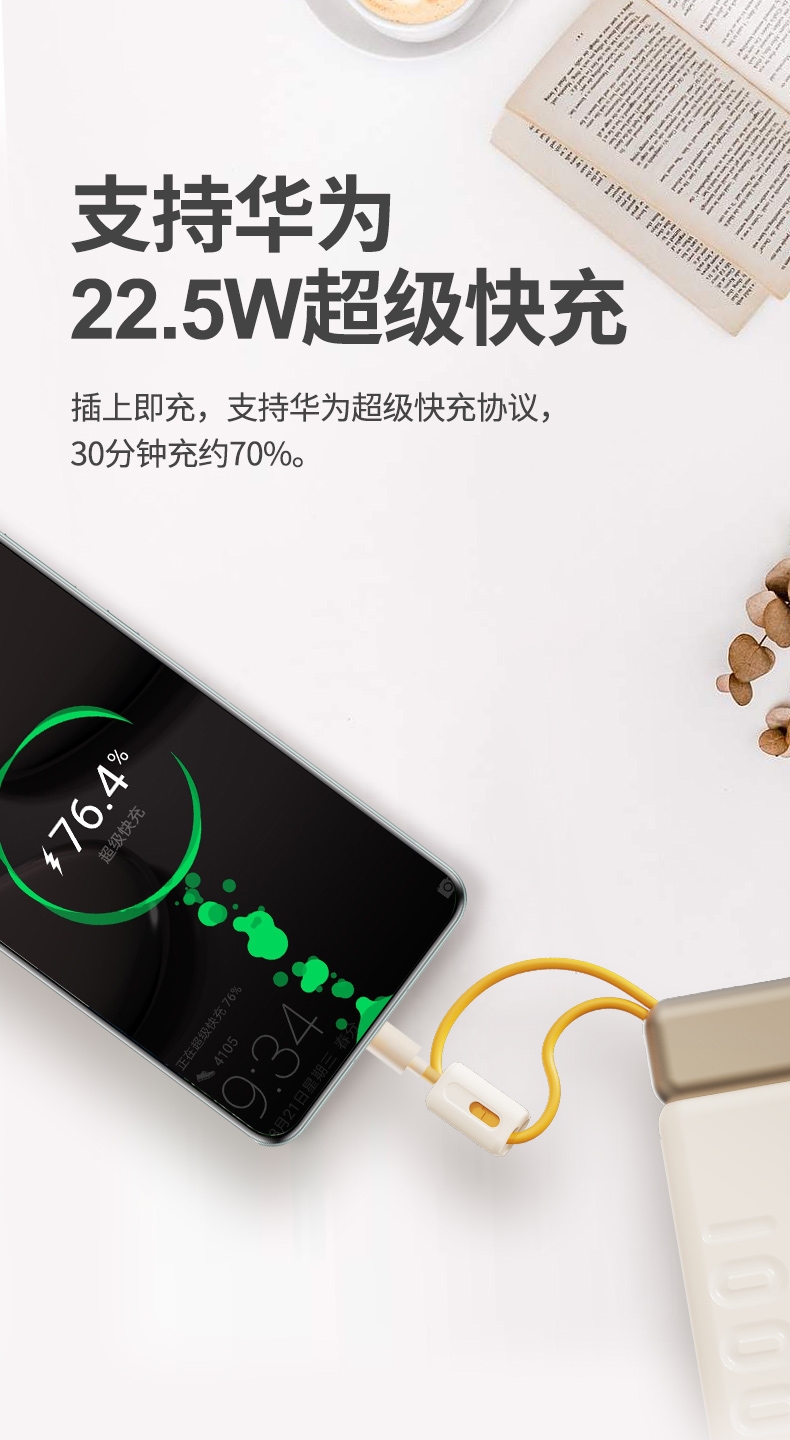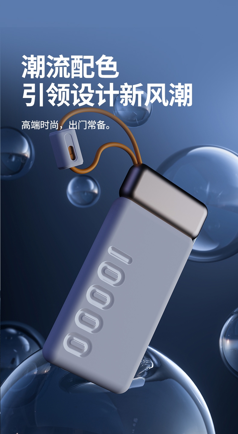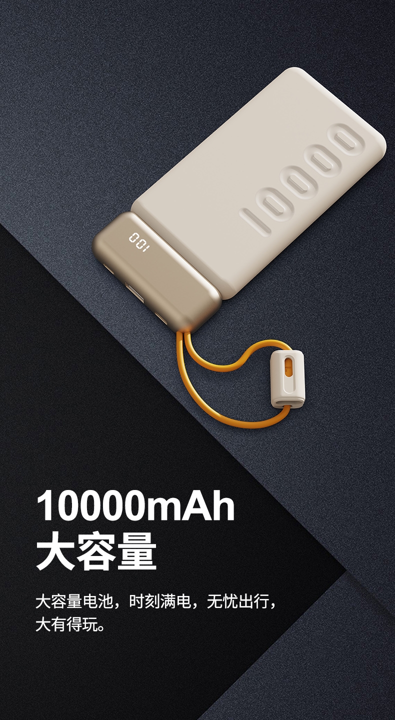 10000mAh高能锂电池,自带双线;LED电量显示;支持华为22.5W超级快充