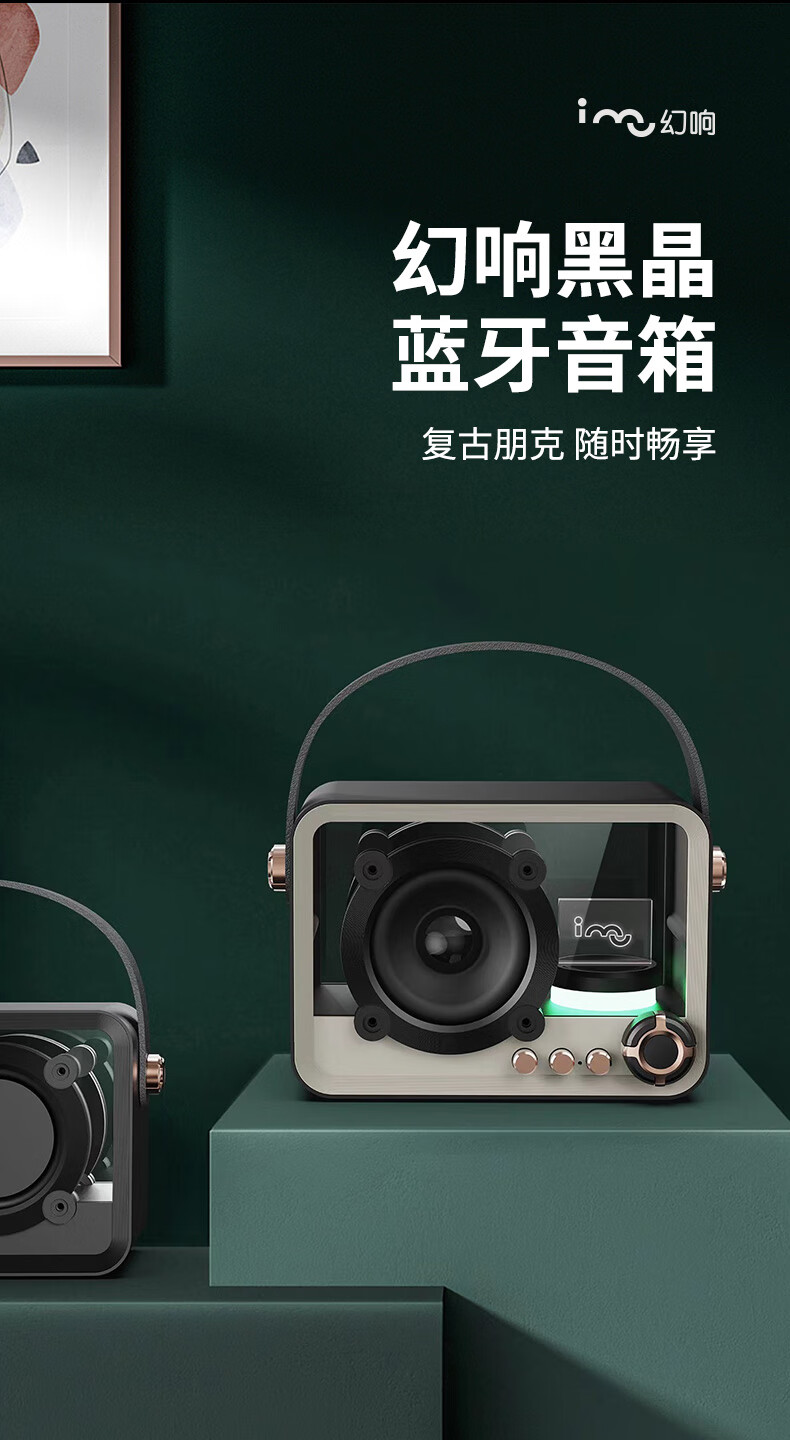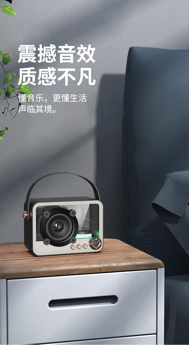 酷炫的透明外形,黑白经典配色;高品质内磁喇叭,让音质丰富细腻,自然通透;内置可定制LOGO铭牌,炫彩灯光随音乐闪烁