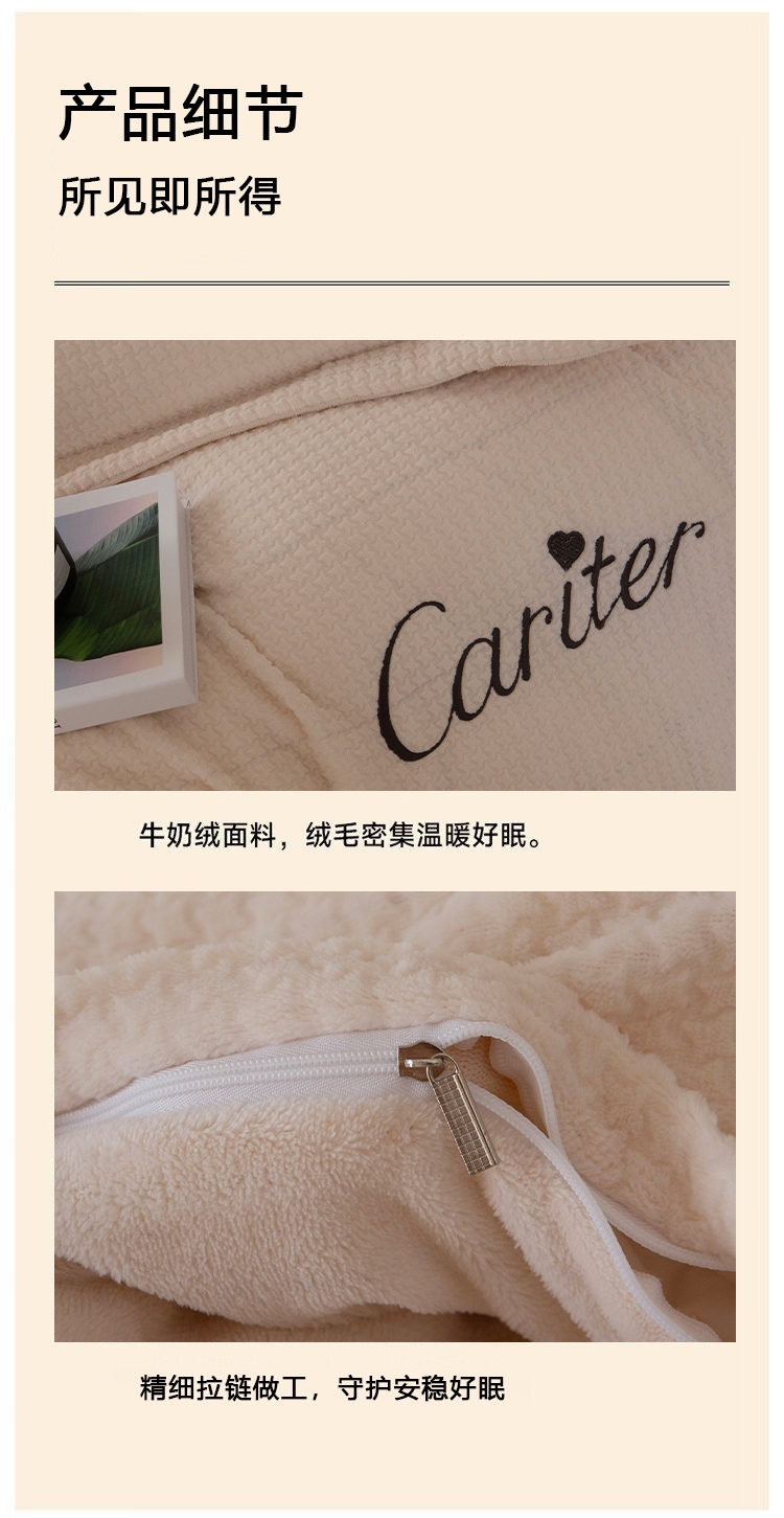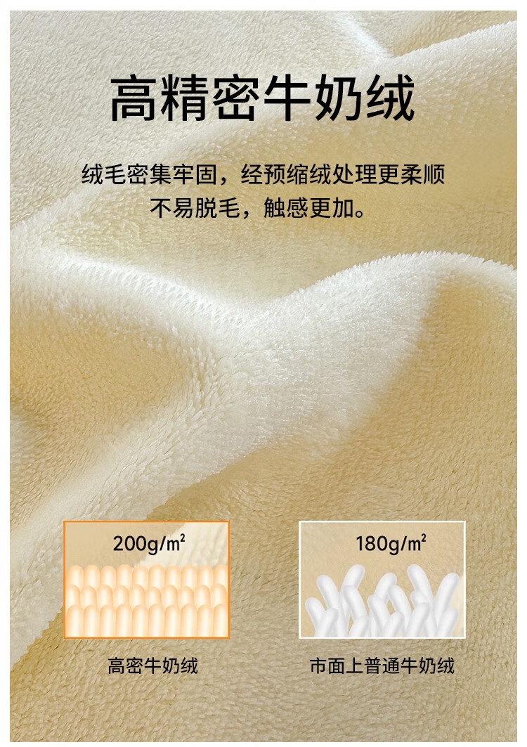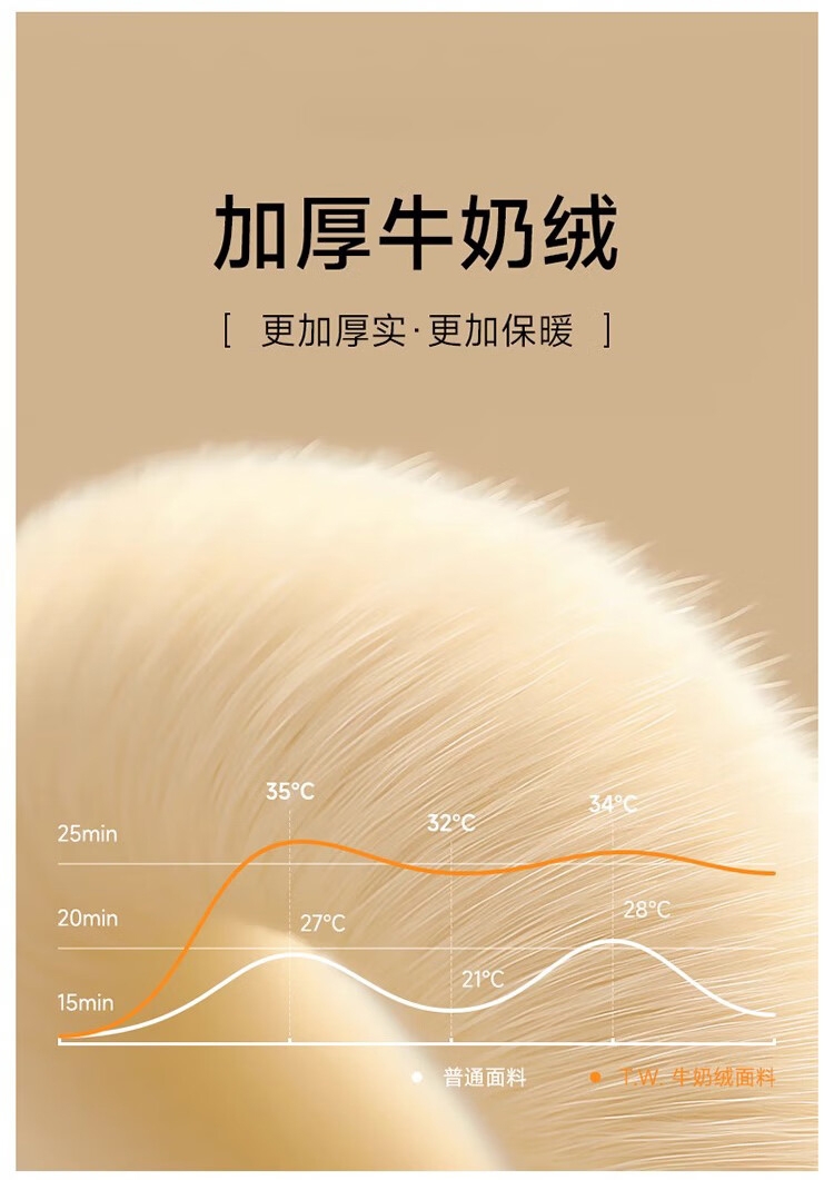 采用亲肤牛奶绒面料,表层绒毛细密软糯,触感舒适;牛奶绒面料纤维较小密度高,表面平滑细密,更保暖;做工精细,针脚细密,不易脱线,牢固耐用
