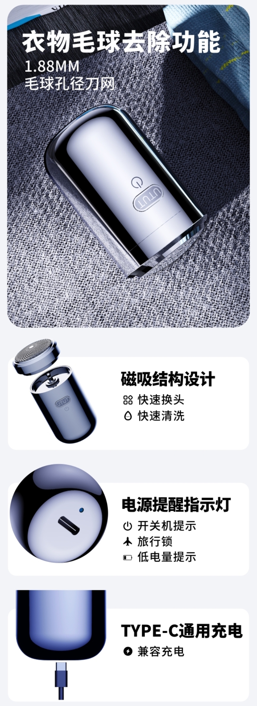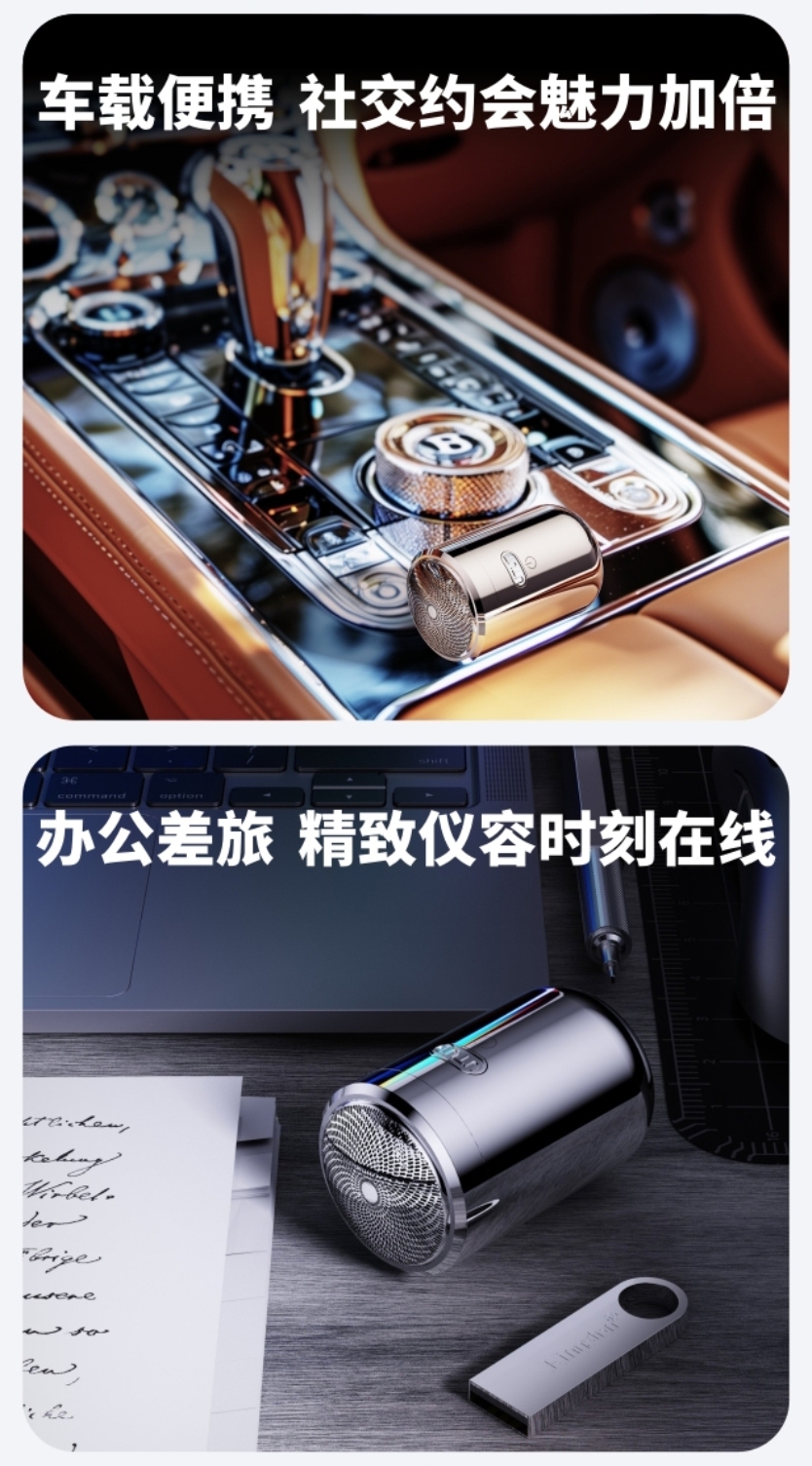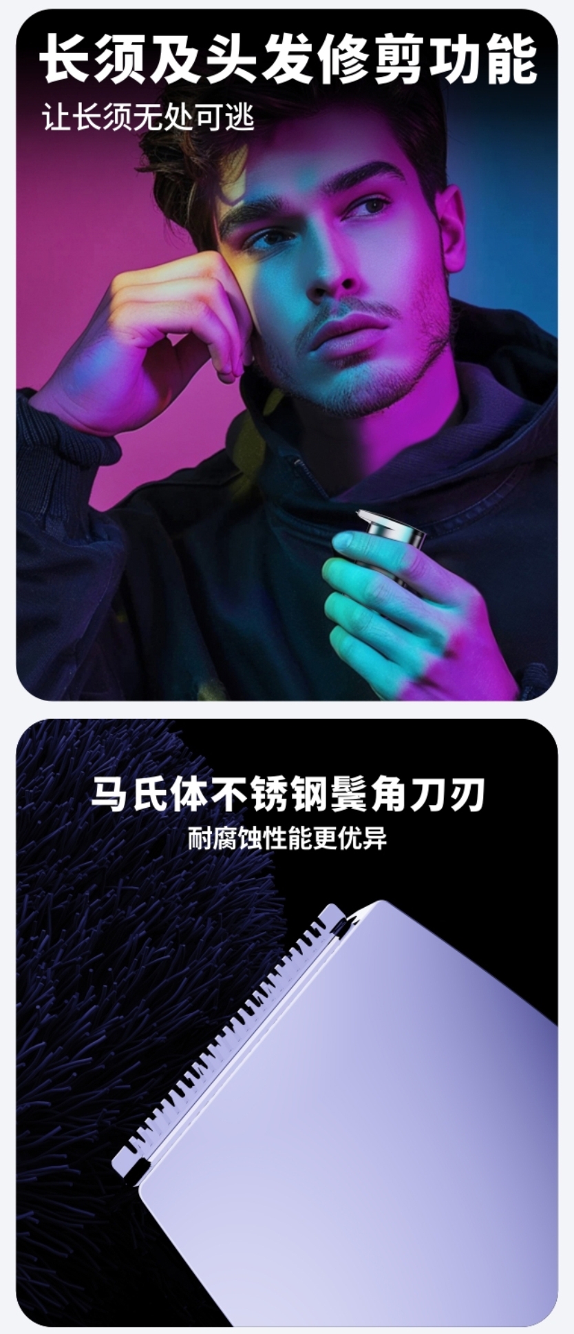 特色功能:磁吸刀头,鬓角修剪,可水洗,浮动刀头,干湿两用式,便携