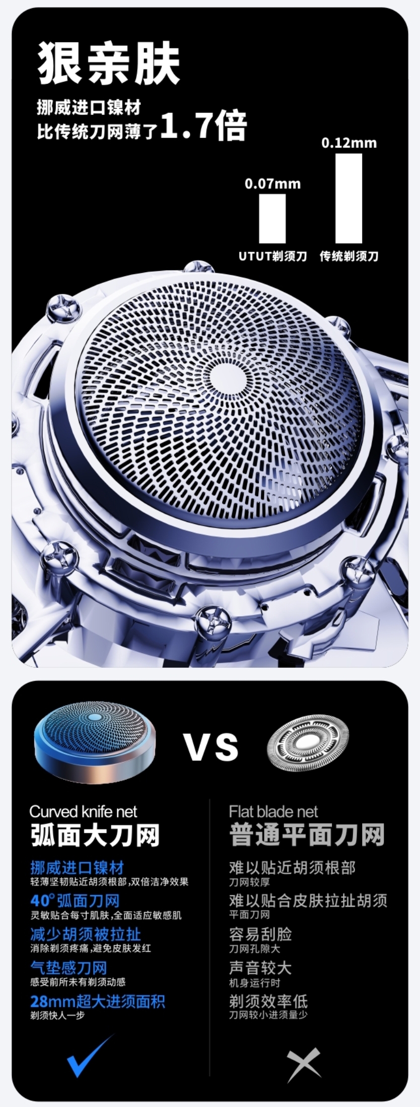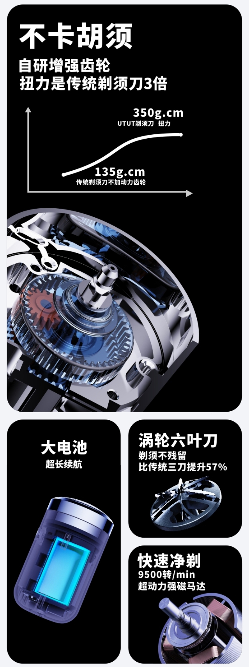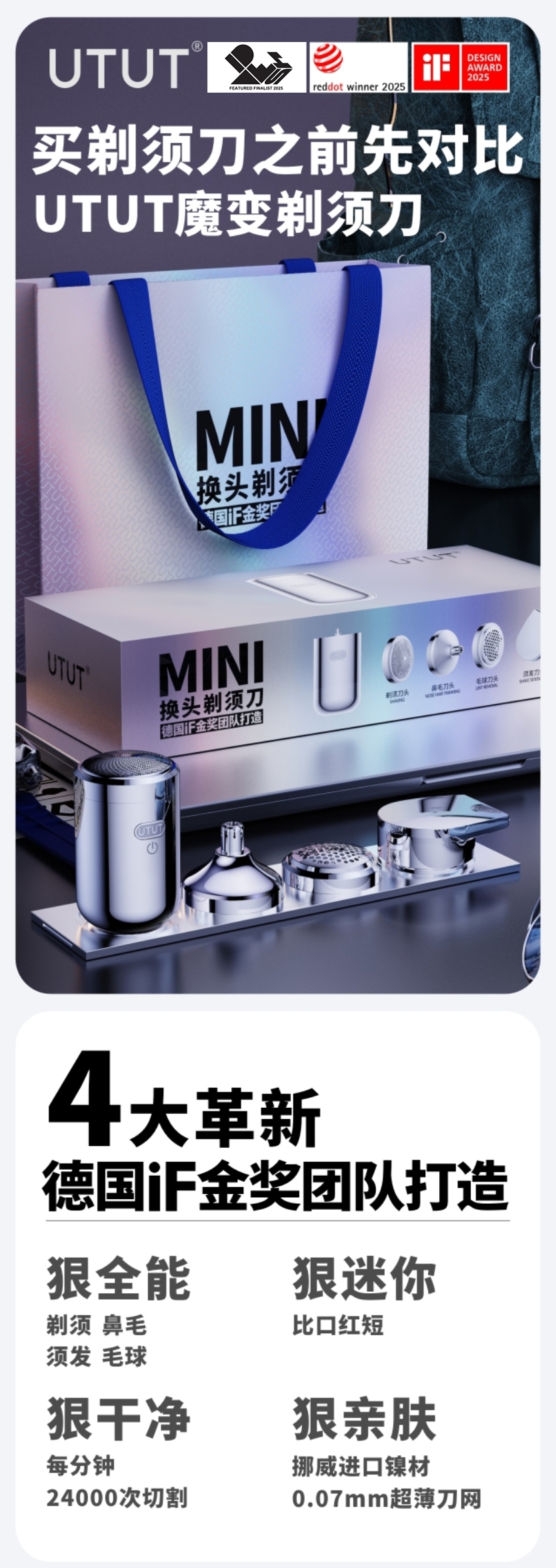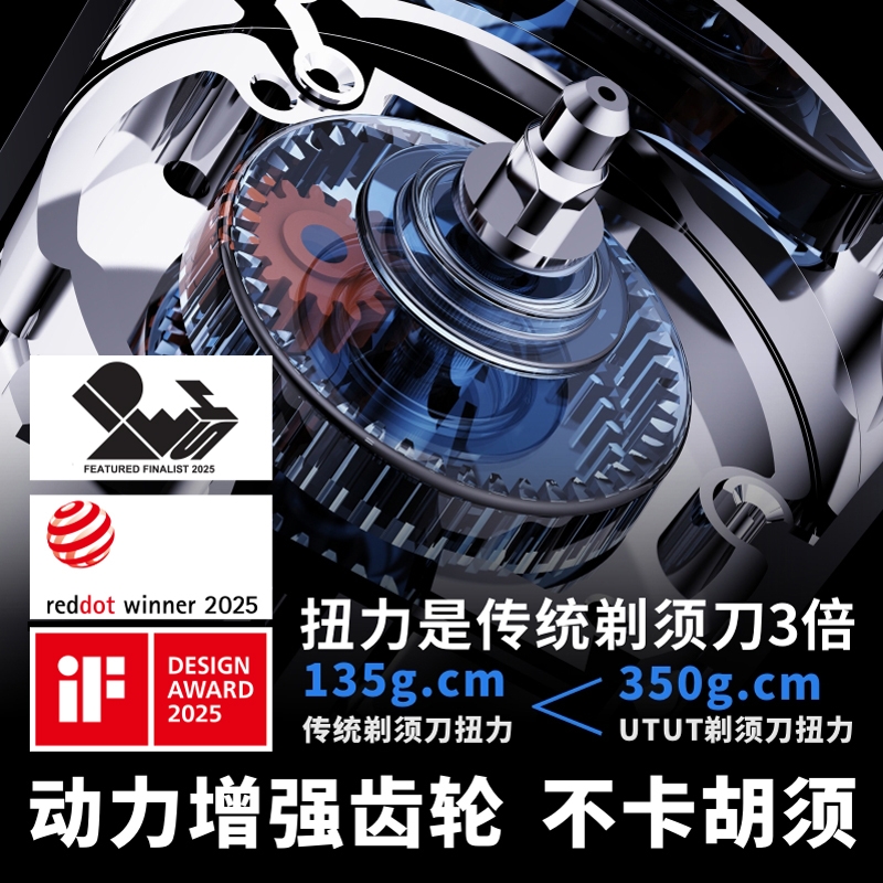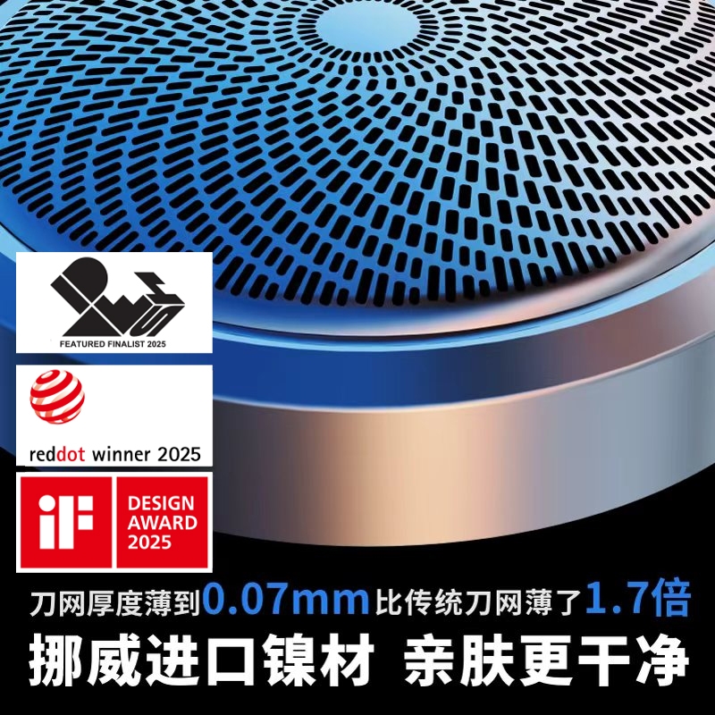 德国iF金奖团队打造,一机四用;挪威进口刀网,剃须直达胡须根部,刮胡须更干净;全球首个包揽国际前三设计大奖,美学极致体验;金属机身,差旅便携,全身水洗,充电可用90h;自研3倍扭力齿轮,扭力是市场剃须刀3倍,刮胡须更快