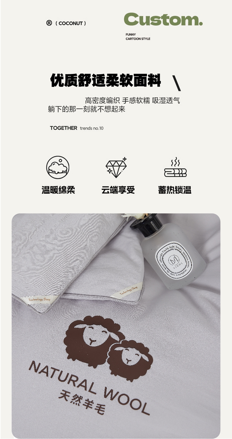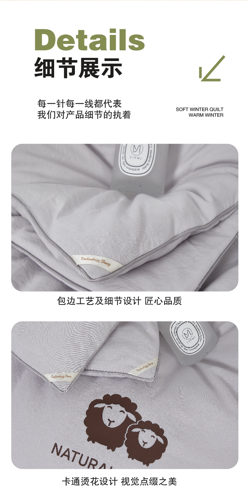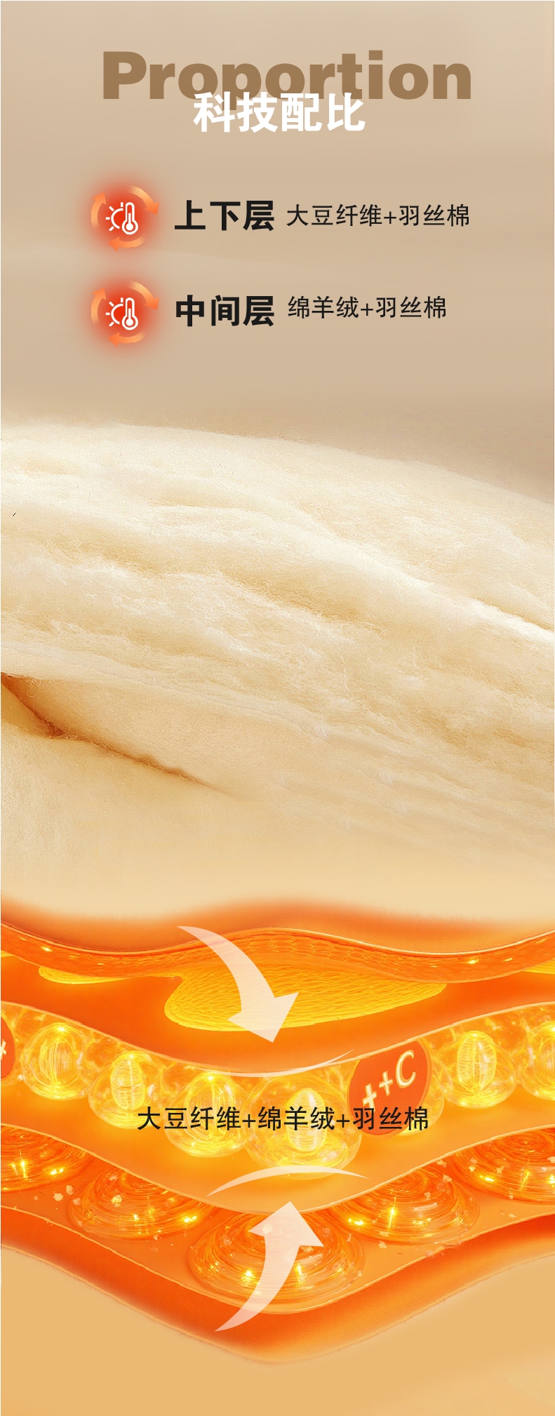 填充:上下层--10%大豆纤维、90%聚酯纤维 中间层--51%绵羊绒、49%聚酯纤维