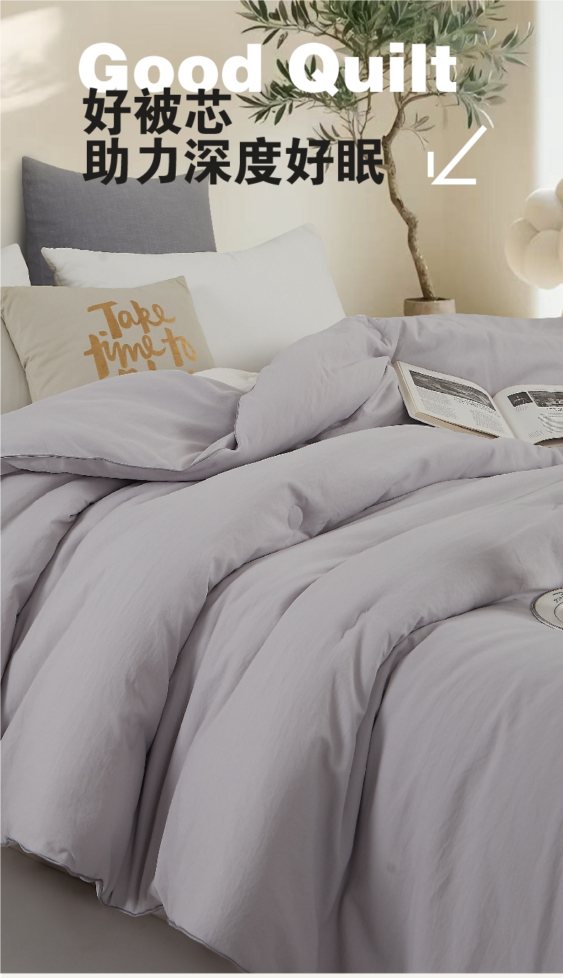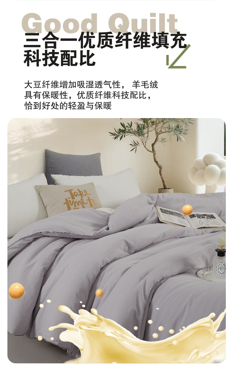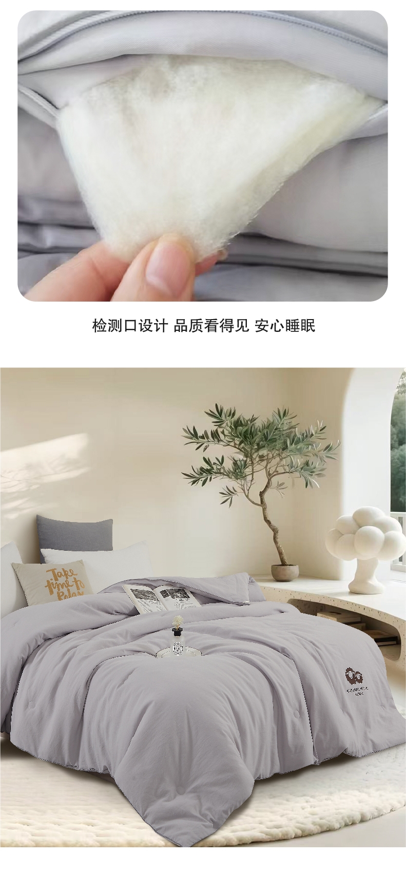 填充:上下层--10%大豆纤维、90%聚酯纤维 中间层--51%绵羊绒、49%聚酯纤维