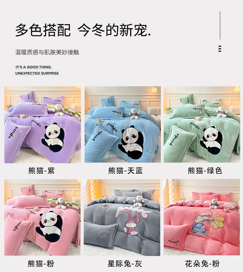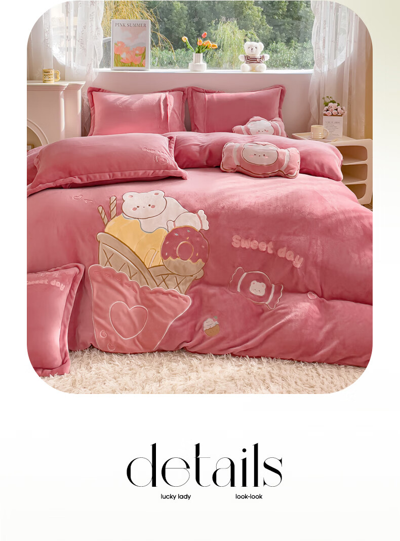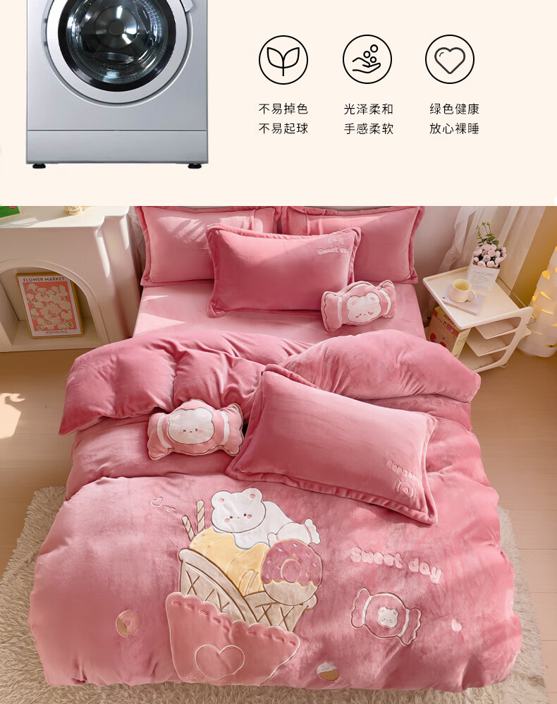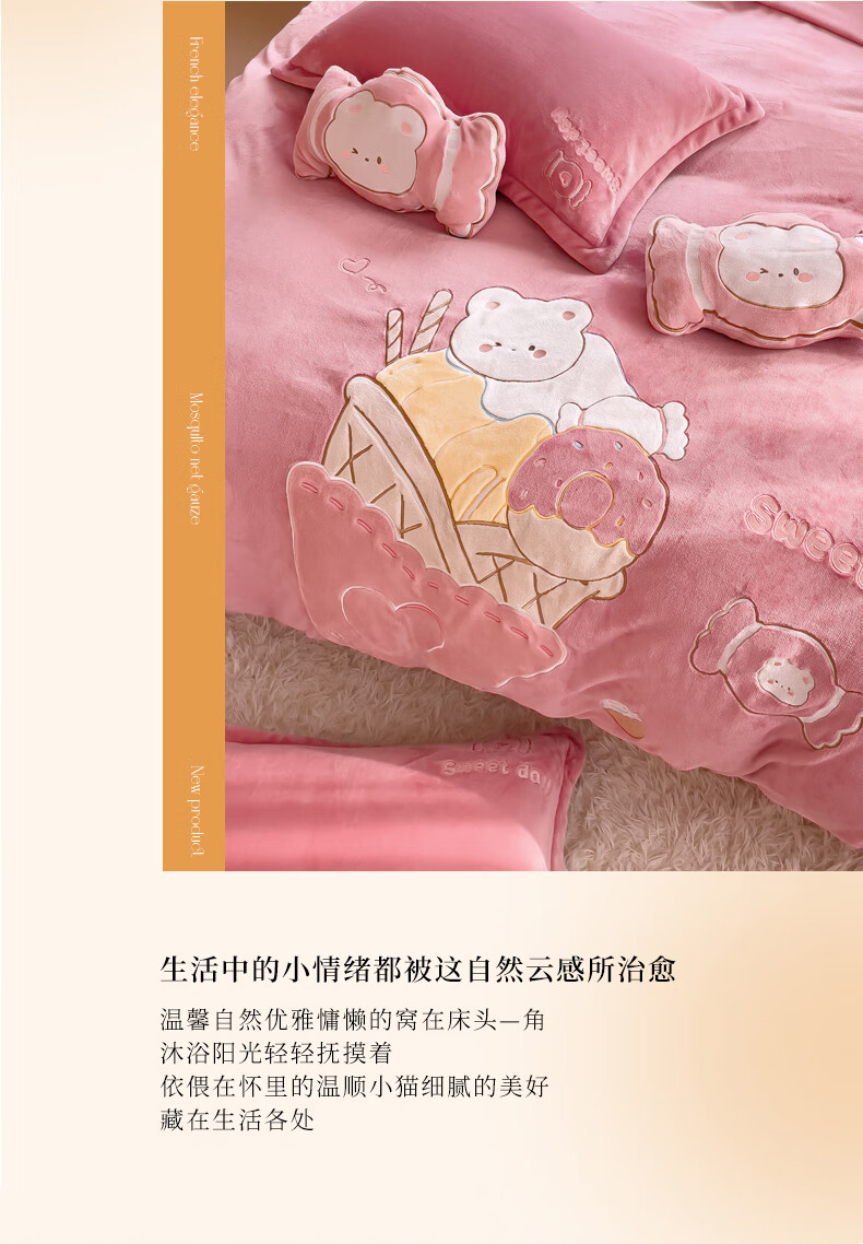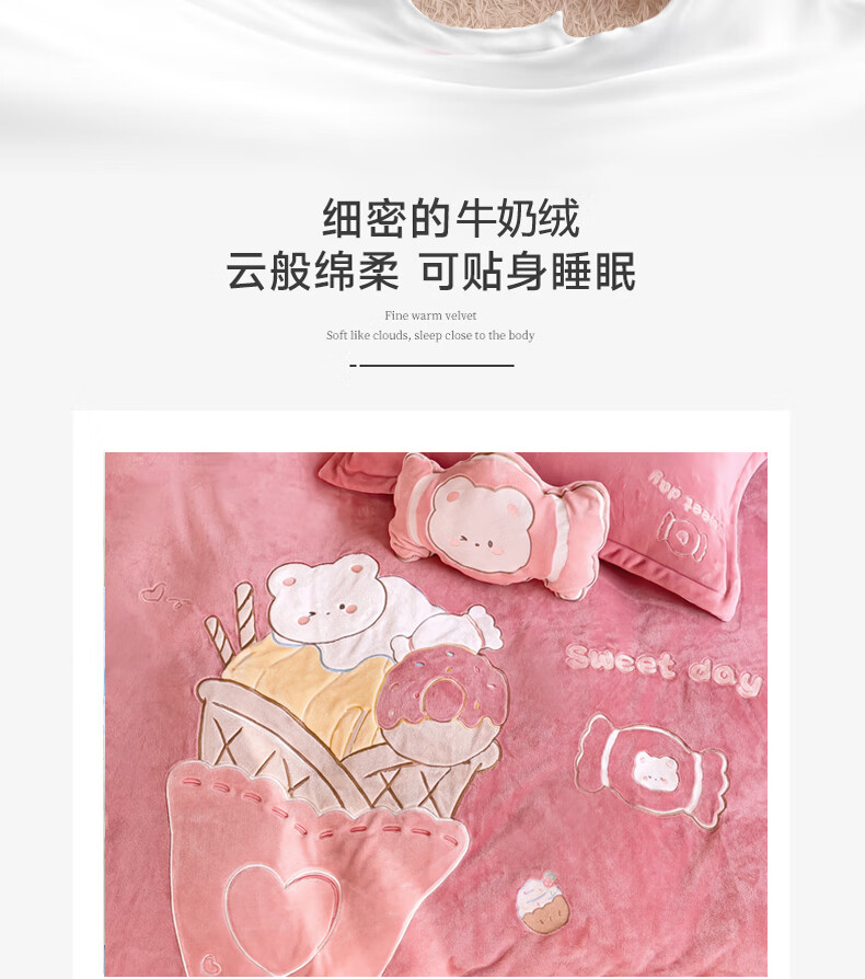 拒绝单调,精选贴布绣萌趣卡通图案,立体有趣!;牛奶绒的 “云朵触感”,秋冬保暖不凉身!;细节藏着用心,耐用又好打理,添加导电丝,不起静电。