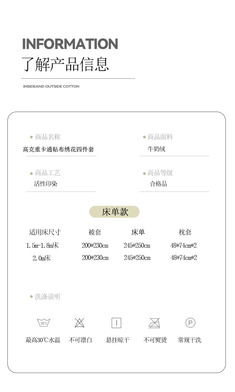 尺寸:1.5M-1.8M床适用 被套200*230cm 床单245*250cm 枕套48*74cm