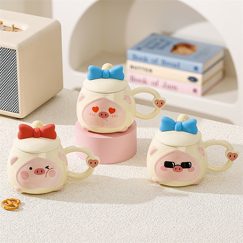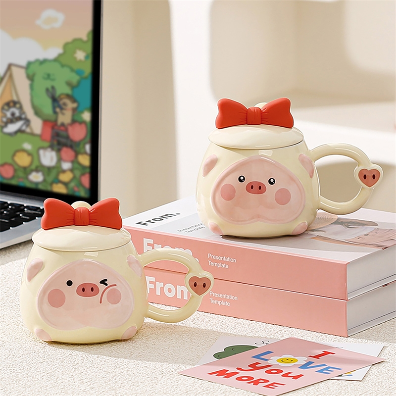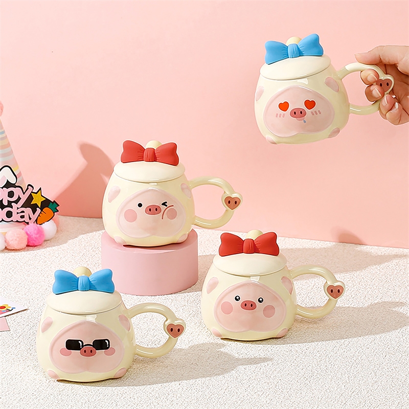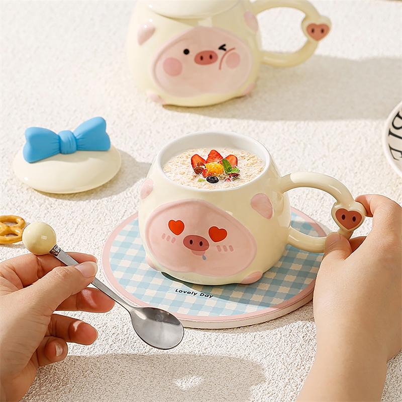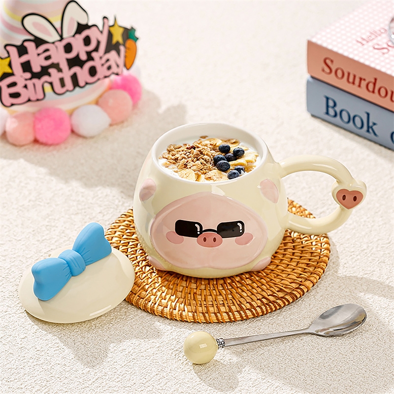 可爱猪猪表情包;高温烧制,贴花工艺;含蝴蝶结硅胶陶瓷盖子含不锈钢勺