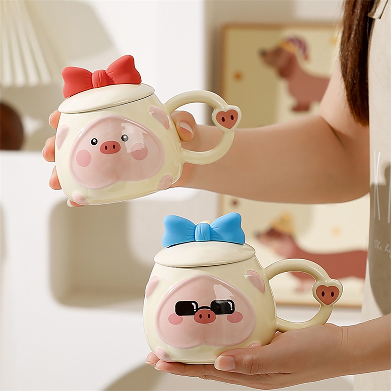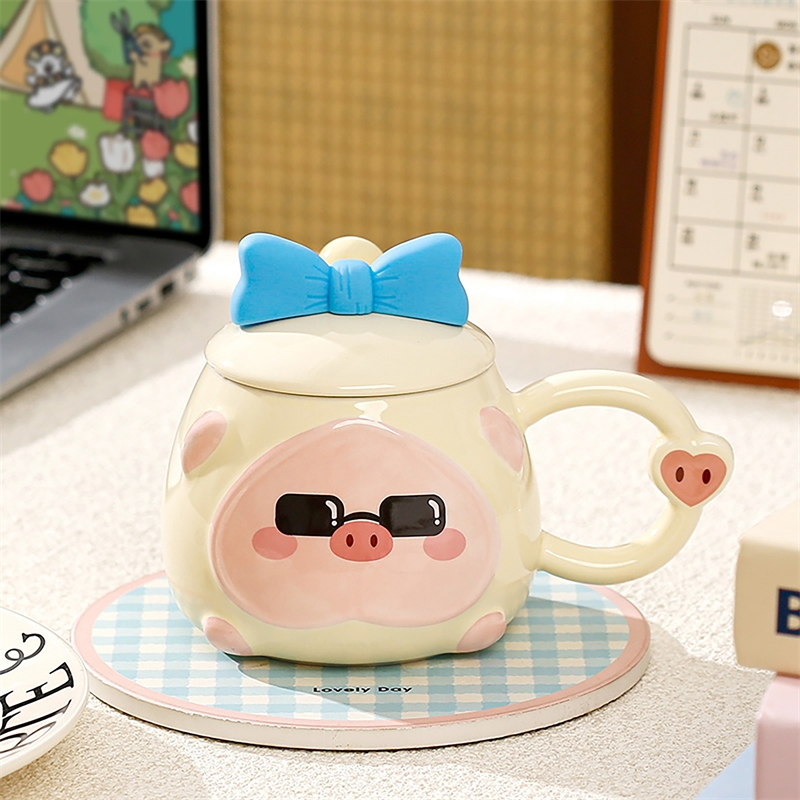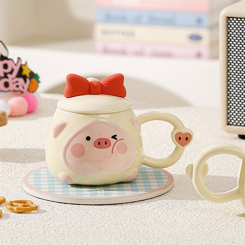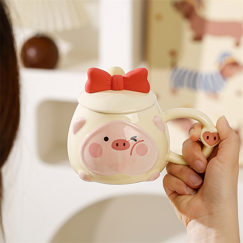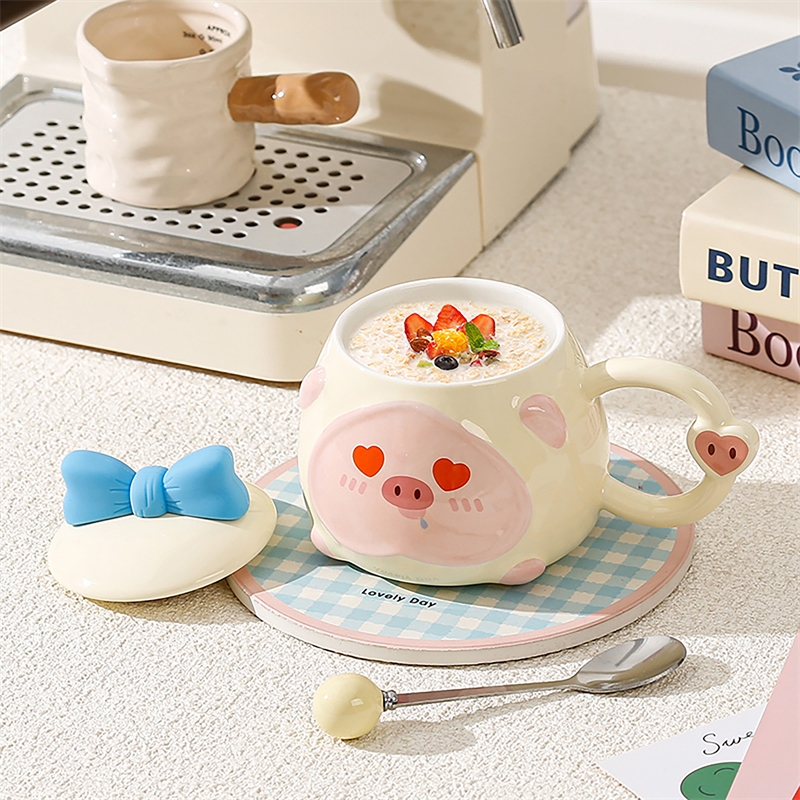 可爱猪猪表情包;高温烧制,贴花工艺;含蝴蝶结硅胶陶瓷盖子含不锈钢勺