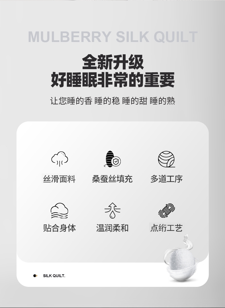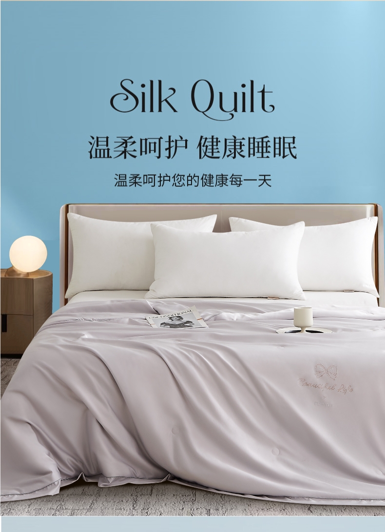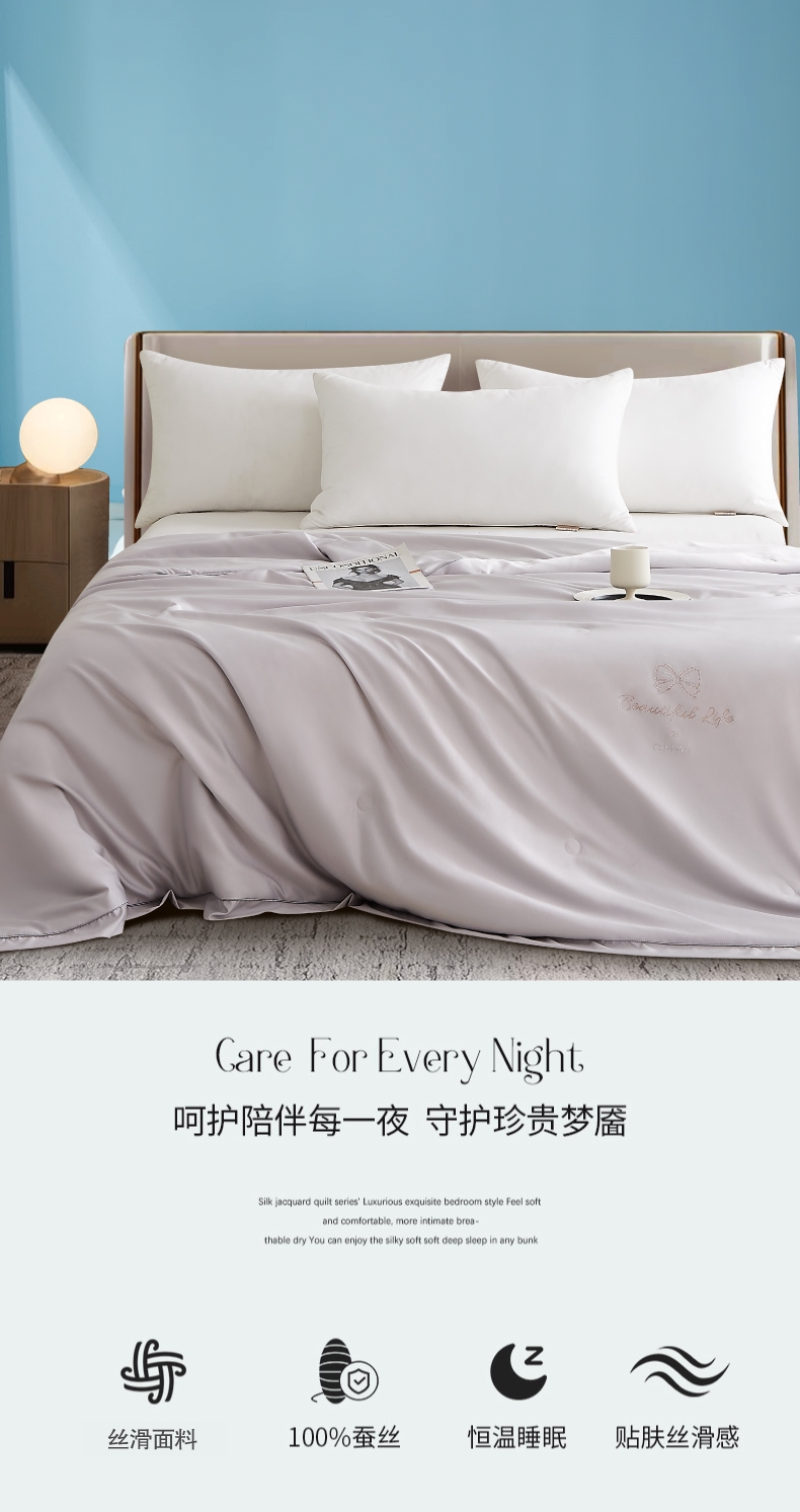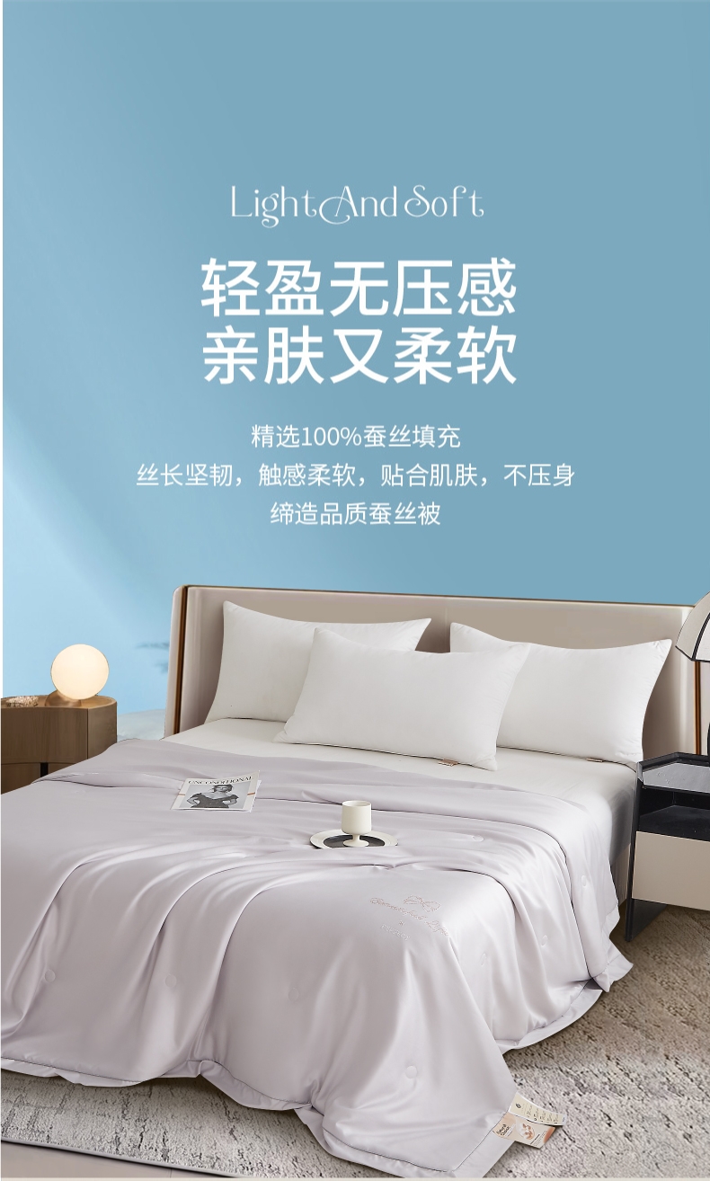 丝滑水光缎面料,柔软凉爽、顺滑的质感;特有宽边设计、被角处烫钻点缀;奢享桑蚕丝填充,满足高端礼品需求