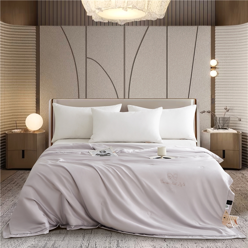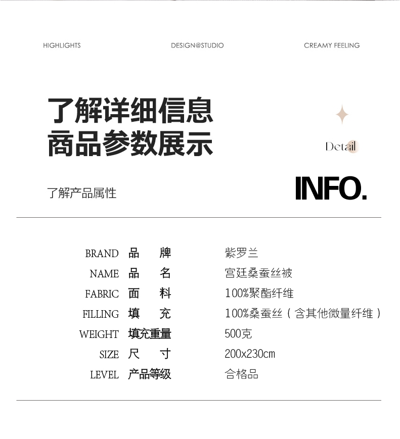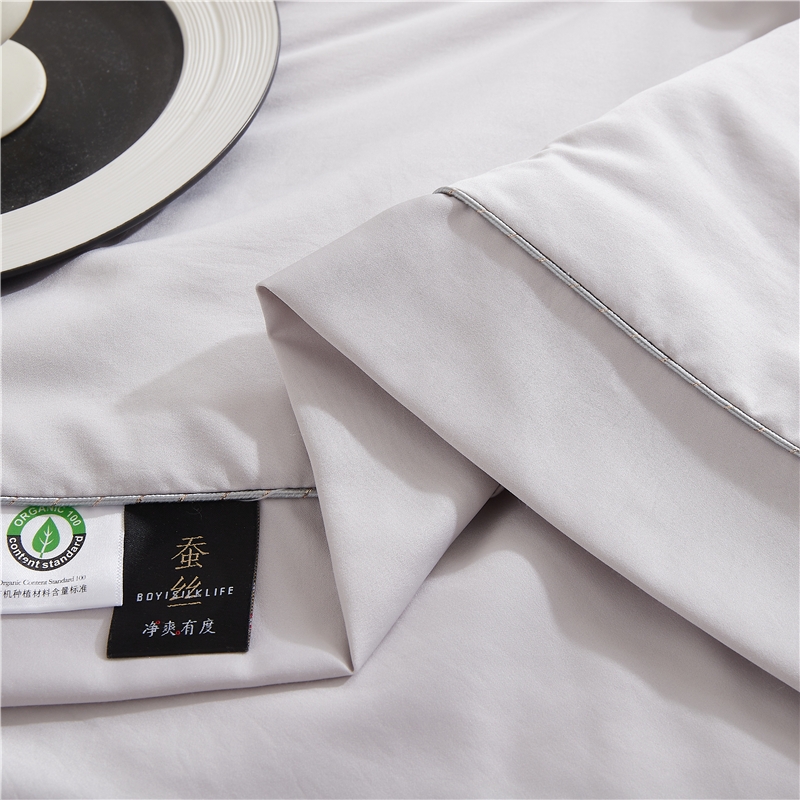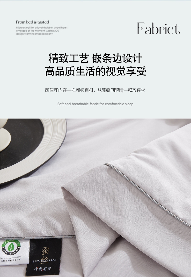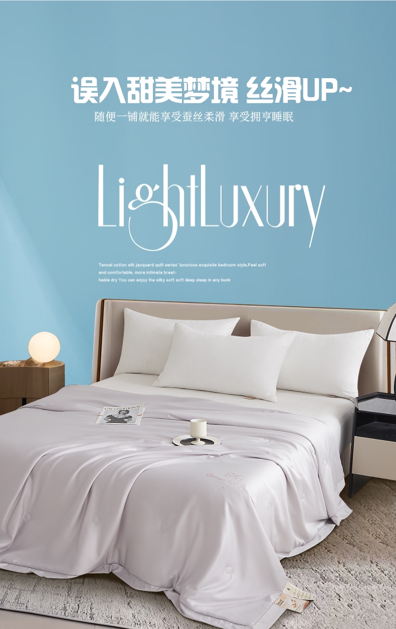 丝滑水光缎面料,柔软凉爽、顺滑的质感;特有宽边设计、被角处烫钻点缀;奢享桑蚕丝填充,满足高端礼品需求