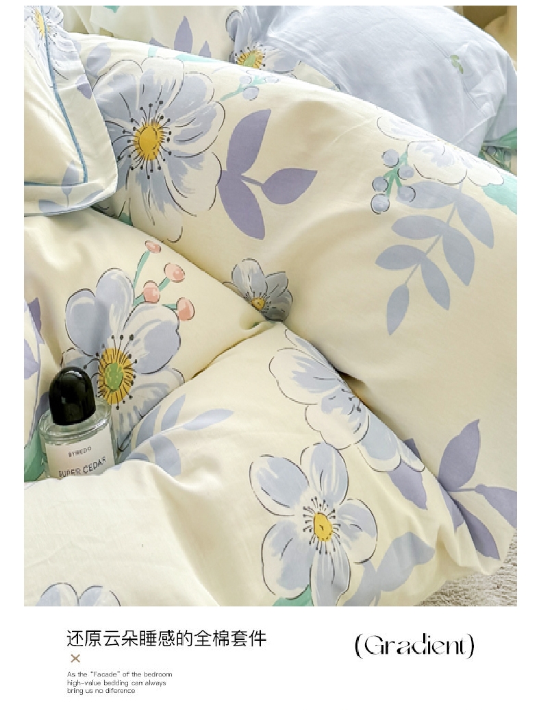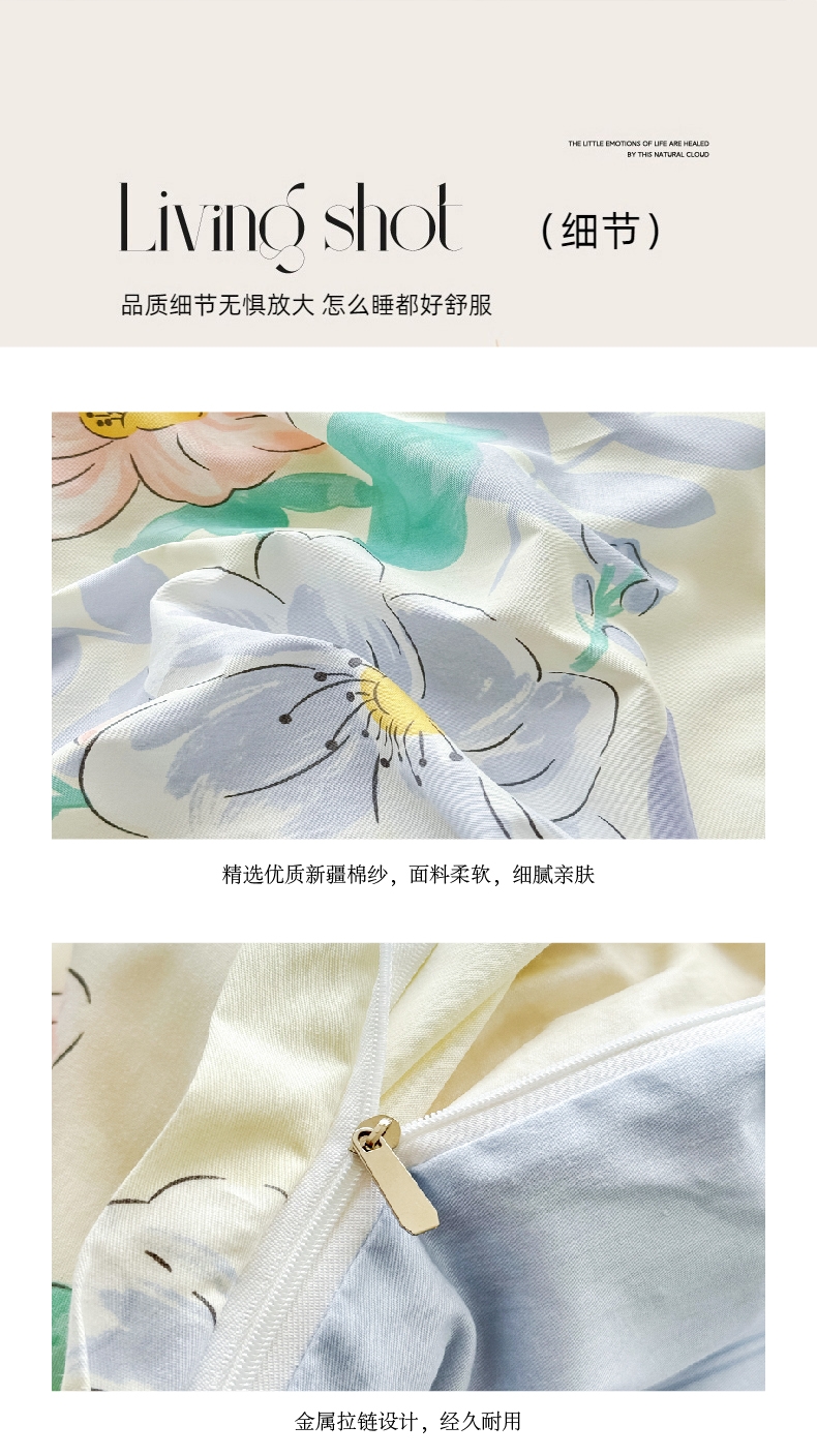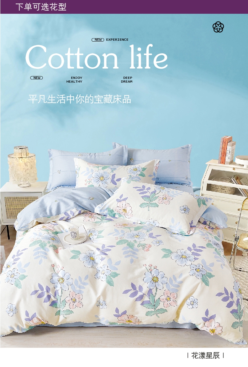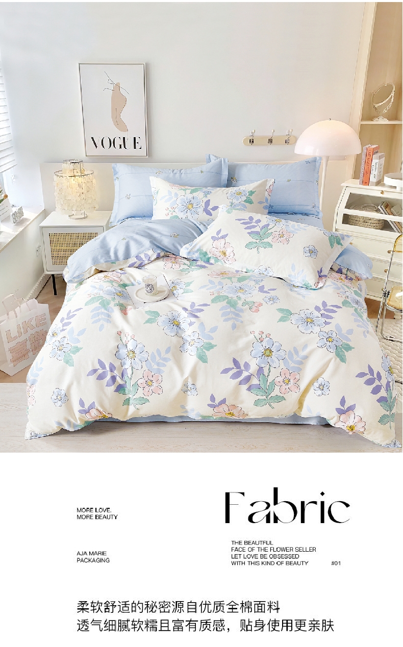 精选优质新疆棉纱、喷气织造,面料柔软度较好;被套枕套全工艺整烫、预缩水处理;天地盖礼盒包装,适合各类礼品需求场景