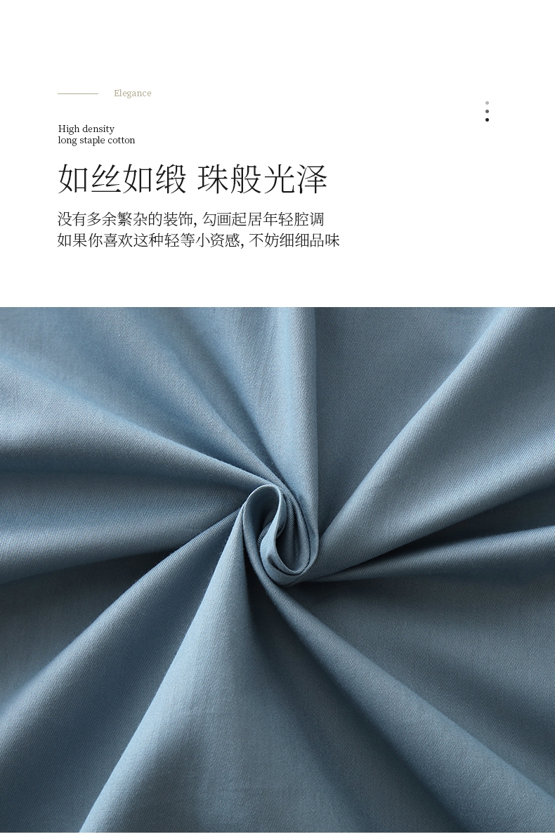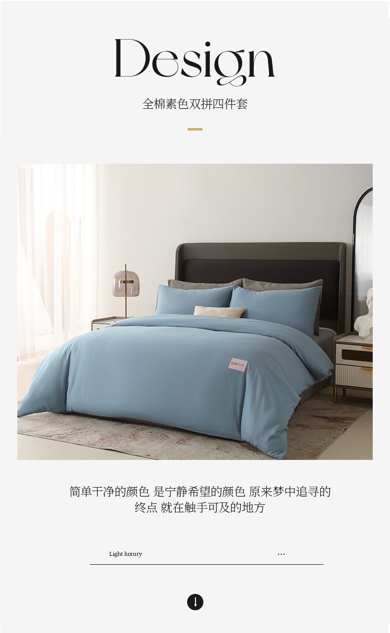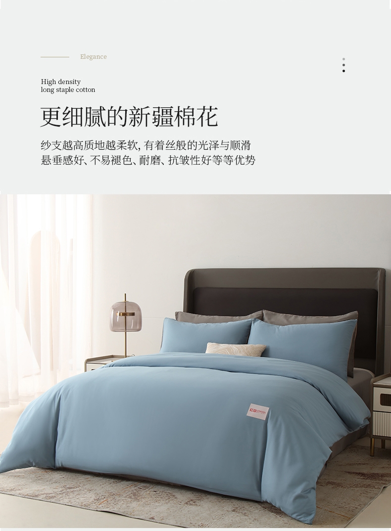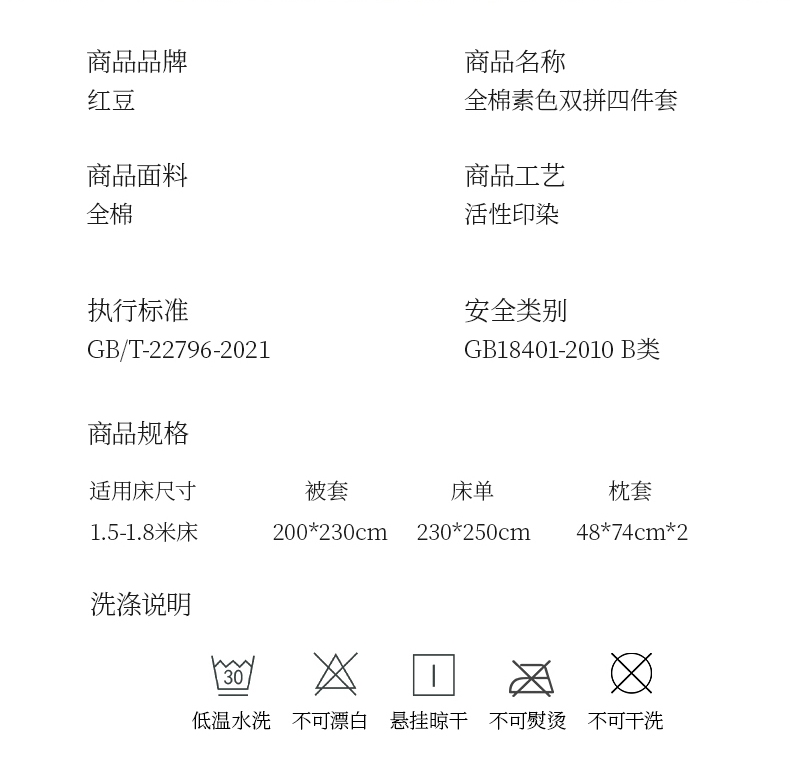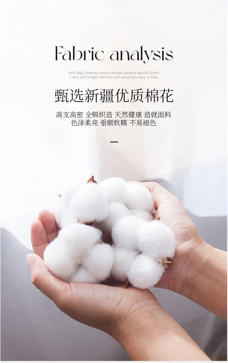 甄选新疆优质棉花,健康活性印染;质朴纯色双拼设计简约而不简单;赋予面料柔软细腻的触感体验;时尚颜值更有内涵