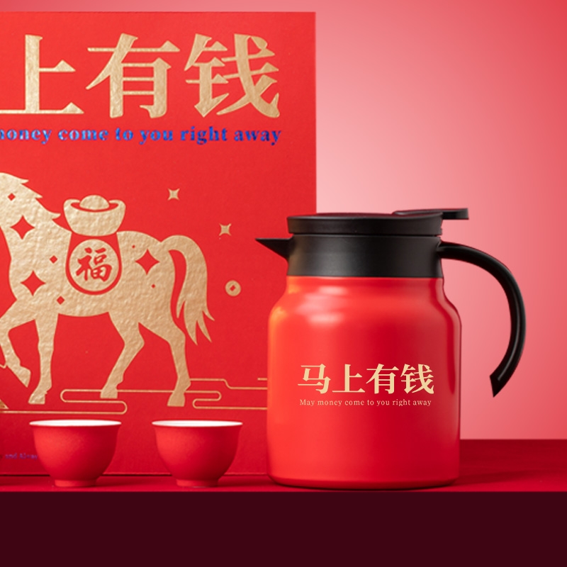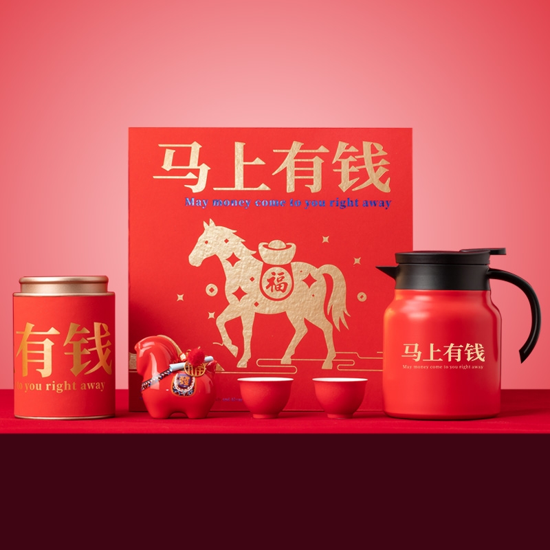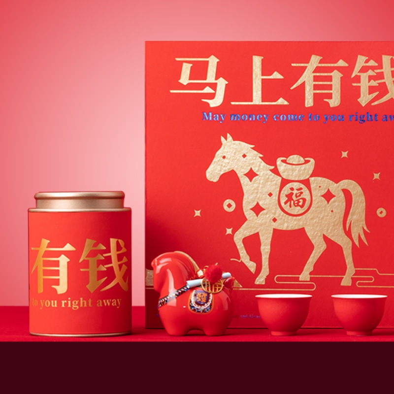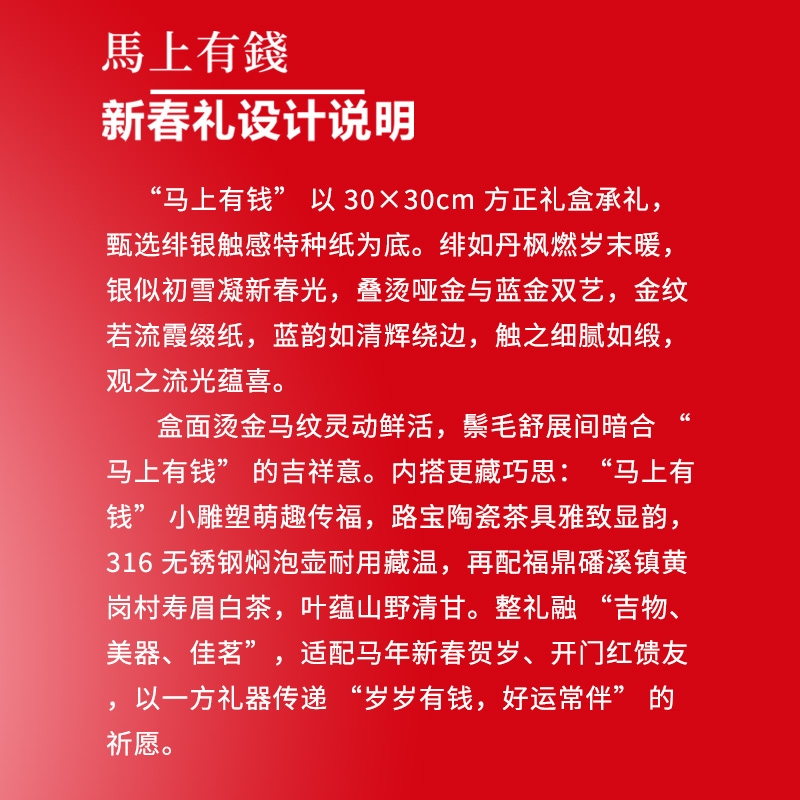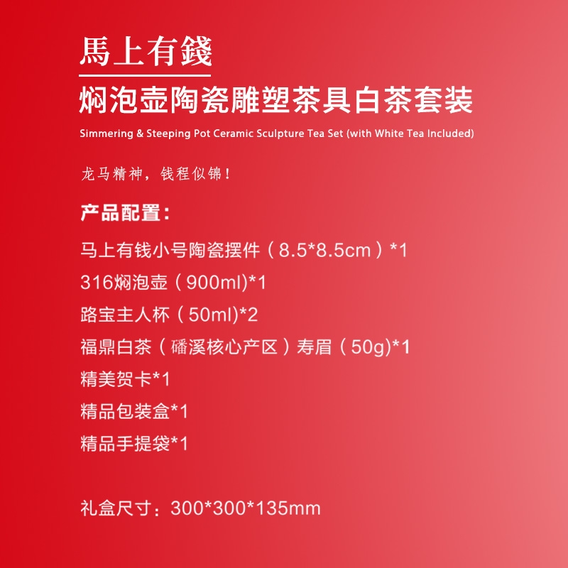 马上有钱寓意,龙马精神钱程似锦;焖泡壶 + 陶瓷雕塑 + 白茶,品类丰富;福鼎潘溪核心区寿眉,茶叶优质;精美包装 + 贺卡手提袋,礼赠体面;茶具实用,摆件有寓意,茶品可品
