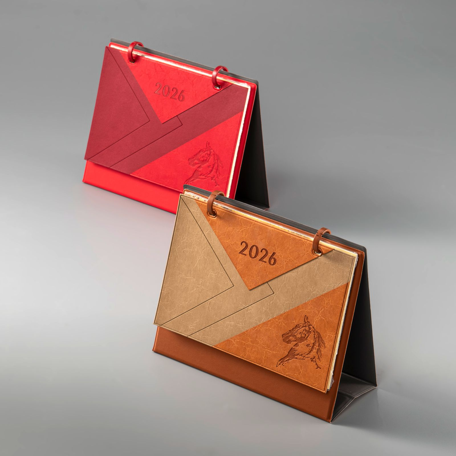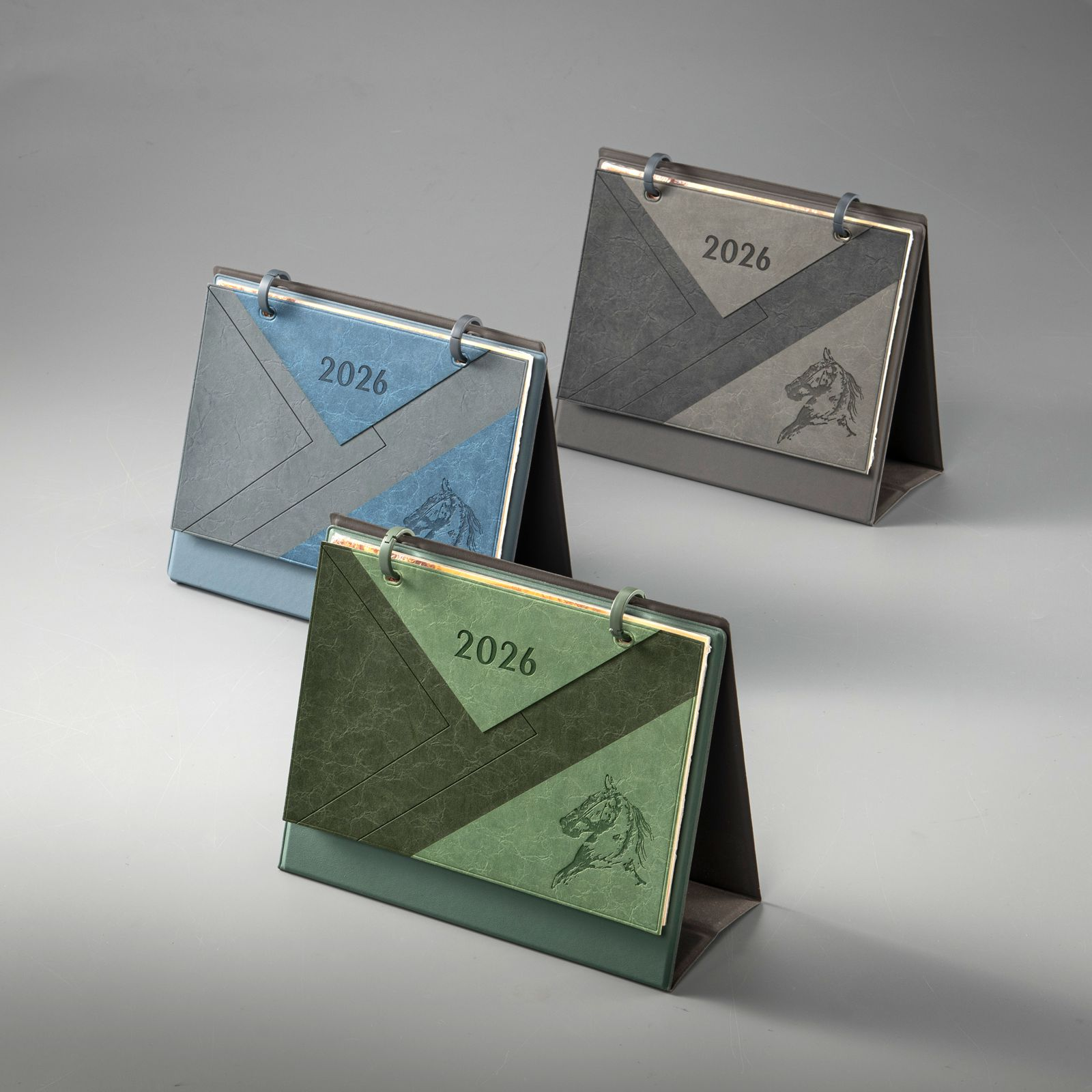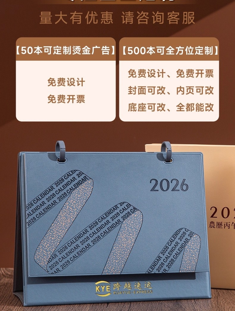 配置:金属烤漆台历环、12张内页(;内容有可书写记录月计划)、皮质台历架、;皮质封面(可按要求定制内容)、白卡纸盒。