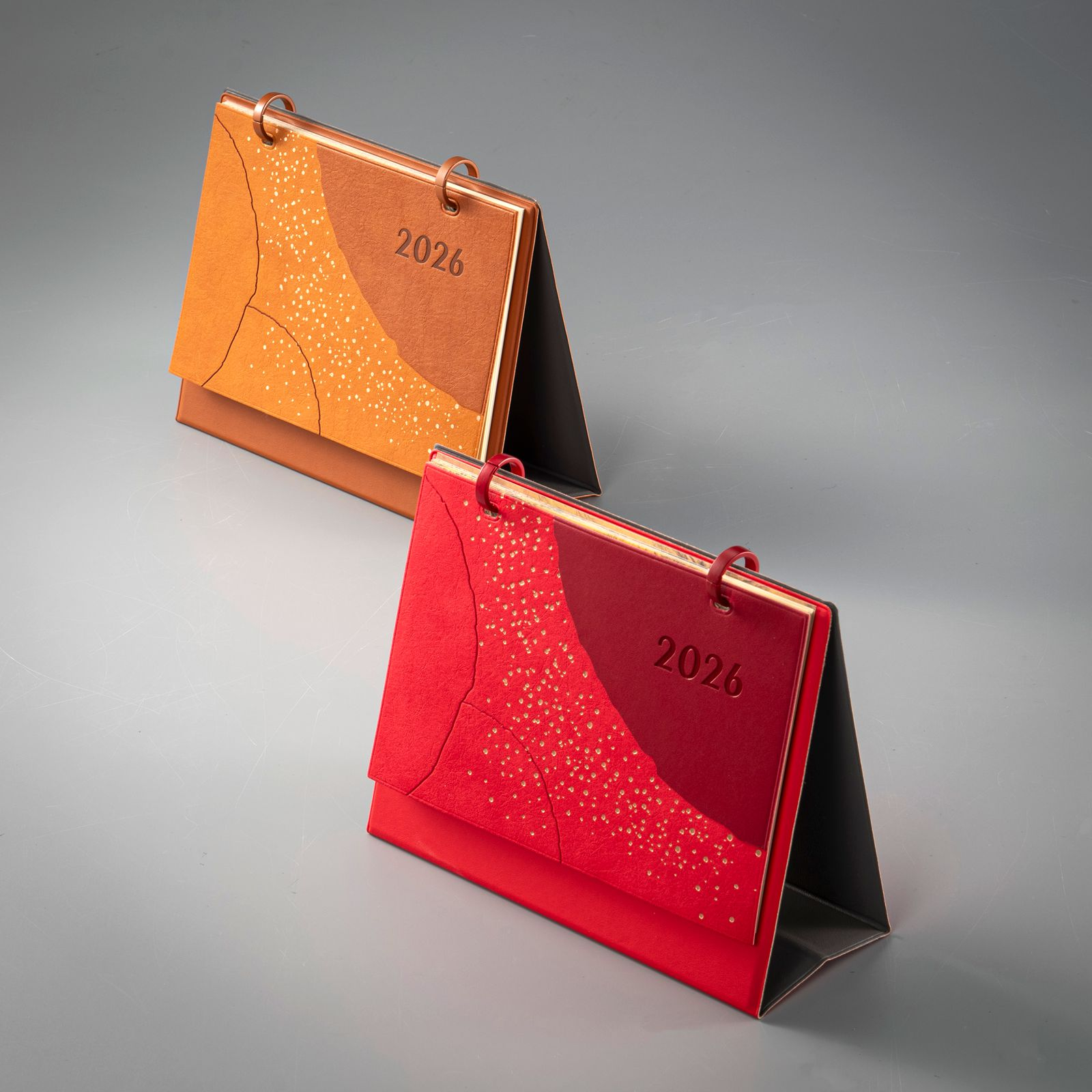 配置:金属烤漆台历环、;12张内页(内容有可书写记录月计划);、皮质台历架、皮质封面;(可按要求定制内容)、白卡纸盒。