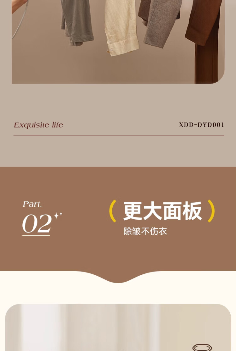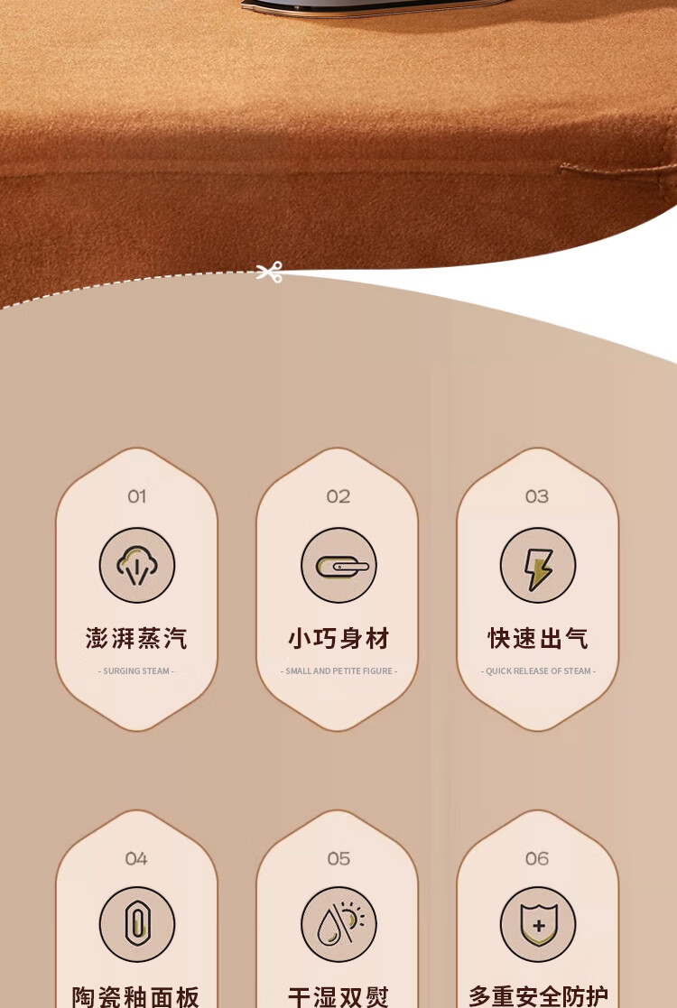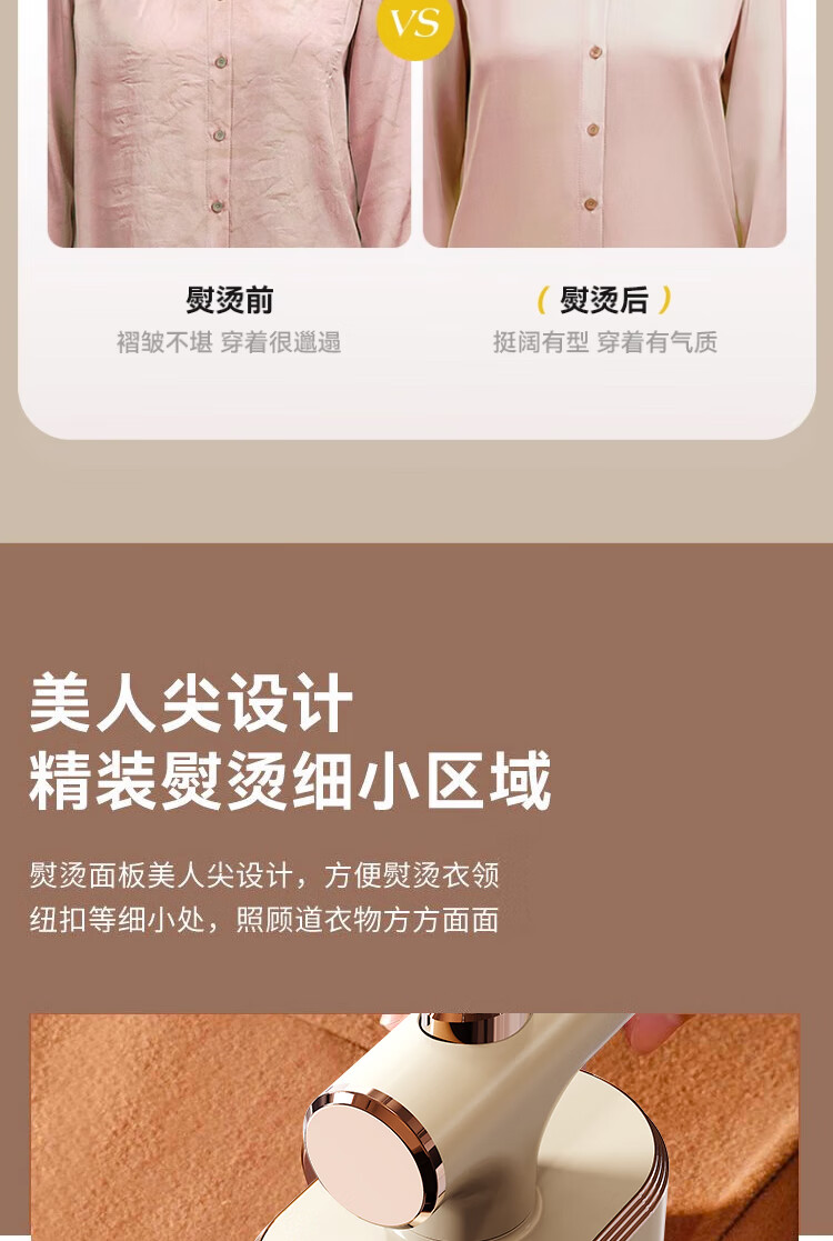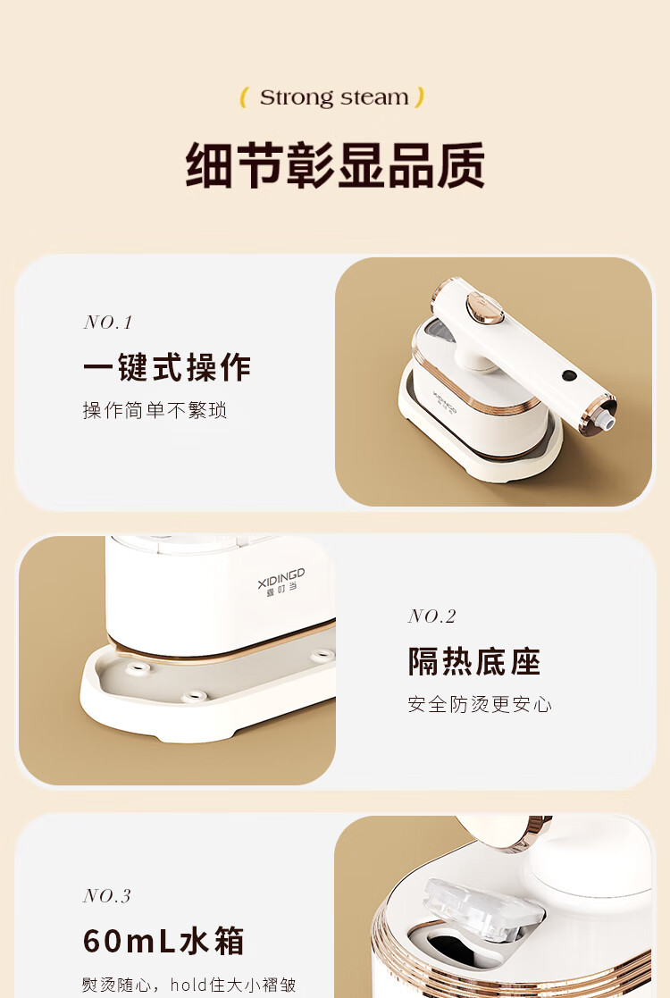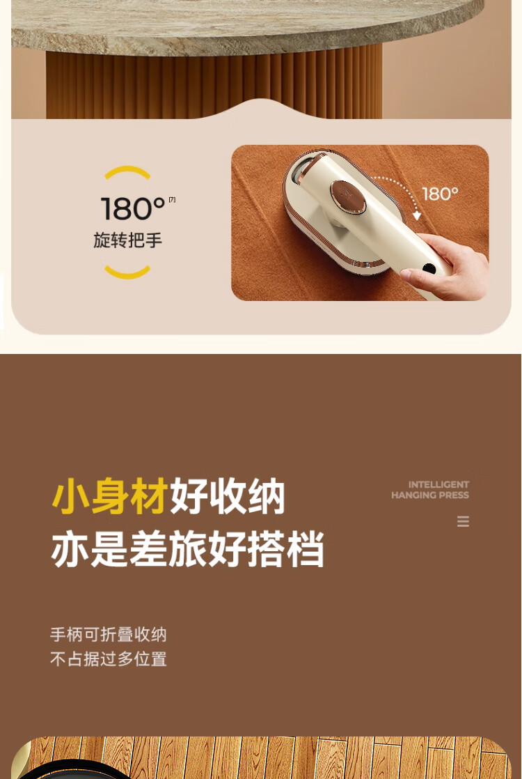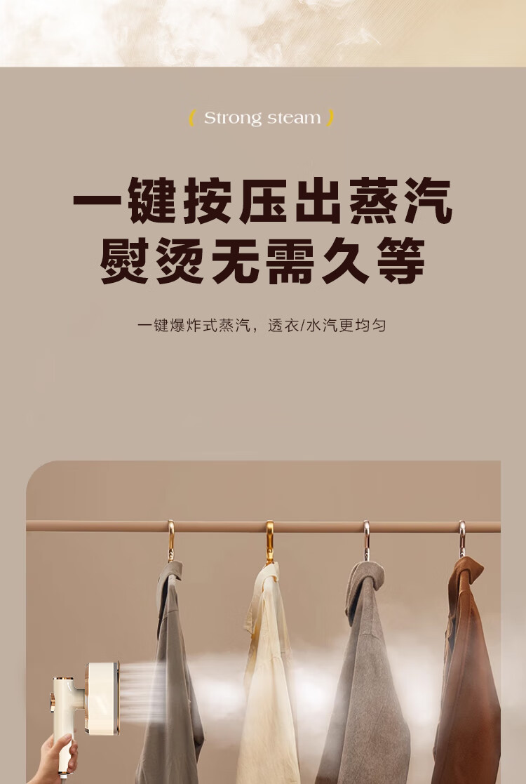 蒸汽开关,加热指示灯,可旋转手柄;平烫/挂烫两种模式熨烫,收纳携带都轻松;1000W大功率,高效除皱