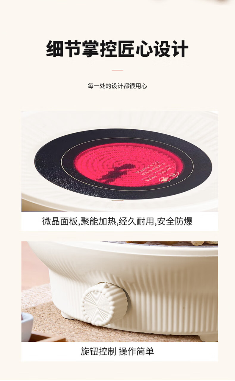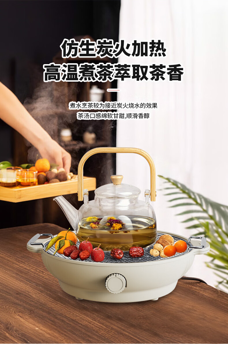 红外聚能,垂直加热,三档火力调节,控温更贴心;仿生炭火加热,高温煮茶萃取茶香;;微晶面板,聚能加热,经久耐用,安全防爆;