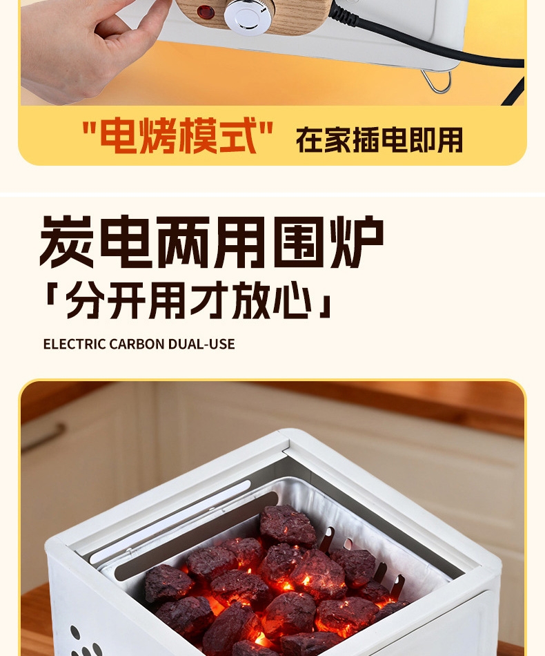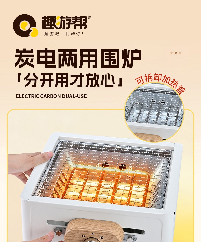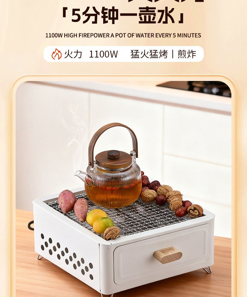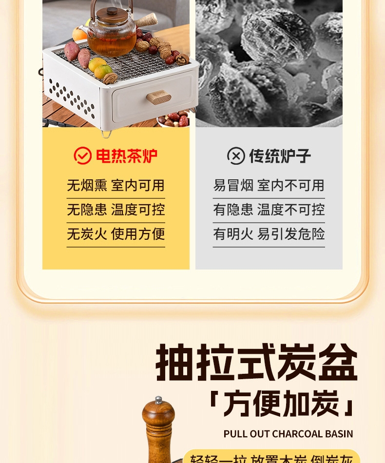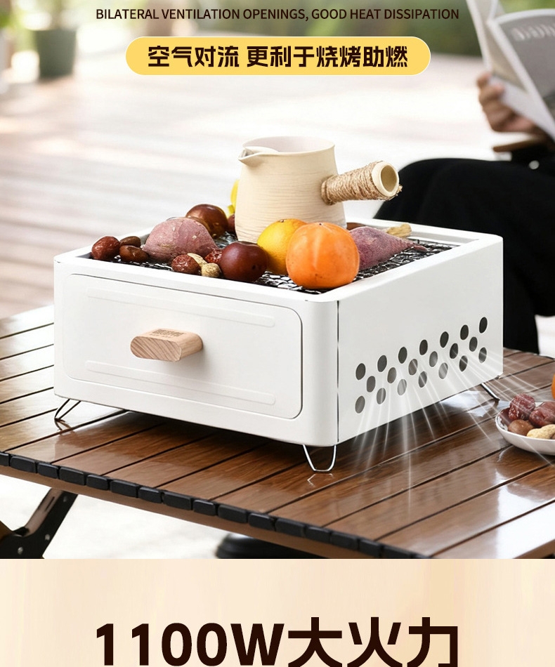 抽屉式烧烤炉,一推一拉,轻松加减炭;3C电器认证,品质放心质量可靠;炭电两用围炉,分开用安全放心;1100W大火力,猛火猛烤