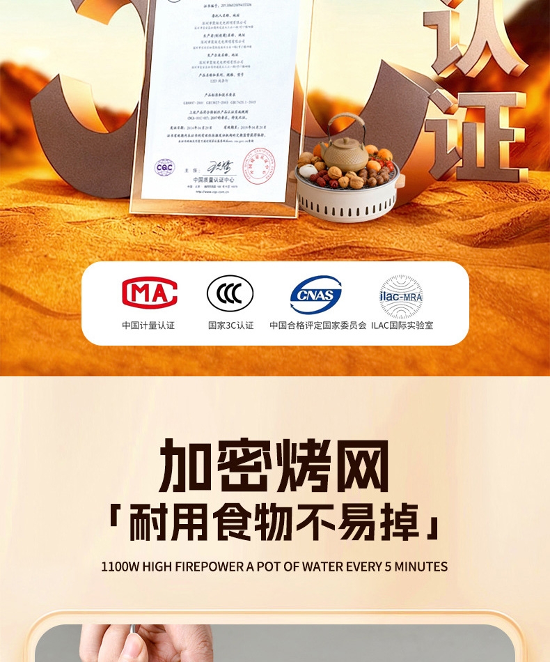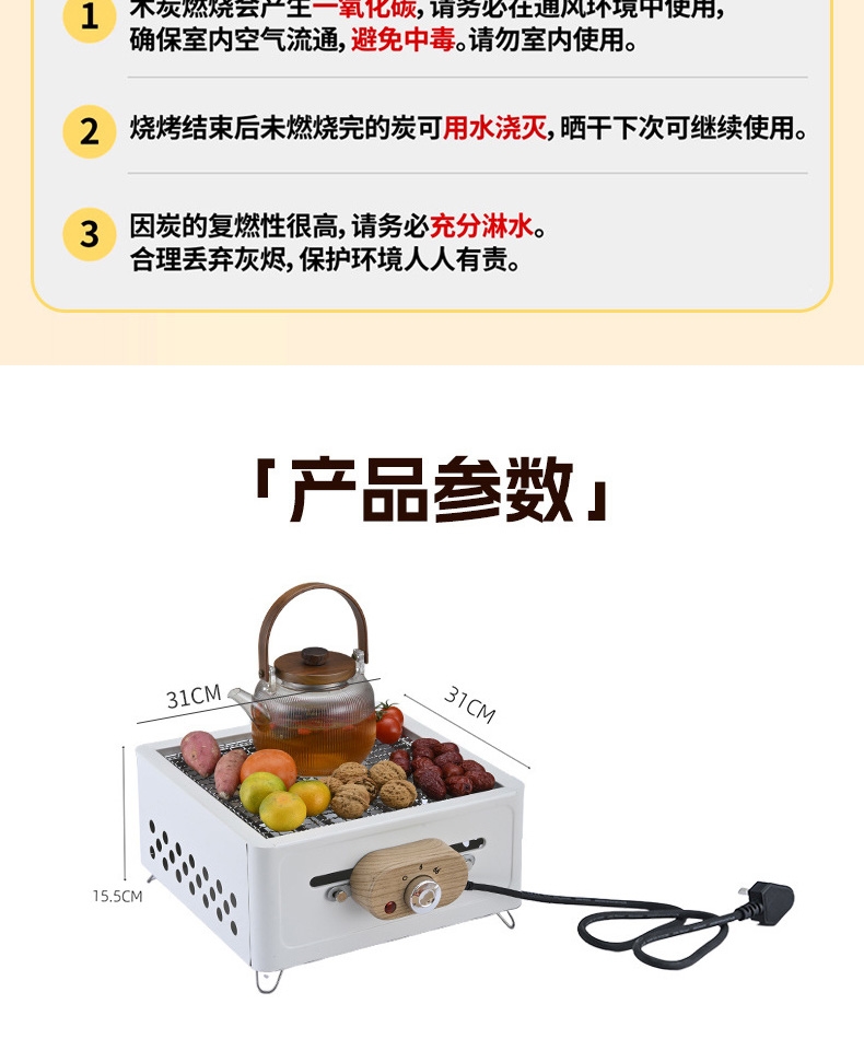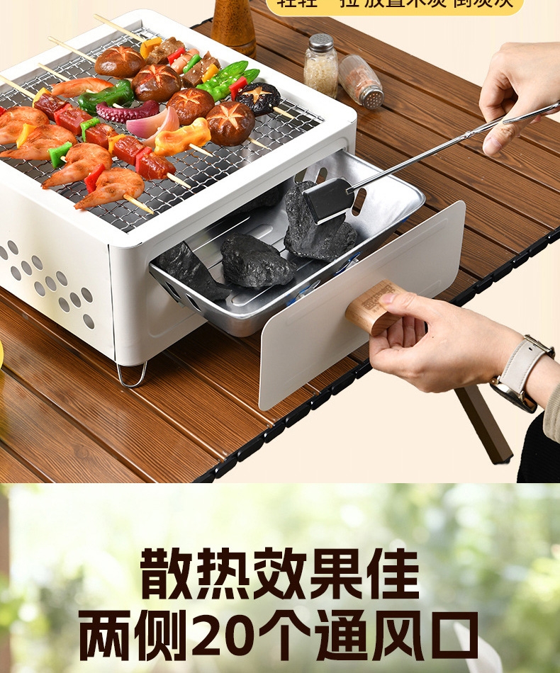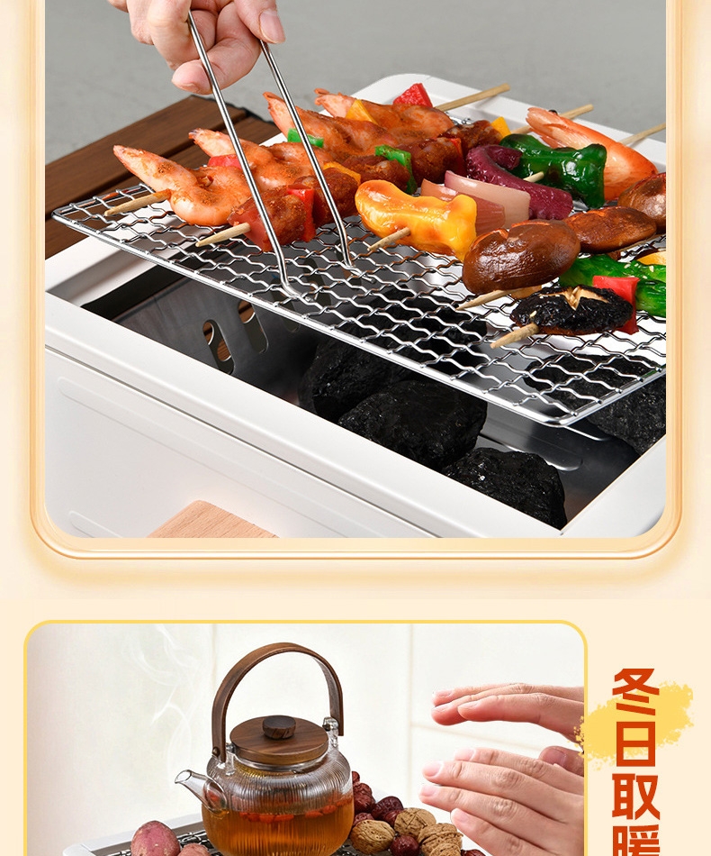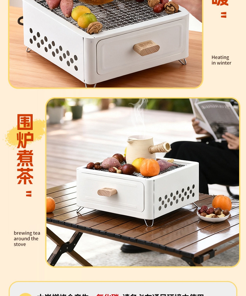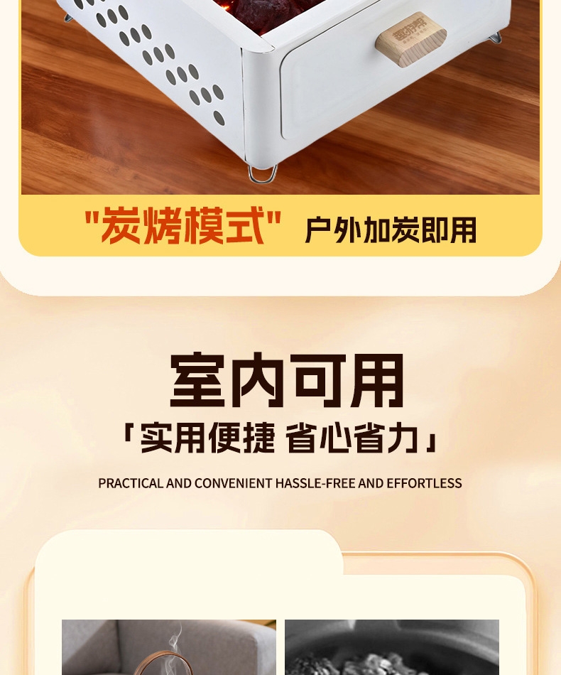 抽屉式烧烤炉,一推一拉,轻松加减炭;3C电器认证,品质放心质量可靠;炭电两用围炉,分开用安全放心;1100W大火力,猛火猛烤