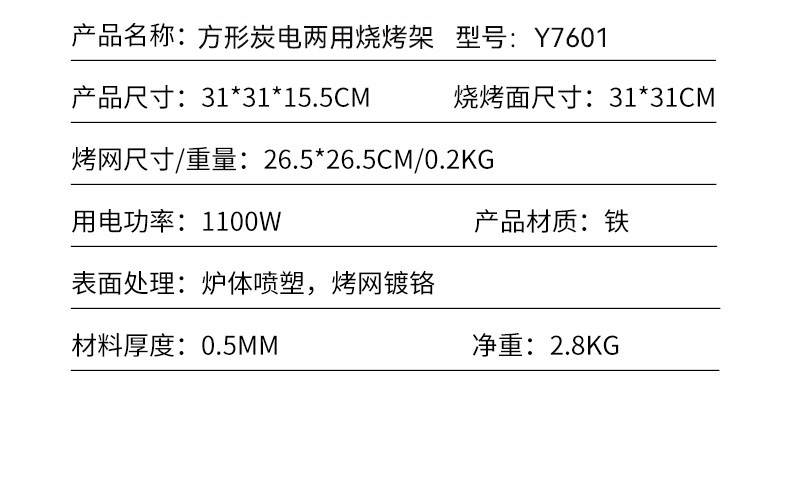 配置清单:材质 铁 颜色 海盐白 尺寸 31*31*15.5cm 烧烤面尺寸 31*31cm 重量 2.8KG 用电功率 1100W
