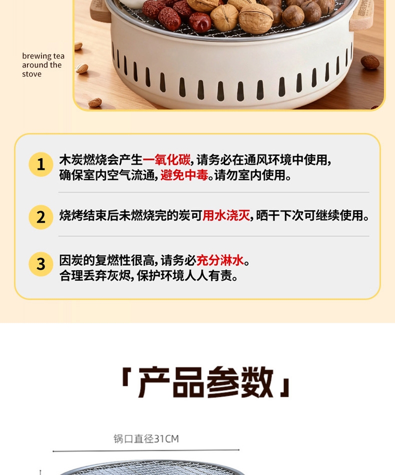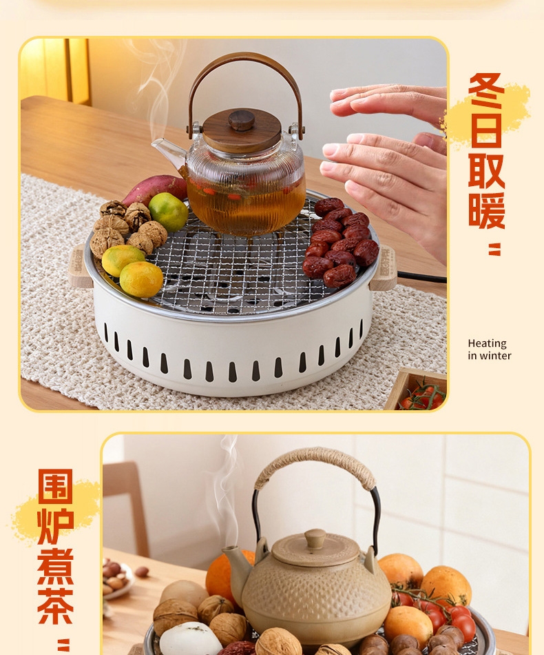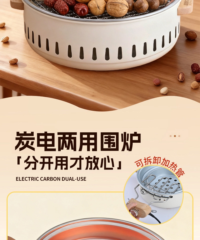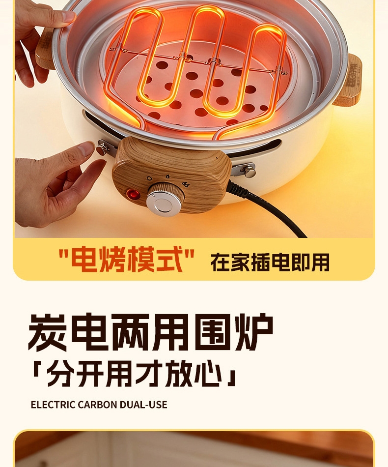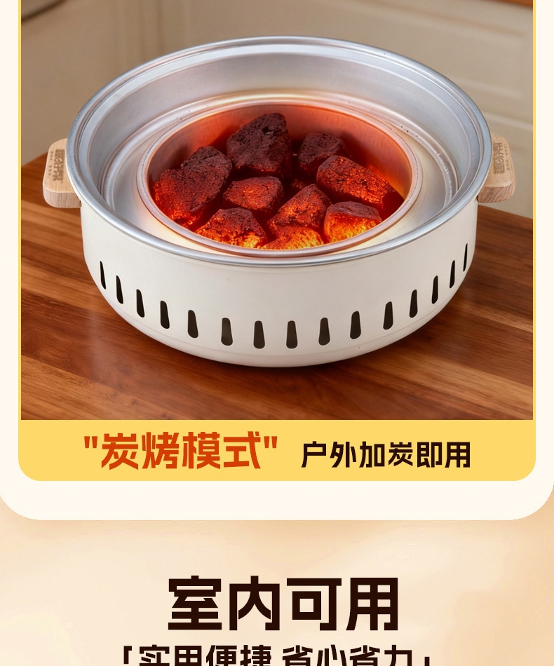 可炭电两用围炉,适用多种场景;水油分离炭盆,使用更加安全;3C电器认证,品质放心质量可靠