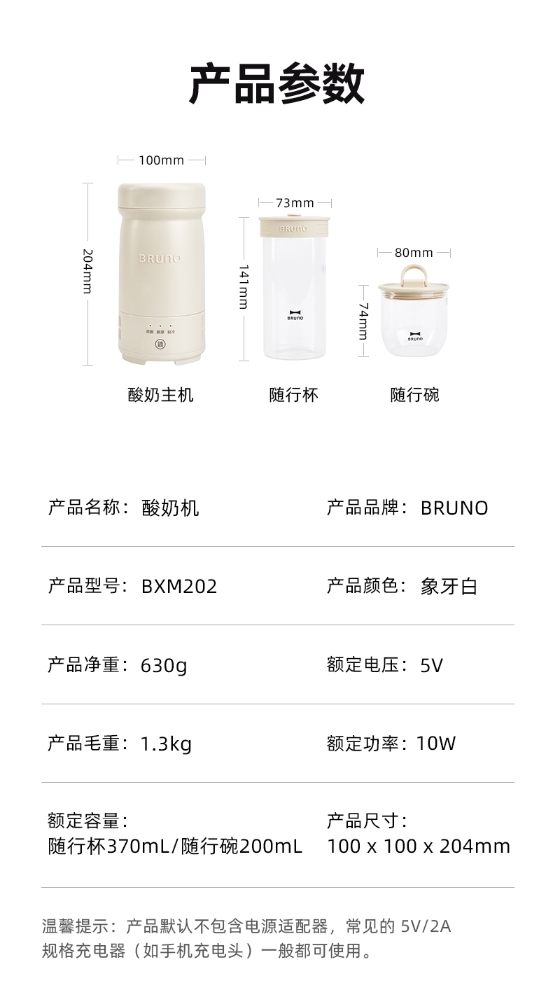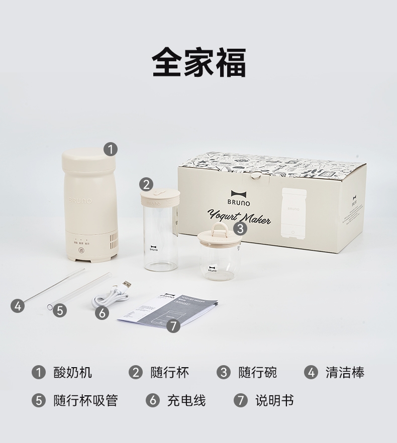配置清单:酸奶主机*1、随行杯*1、随行碗*1、清洁棒*1、随行杯吸管*1、充电线*1、说明书*1