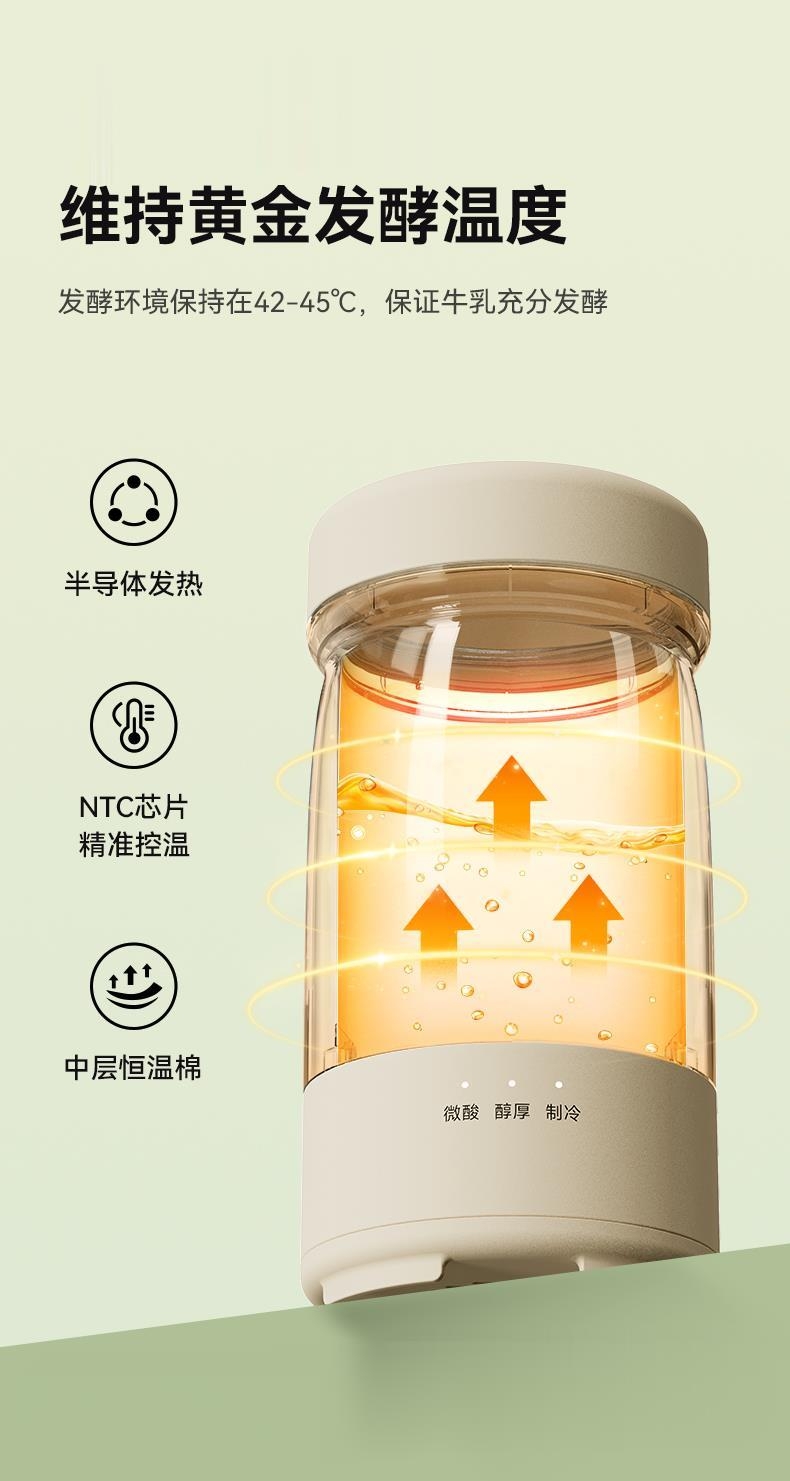 重量630g≈ 1瓶矿泉水 ,随行无负担;专业发酵系统:内有NTC智能控温芯片实时控温 ;发酵后即时开启冷藏 ,凝固酸奶锁住鲜活力